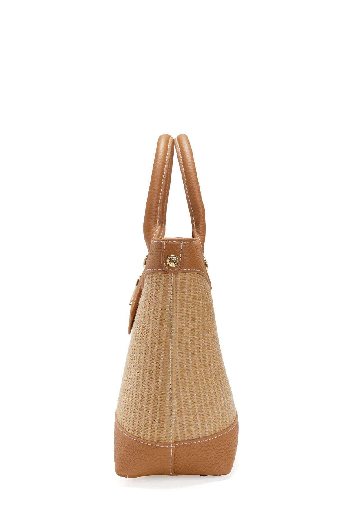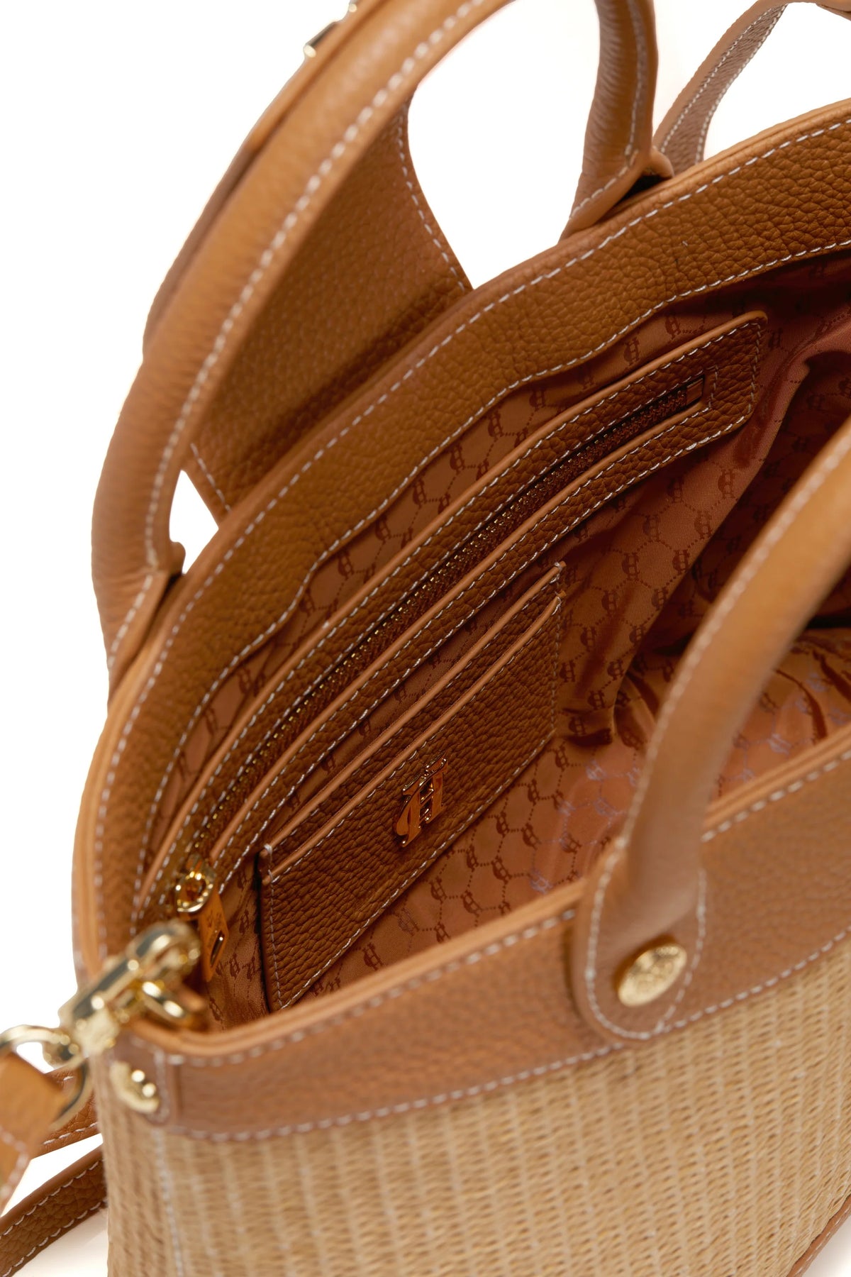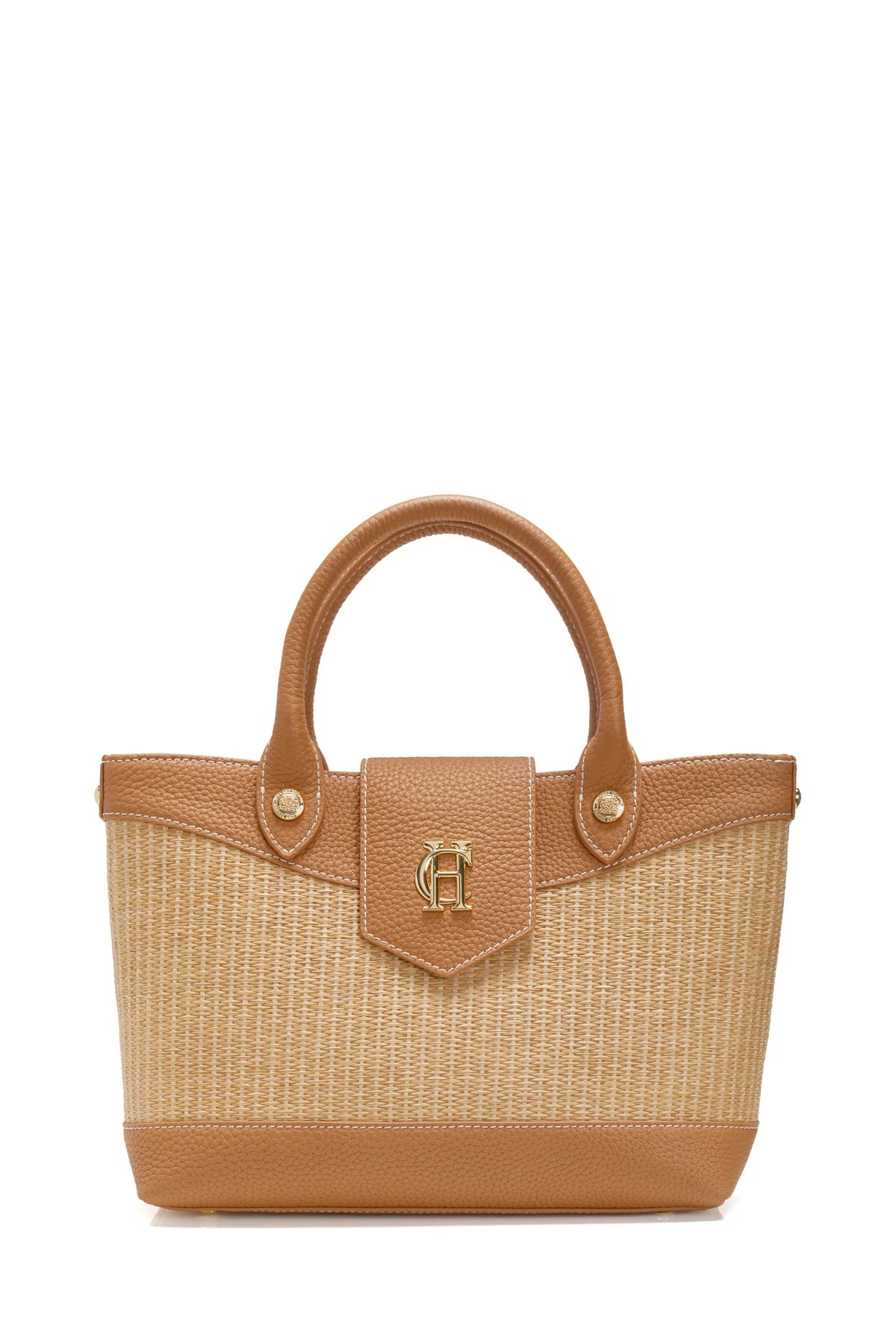 Holland Cooper Valencia Mini Tote Bag in Tan. Tote bag by Holland Cooper. Woven style tote bag with a carrier handle as well as a detachable shoulder strap. Zip fastening to the top with a zip pocket to the inside. Leather trims reinforce the bag. Finished with gold HC branding sat upon a magnetic fold over flap to the front.