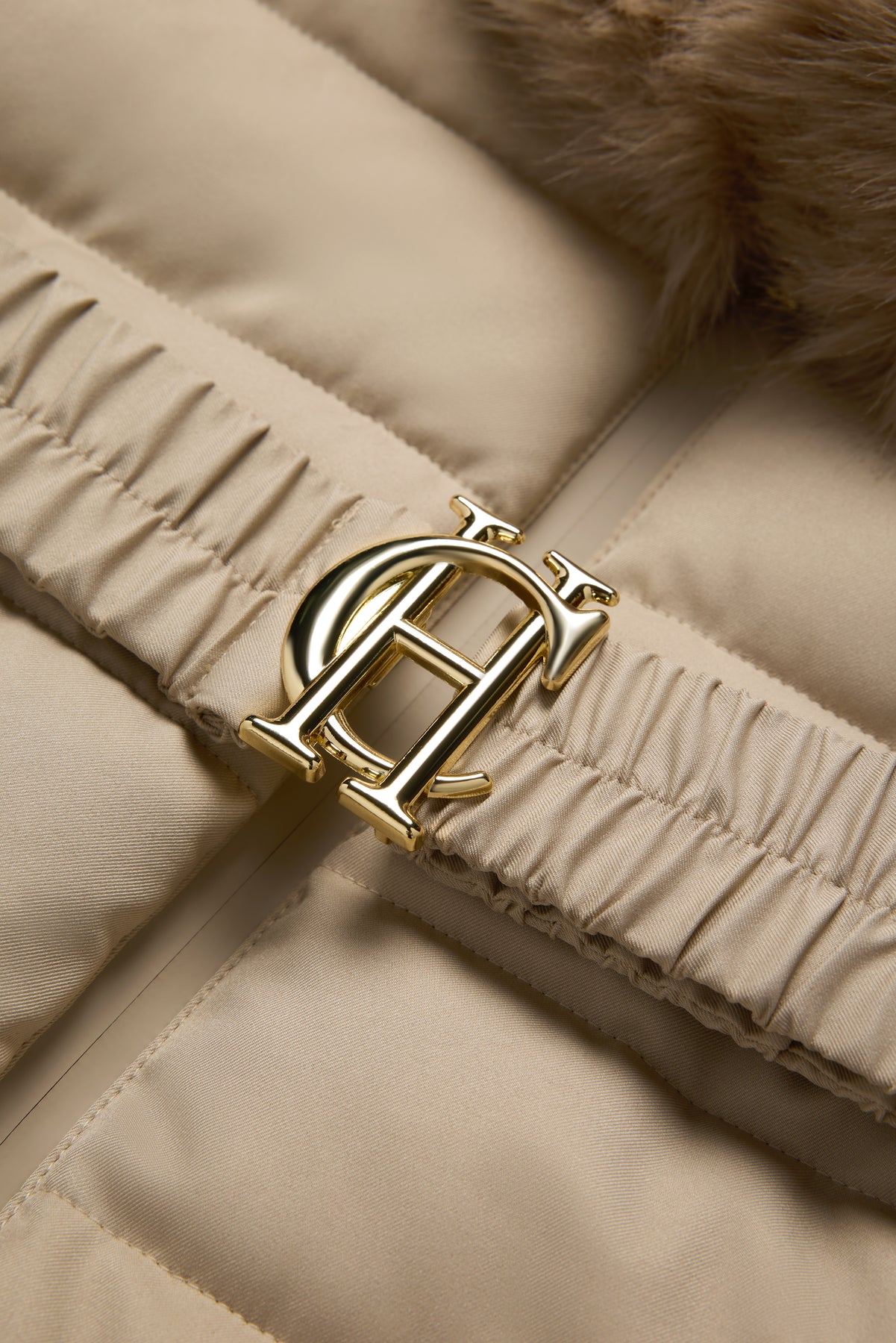 Holland Cooper Vostock Coat in Stone. A timeless outerwear piece that blends luxury with practicality, the Holland Cooper Vostock Coat in Stone offers refined warmth for the colder months. Crafted in a mid-length quilted design, it features removable faux fur trims to the collar and cuffs, allowing you to switch between an elegant statement look and a clean, understated style.