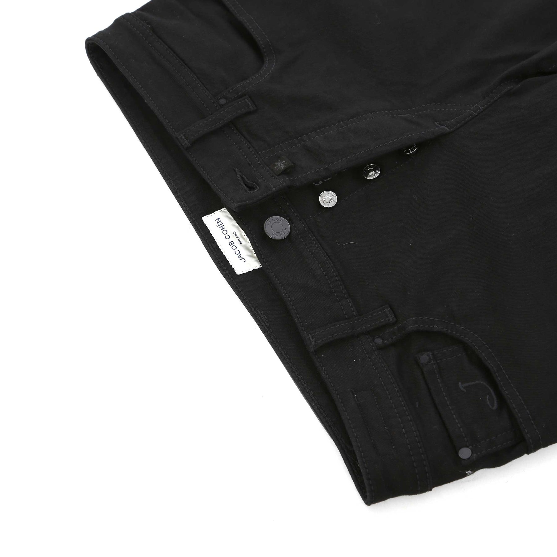 Jacob Cohen Bard Black Badge Jean in Black. A high quality jean by Jacob Cohen. They feature a 5 pocket jean style and a tonal leather Jacob Cohen logo badge. Button fly fastening with embroidered detailing. The jean is treated using extraordinary techniques creating vintage looks by means of abrasion, washing, embroidery all preformed in-house by hand.