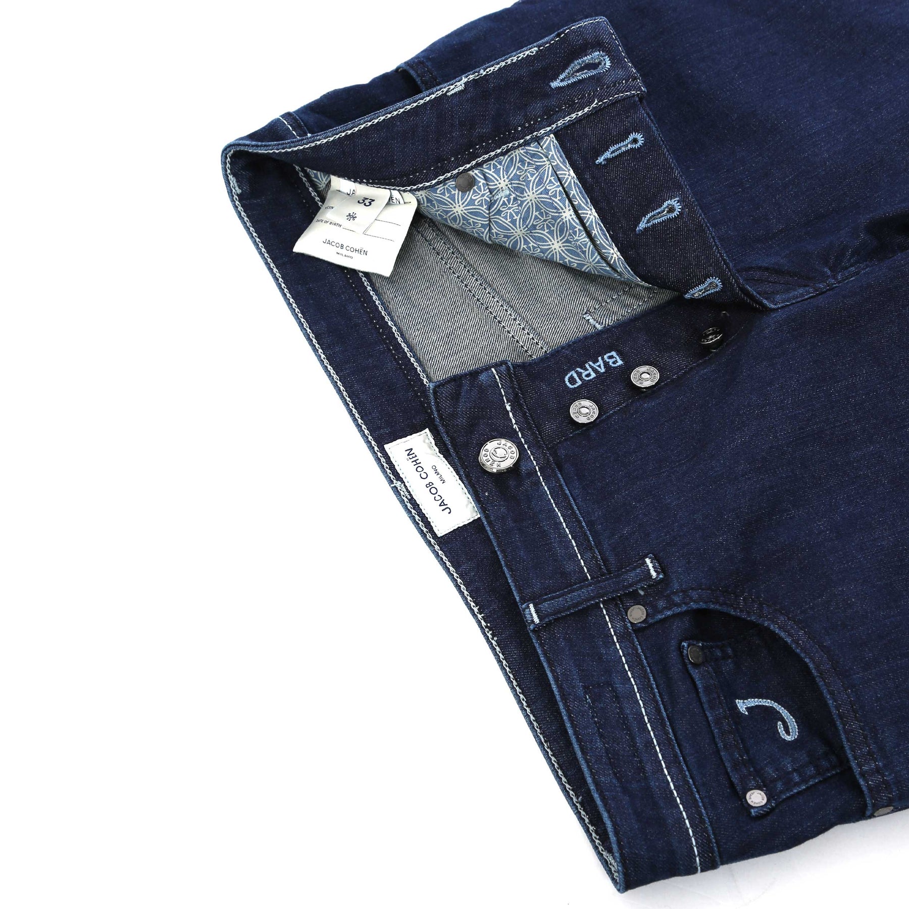Jacob Cohen Bard Duck Egg Blue Badge Jean in Dark Blue Denim. A high quality jean by Jacob Cohen. They feature a 5 pocket jean style and a duck egg blue Jacob Cohen phorse hair logo badge. Button fly fastening with embroidered detailing. The jean is treated using extraordinary techniques creating vintage looks by means of abrasion, washing, embroidery all preformed in-house by hand.