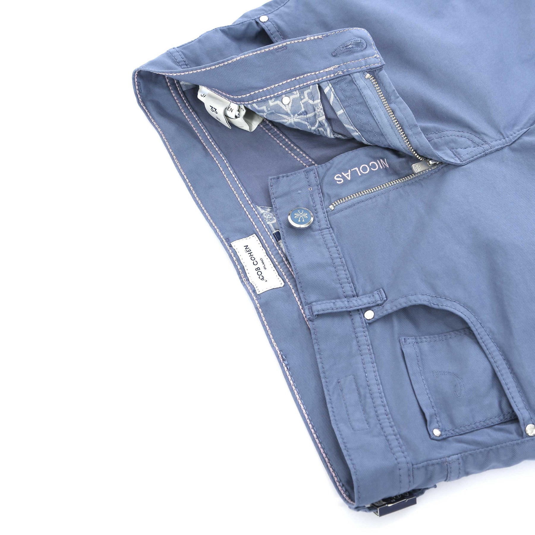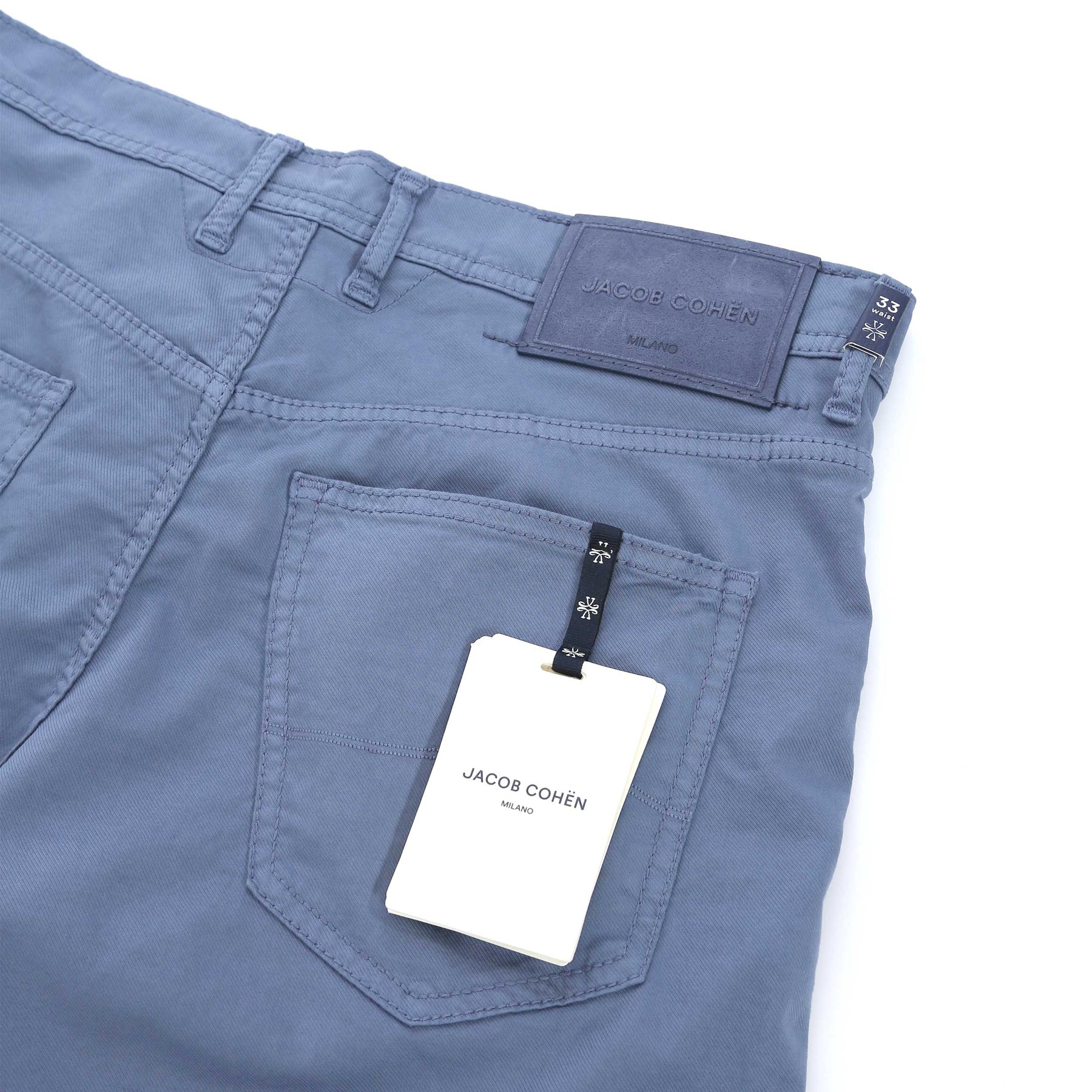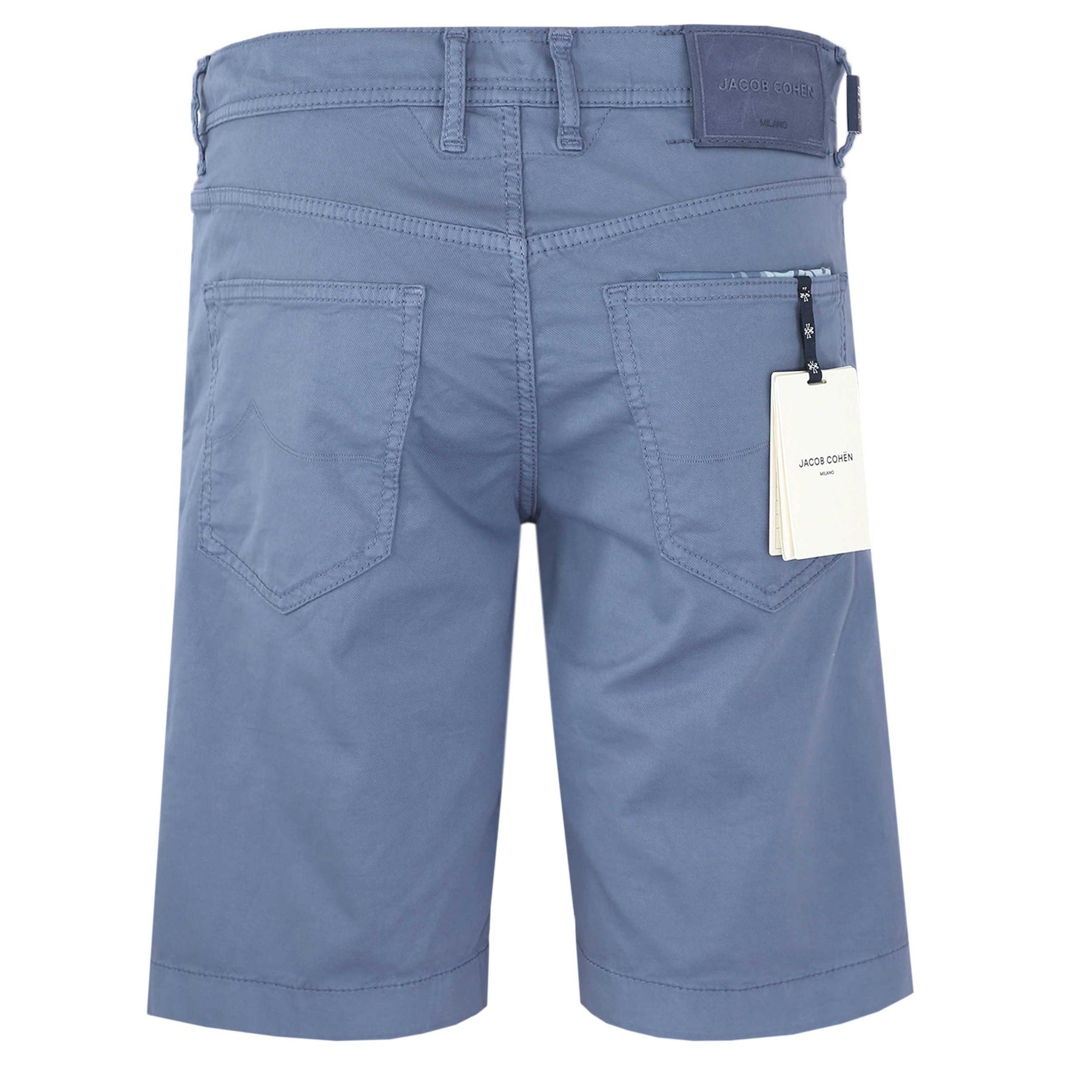Jacob Cohen Nicholas Short in Ice Blue. A high quality, cotton blend short by Jacob Cohen. They feature a 5 pocket jean style and a Jacob Cohen brand badge to the rear. Button and fly zip fastening. Tonal grained leather logo badge to the waistband.