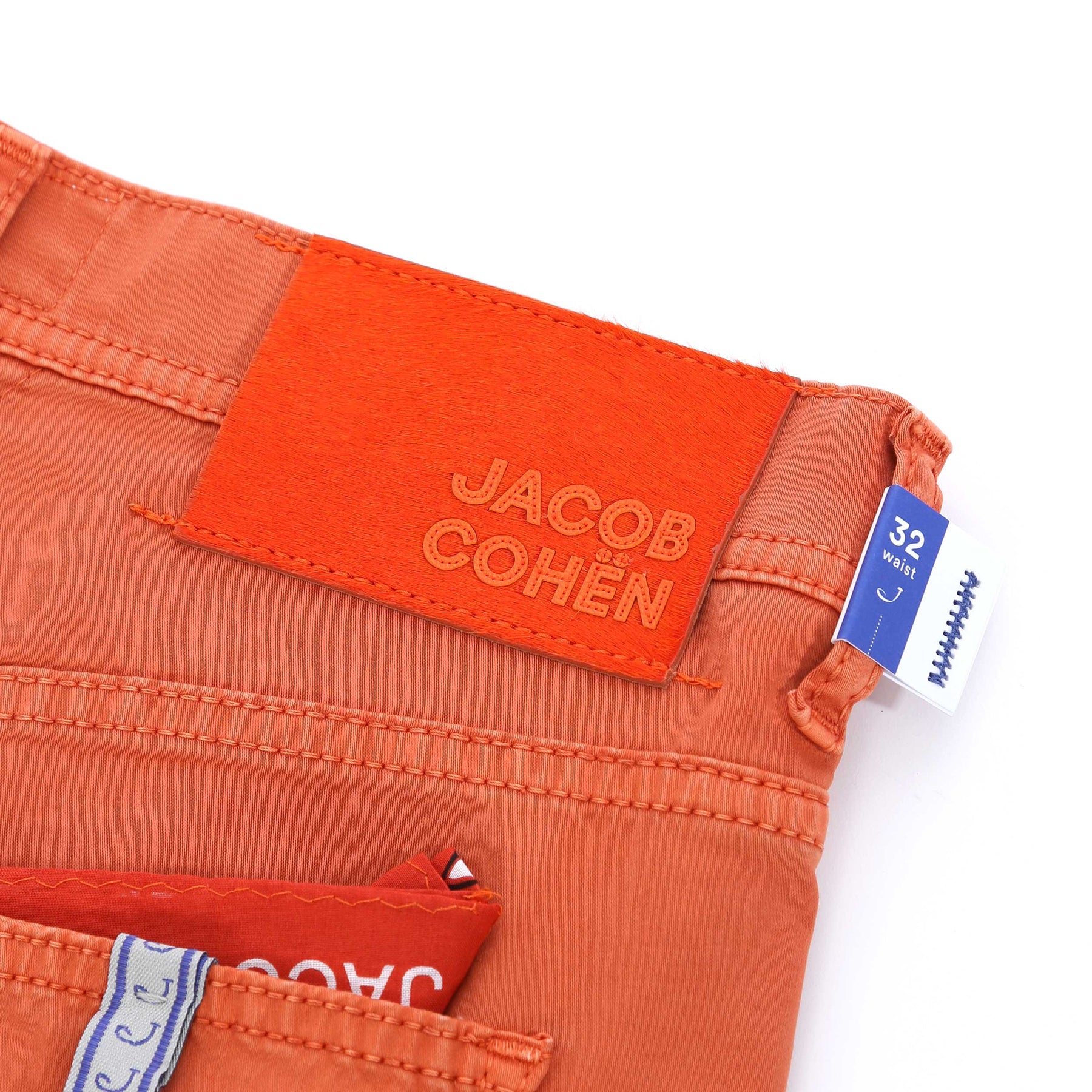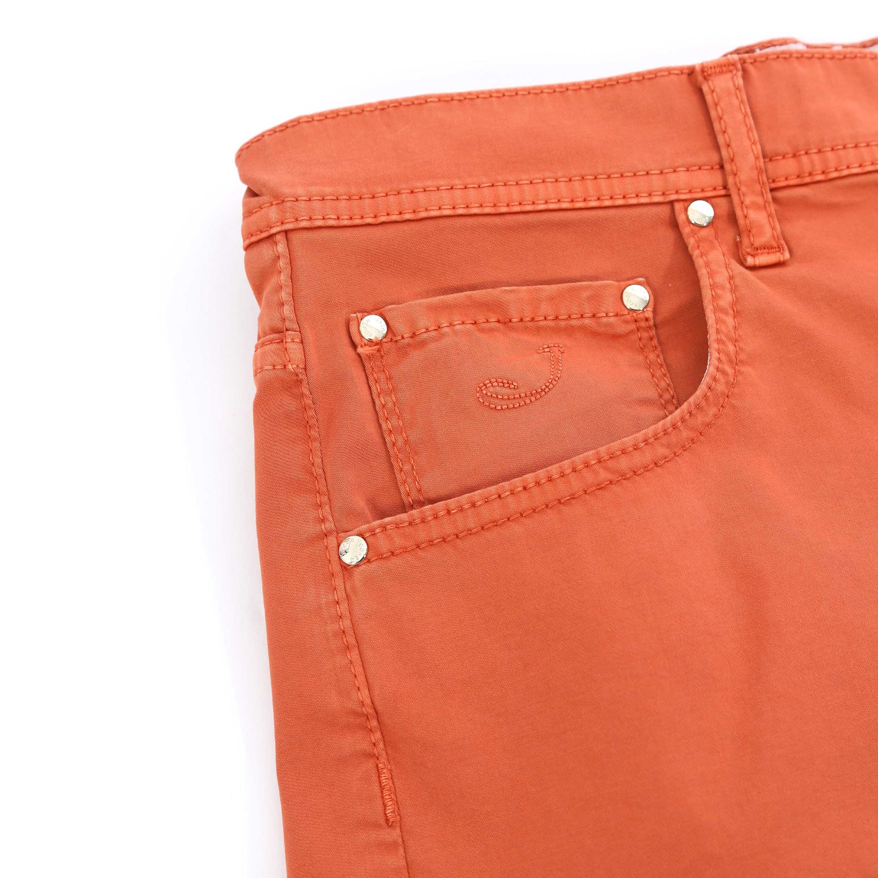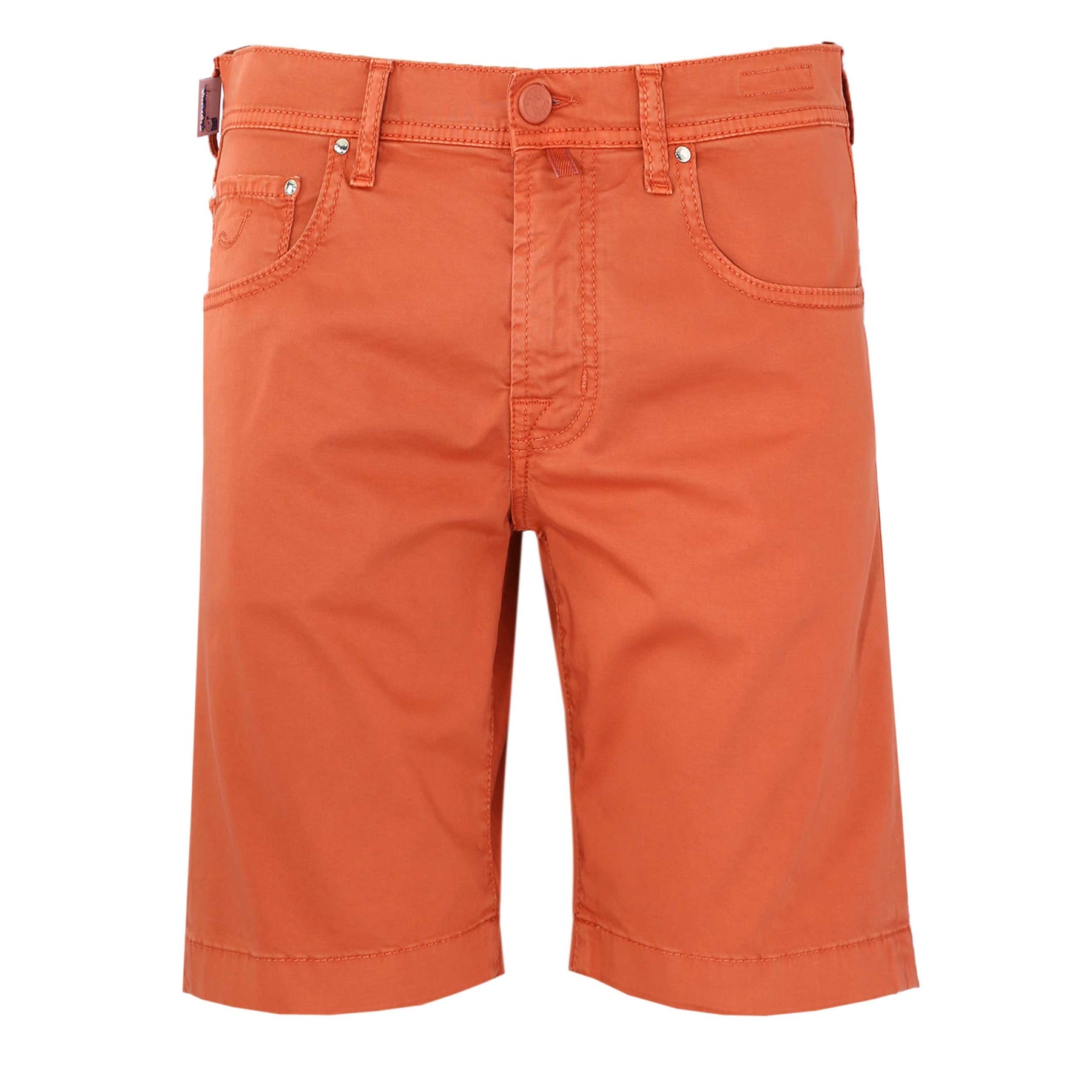 Jacob Cohen Nicholas Short in Orange. A high quality, cotton blend short by Jacob Cohen. They feature a 5 pocket jean style and a Jacob Cohen brand badge to the rear. Button and fly zip fastening. Tonal orange horse hair logo badge to the waistband.