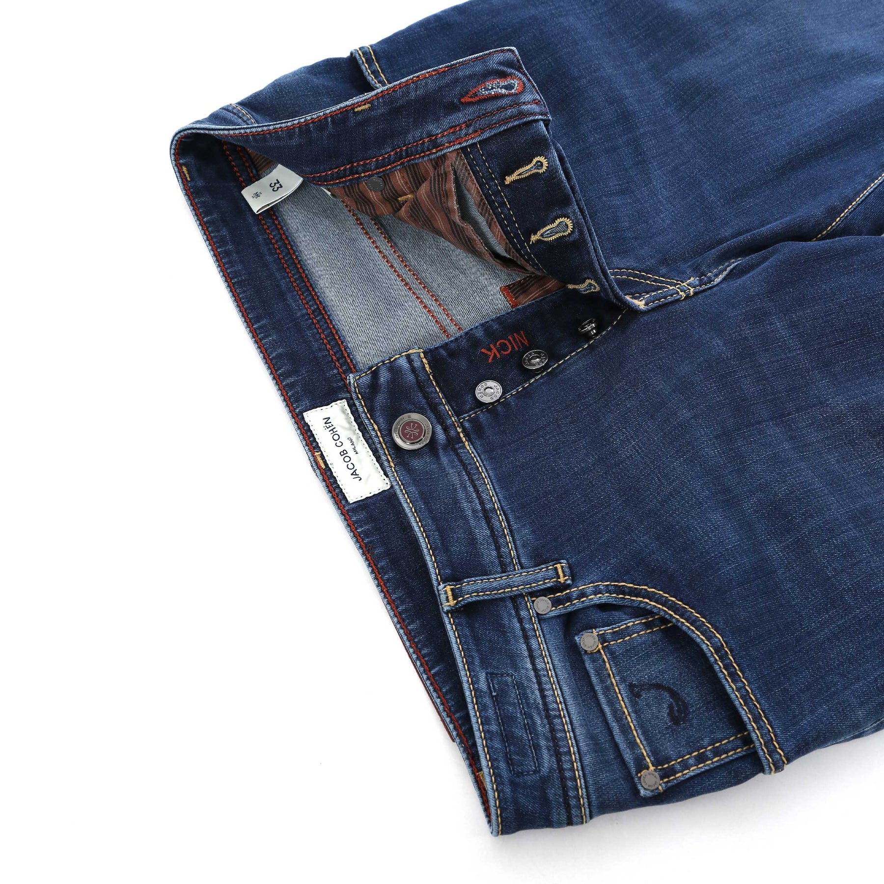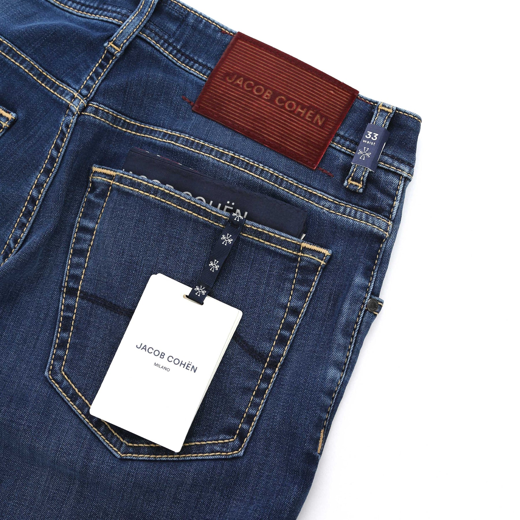 Jacob Cohen Nick Burgundy Badge Jean in Mid Blue Denim. A high quality jean by Jacob Cohen. A 5 pocket jean style, featuring a button fly fastening with branded button detailing. A premium jean with a hand finish. Finished with a burgundy horse hair Jacob Cohen badge on the rear.