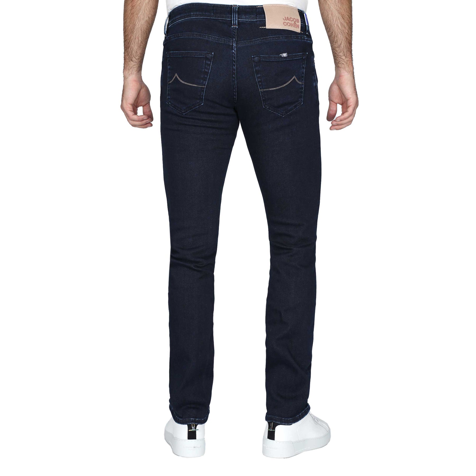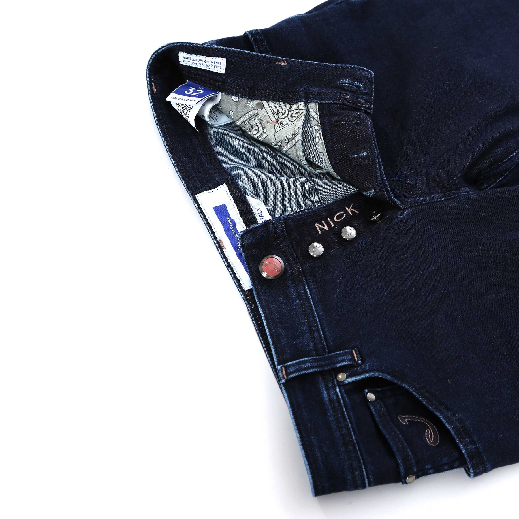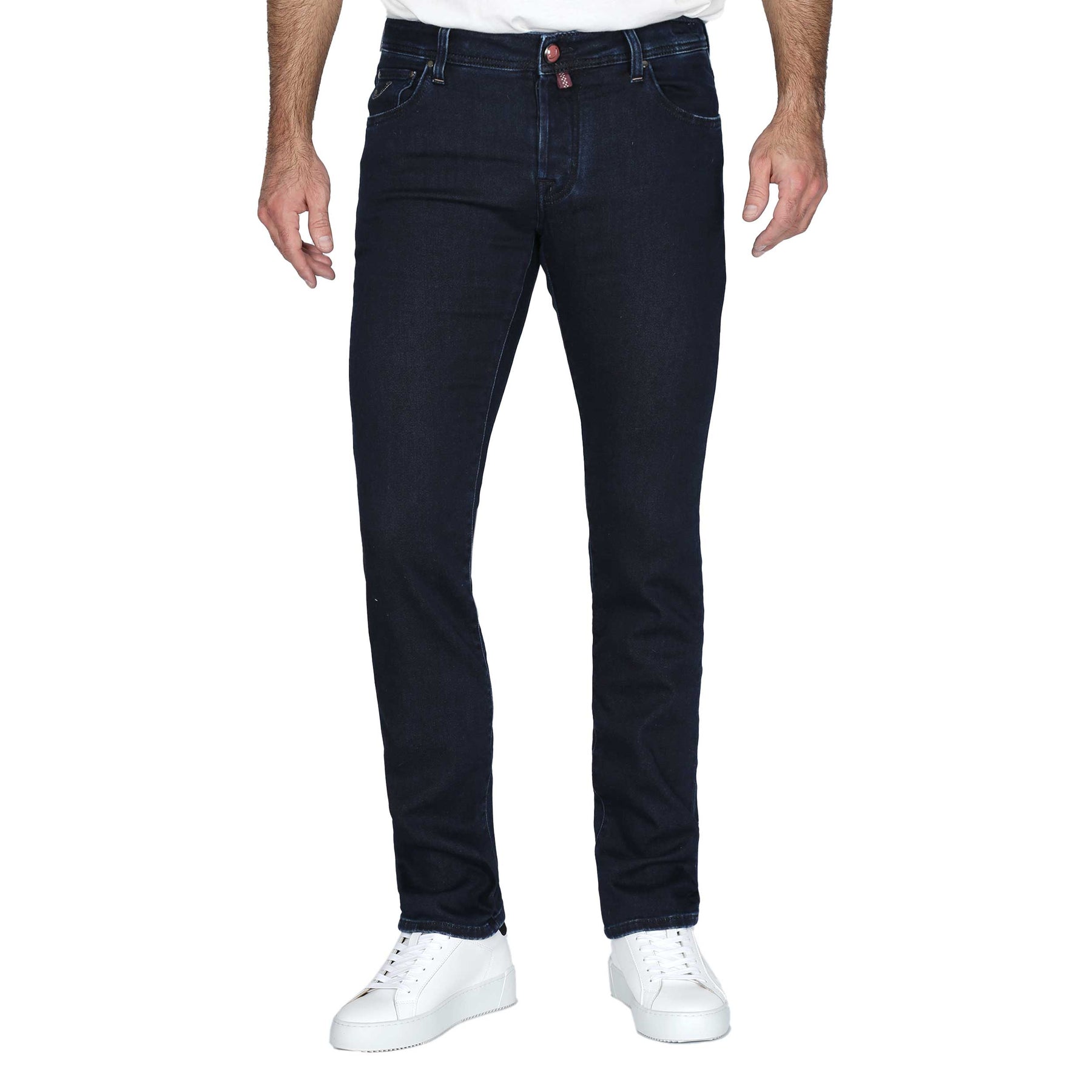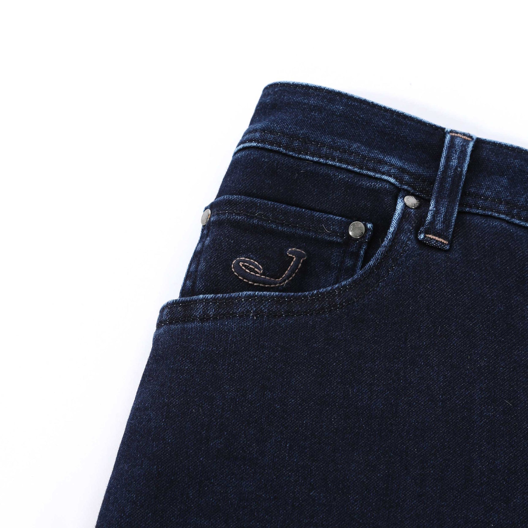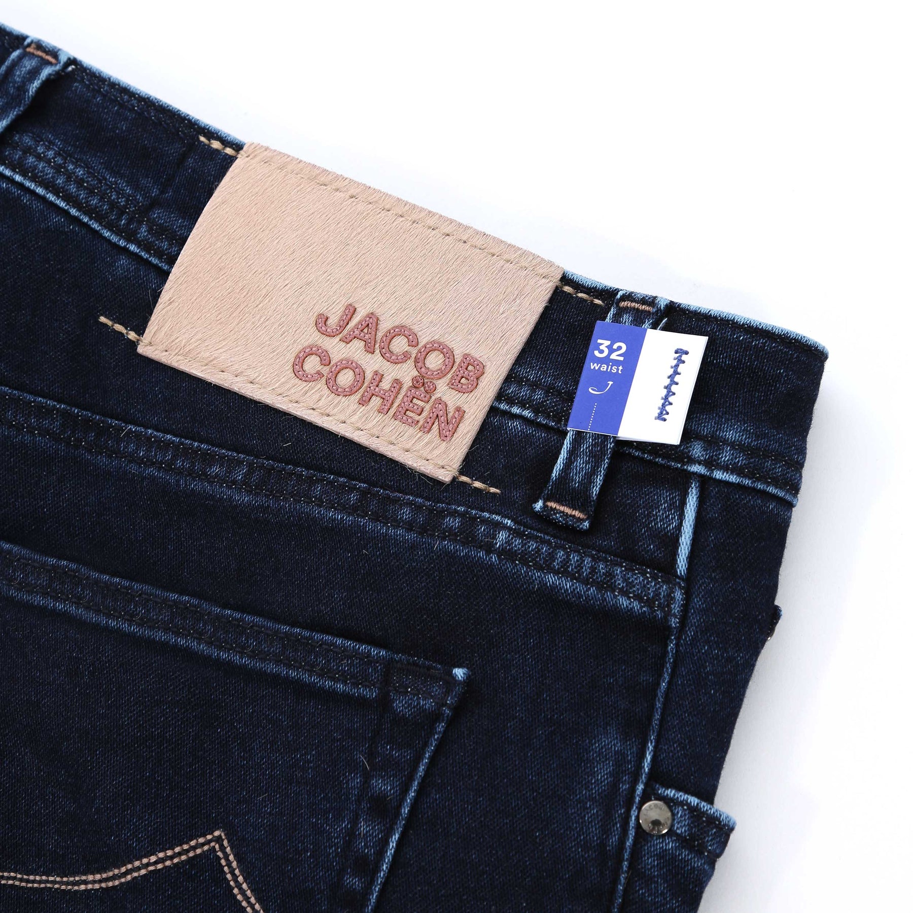 Jacob Cohen Nick Jean in Dark Denim. A high quality jean by Jacob Cohen. A 5 pocket jean style, featuring a button and zip fly fastening with branded button detailing. A dark blue, hand sanded denim. Finished with a beige horse hair Jacob Cohen badge on the rear.