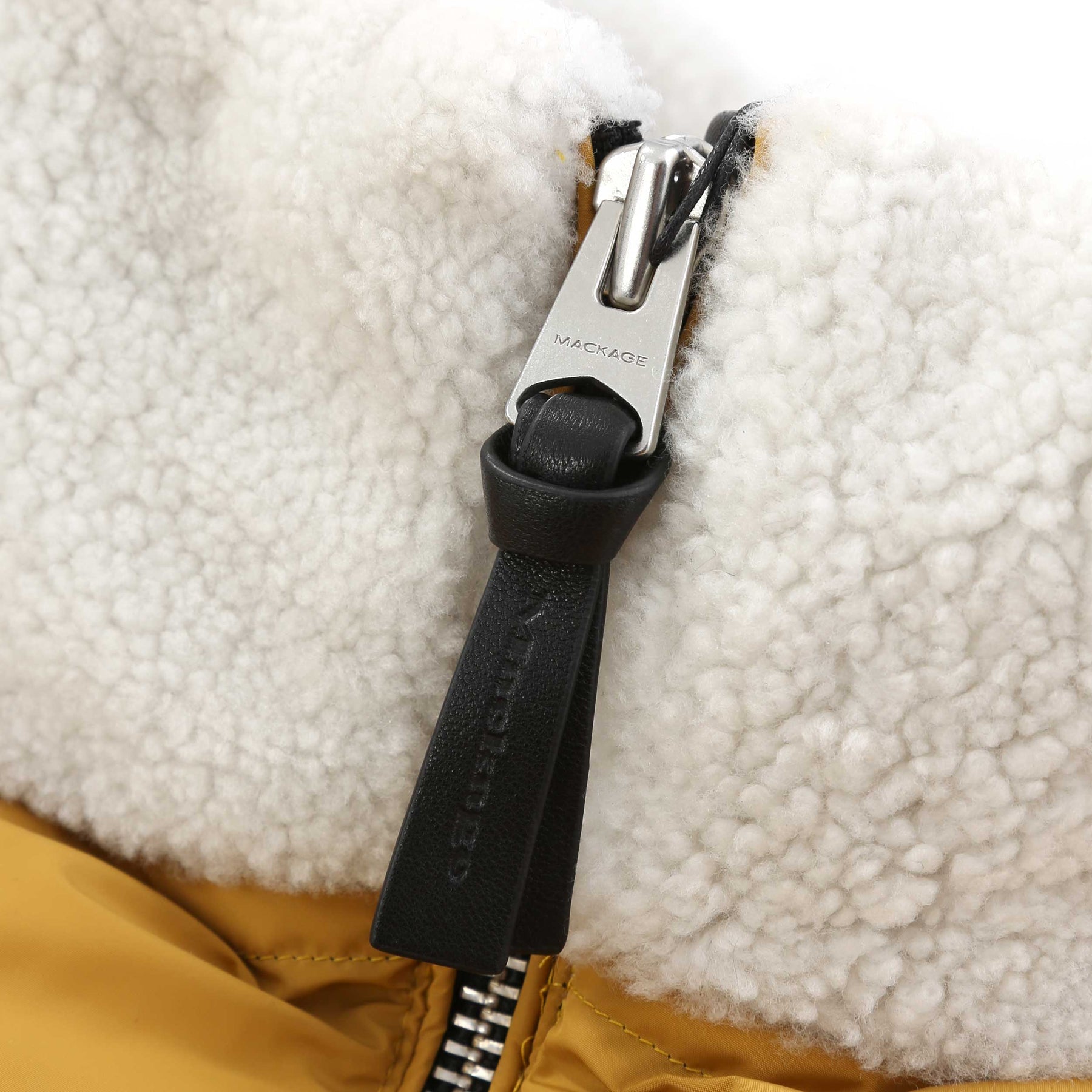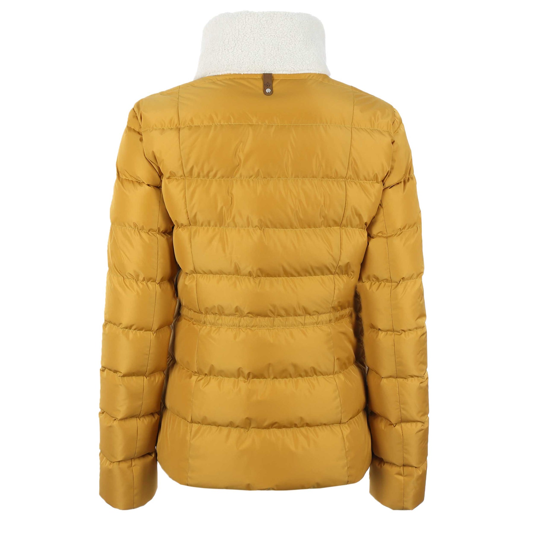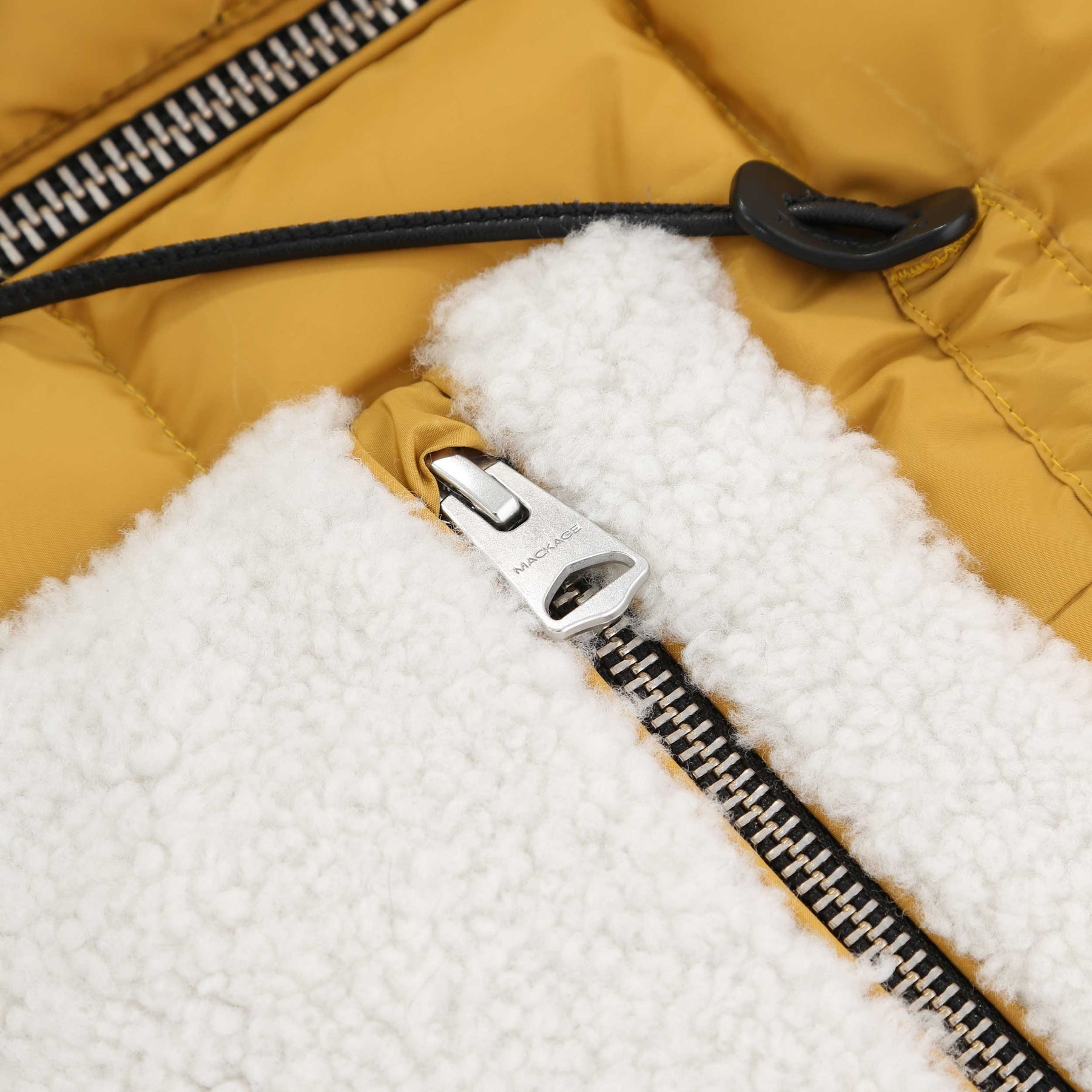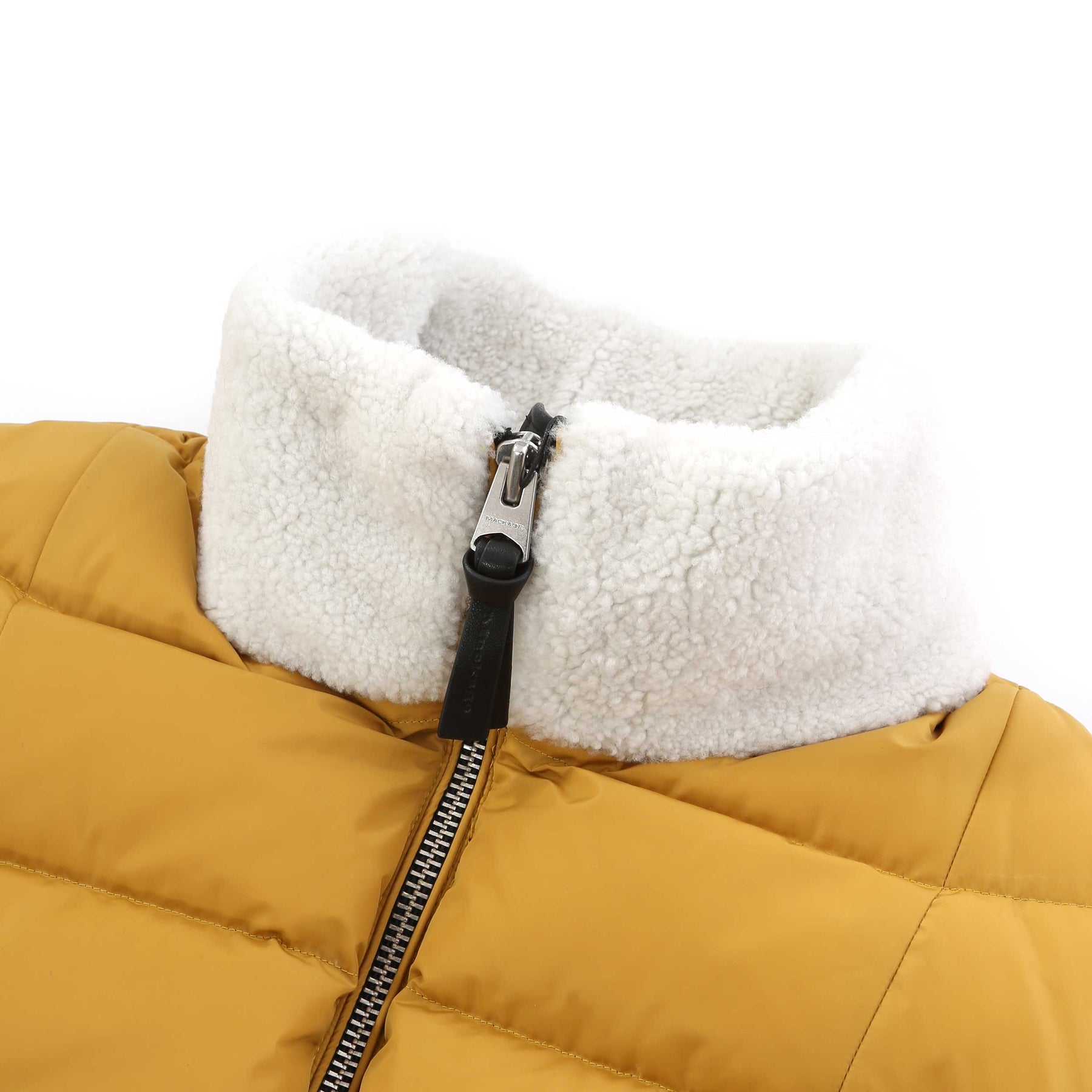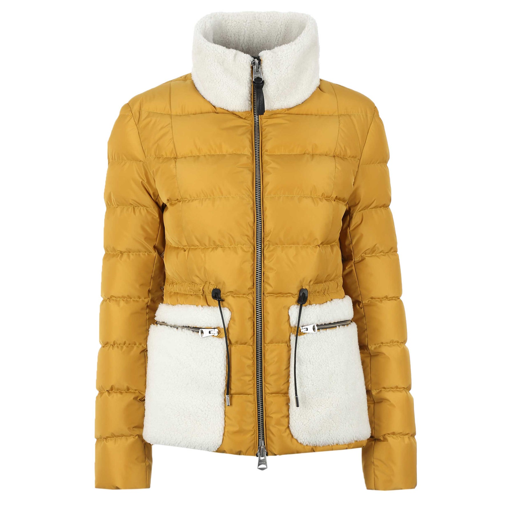 Mackage Elise Ladies Jacket in Gold. The elise jacket arrives with a quilted down filled body. Stand collar to the jacket with a full zip fastening placket. Contrasting shearling stand collar and front pockets. Bungee crod drawstring tothe waist. Zip fastening front pockets.