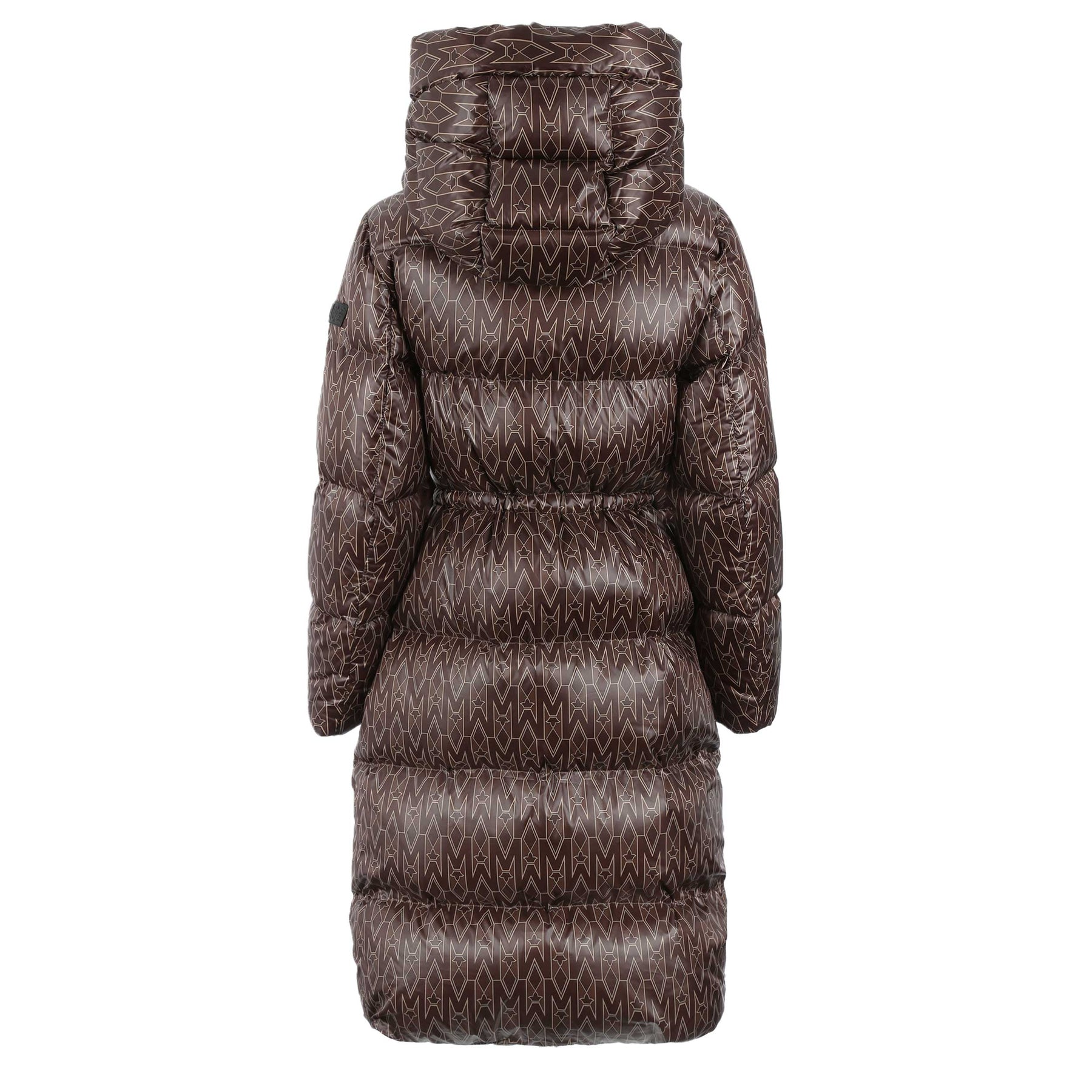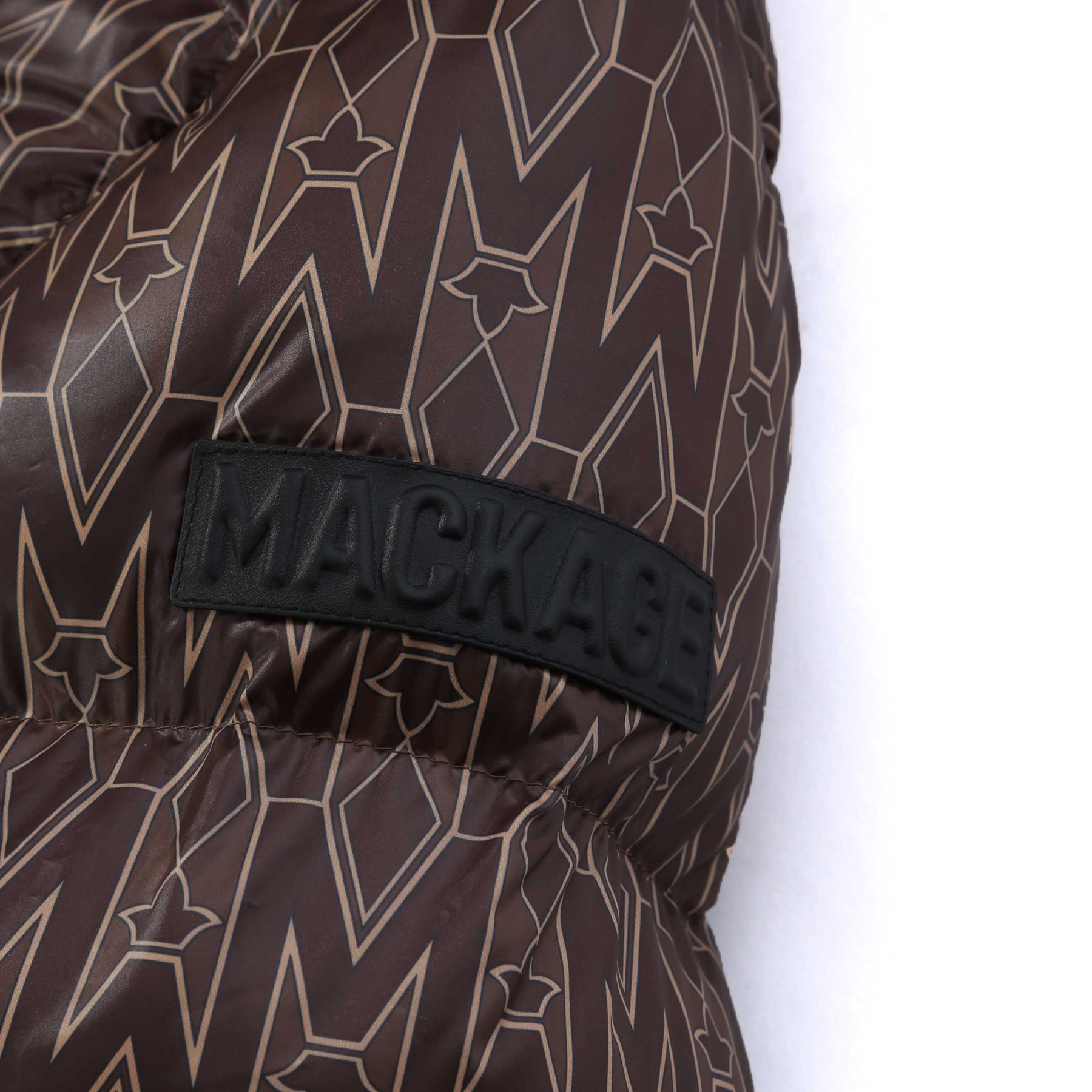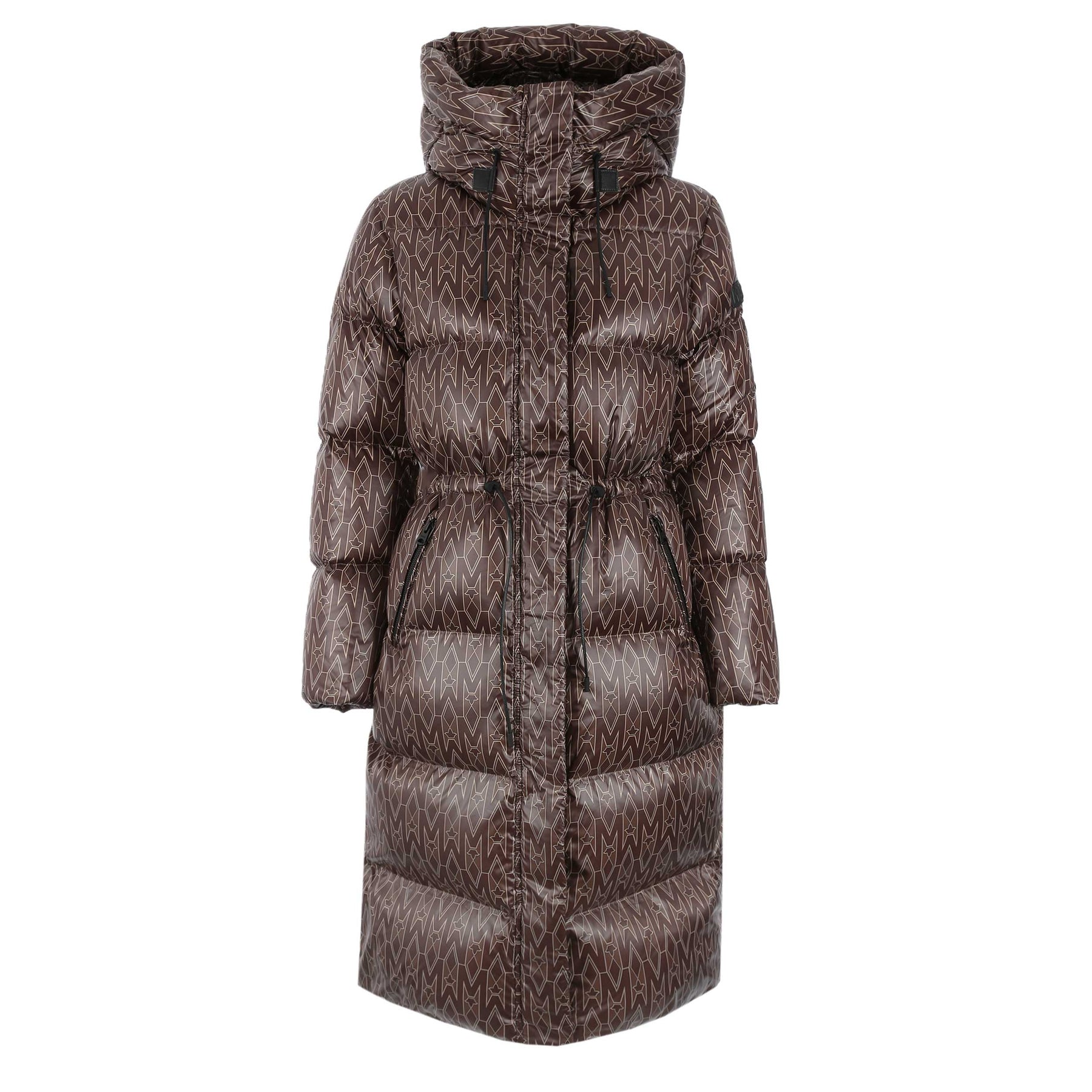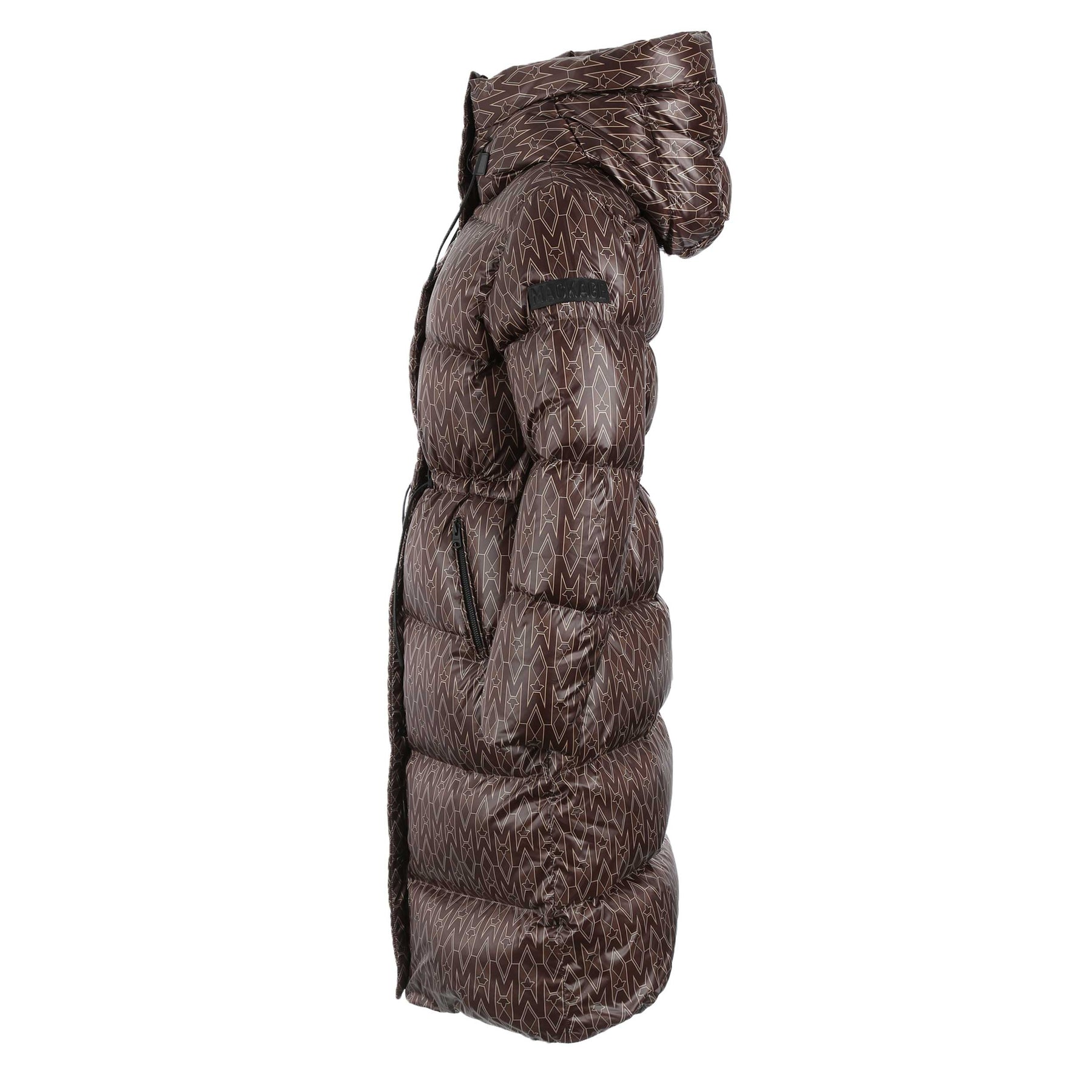 Mackage Ishani Ladies Jacket in Coffee. Mackage Ishani jacket constructed to a long quilted parka style. All over Mackage logo print tothe jacket. Adjustable drawstring hood. Full zip down jacket with a Mackage logo badge to the sleeve. Two front zip fastening pockets with fleece lining.