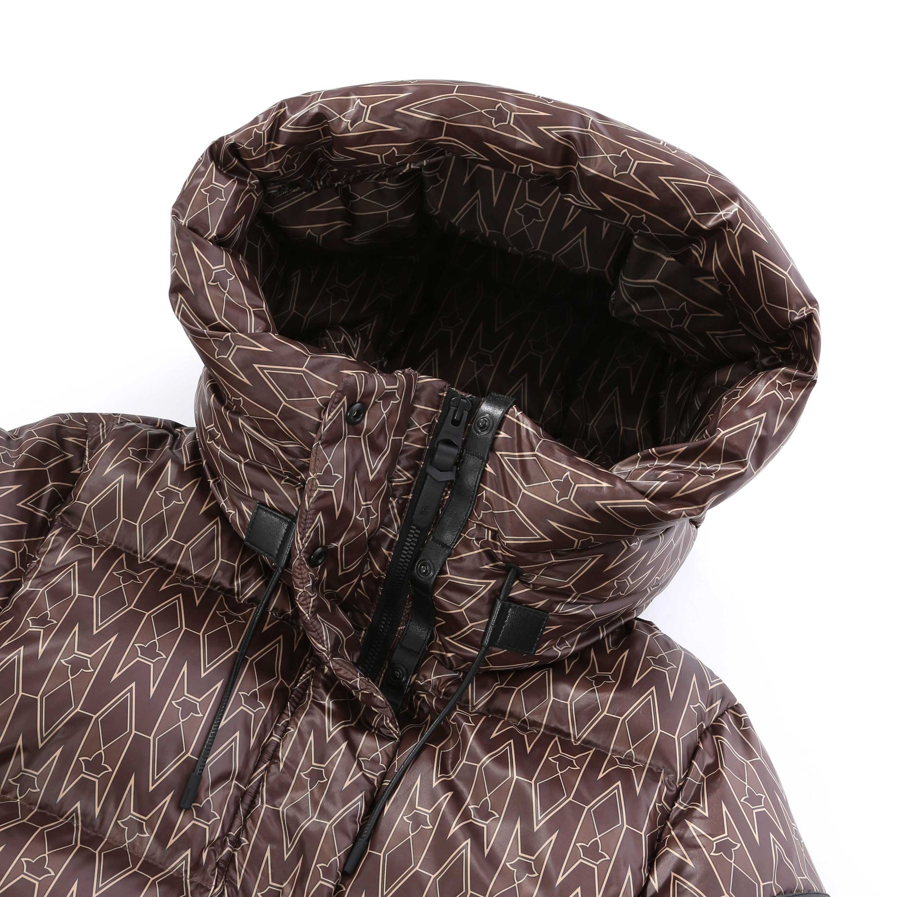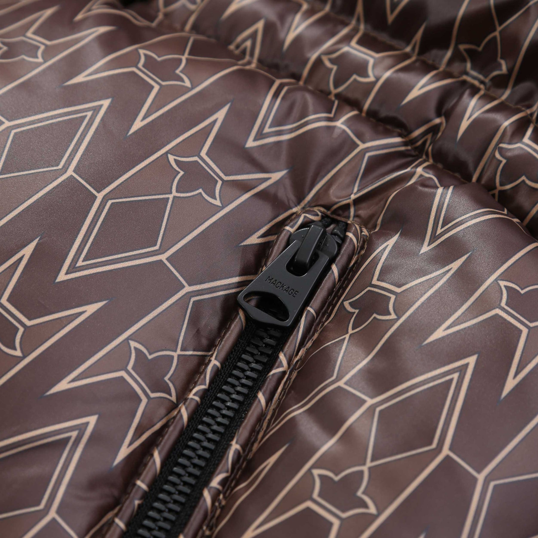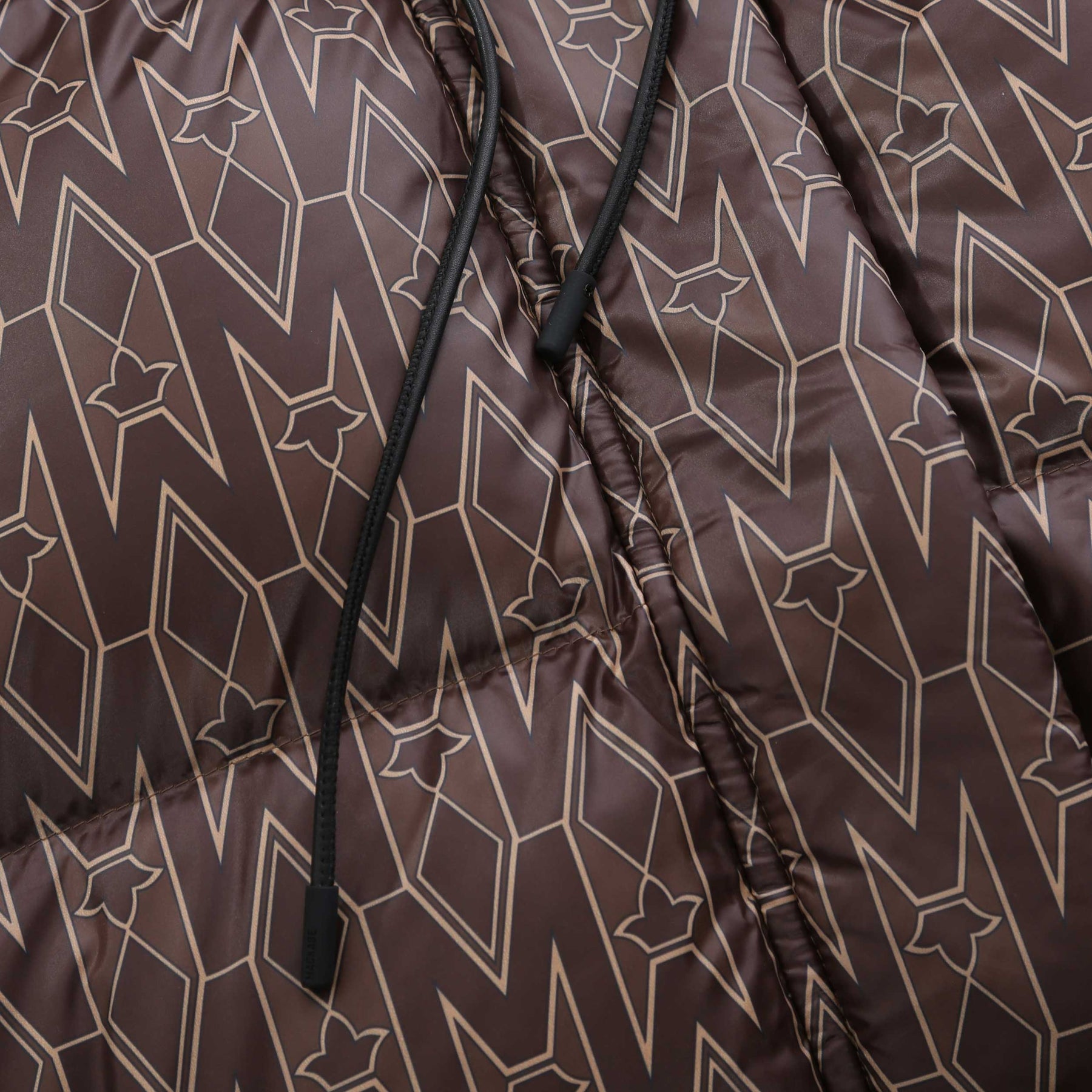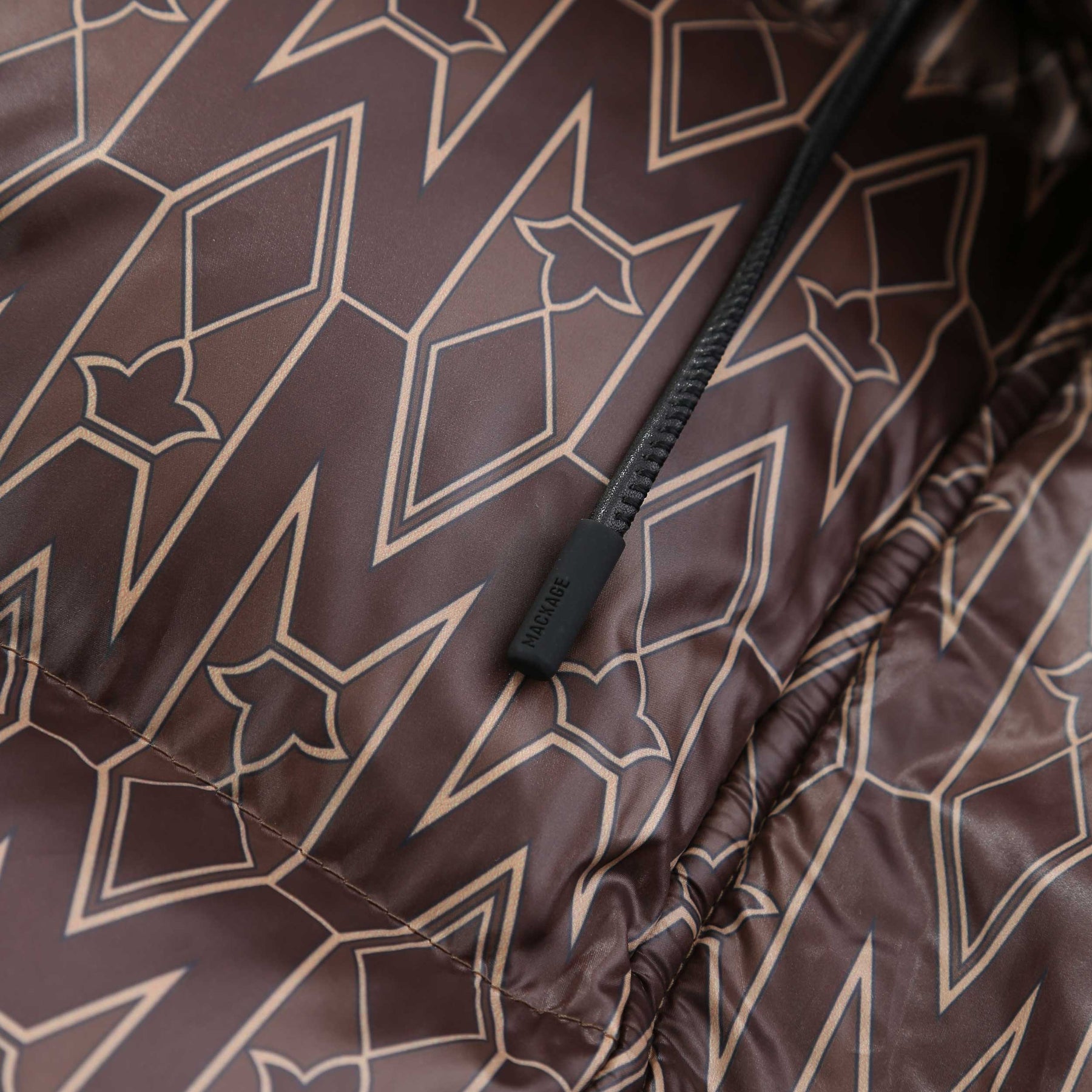 Mackage Ishani Ladies Jacket in Coffee. Mackage Ishani jacket constructed to a long quilted parka style. All over Mackage logo print tothe jacket. Adjustable drawstring hood. Full zip down jacket with a Mackage logo badge to the sleeve. Two front zip fastening pockets with fleece lining.
