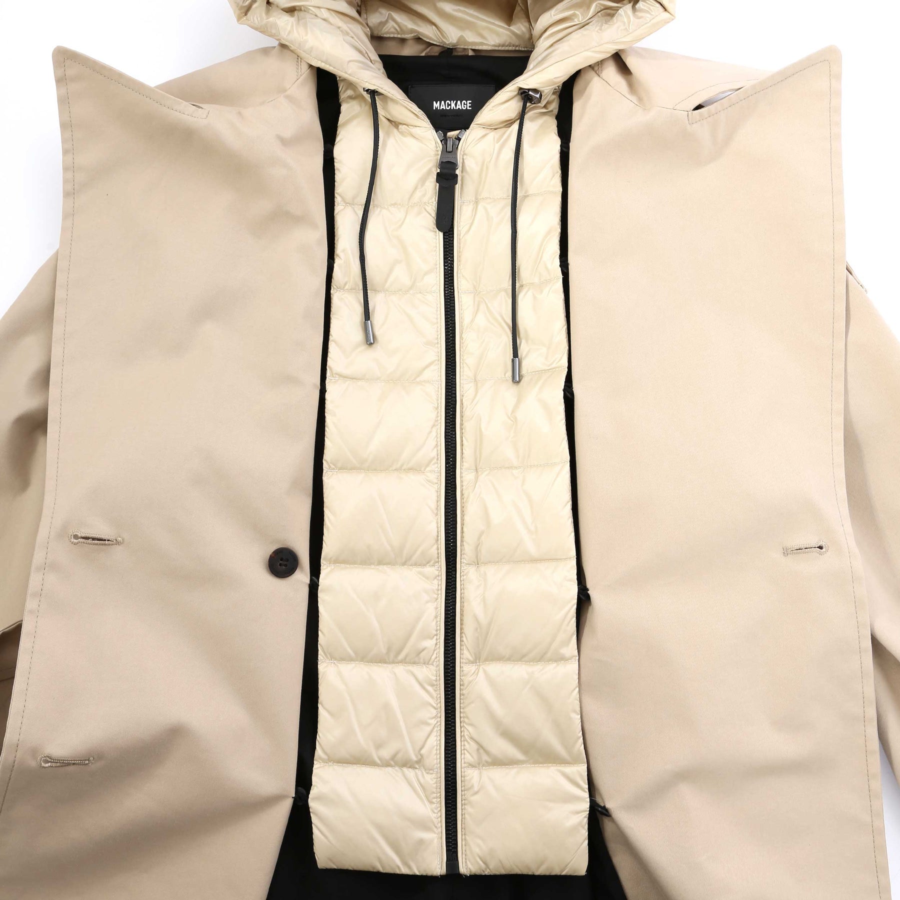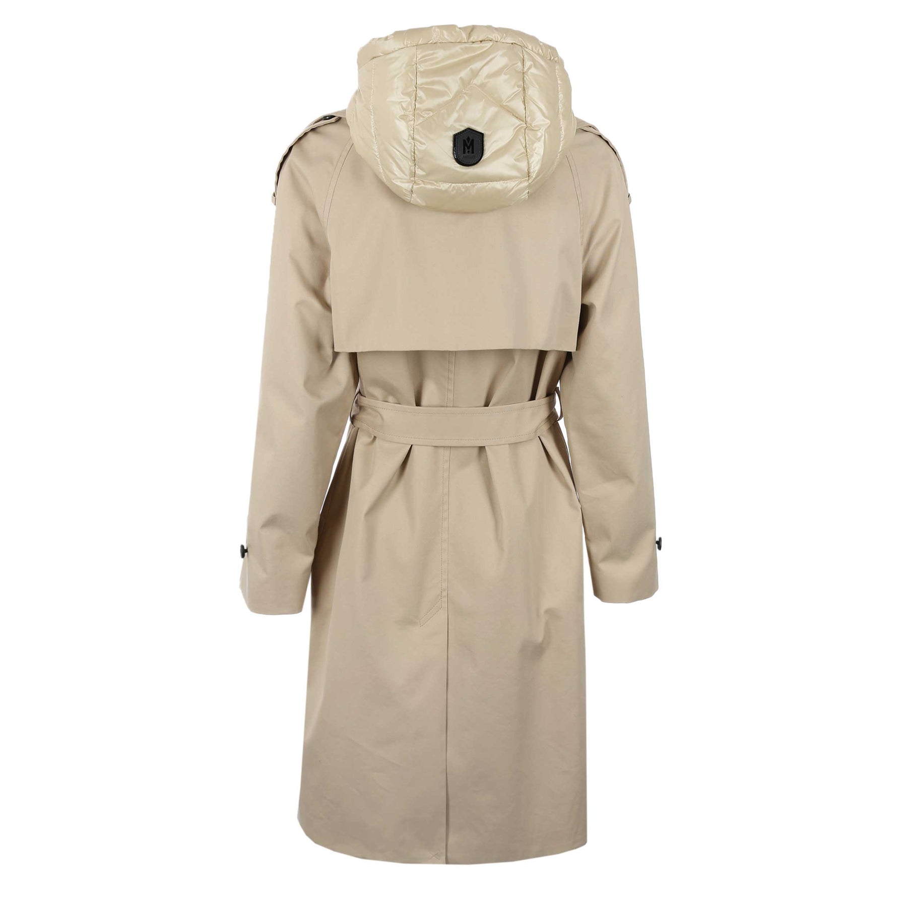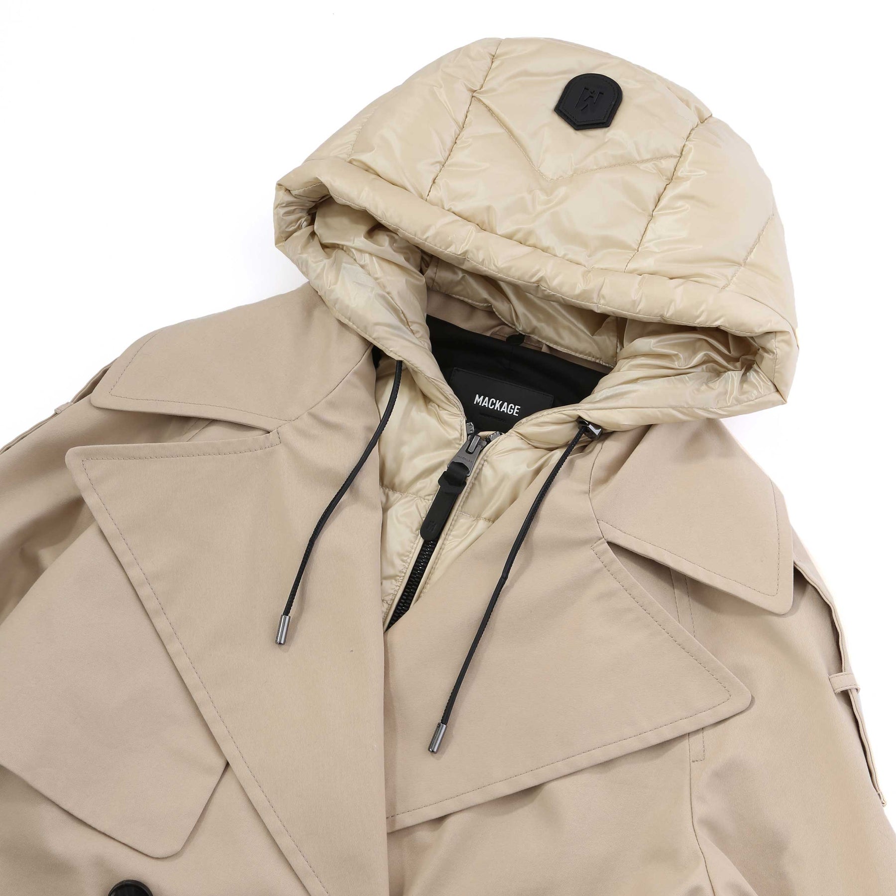 Mackage Trisha Ladies Jacket in Beige. A 2-in-1 trench coat made with a 100% recycled 2-layer shell. Removable hooded bib tothe inside of the jacket. Wide notch lapels and epaulettes to the shoulders. Sash belt to the waist and button tab cuffs. Mackage logo tab to the hood.