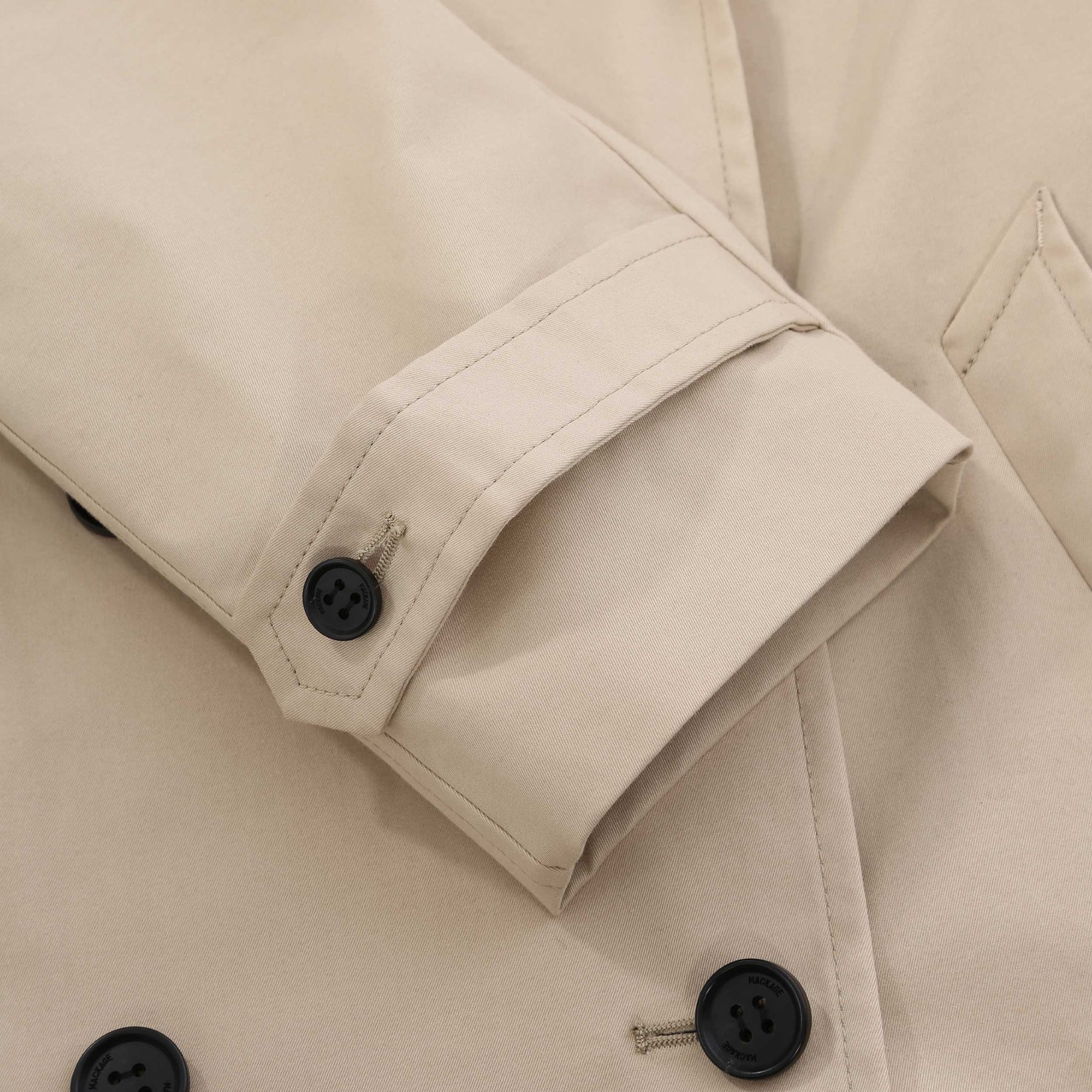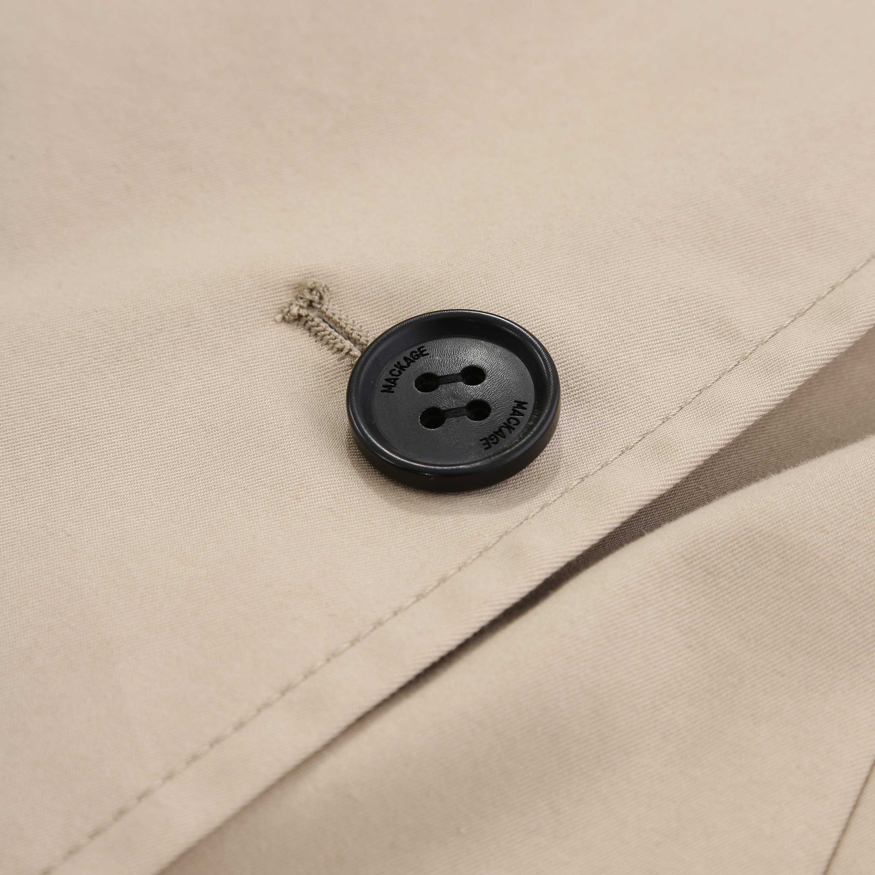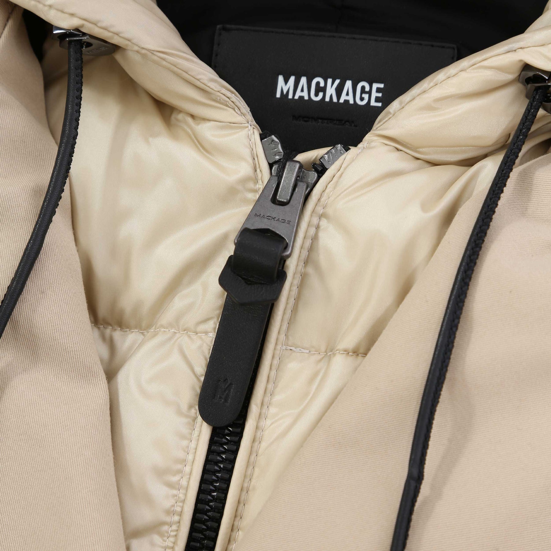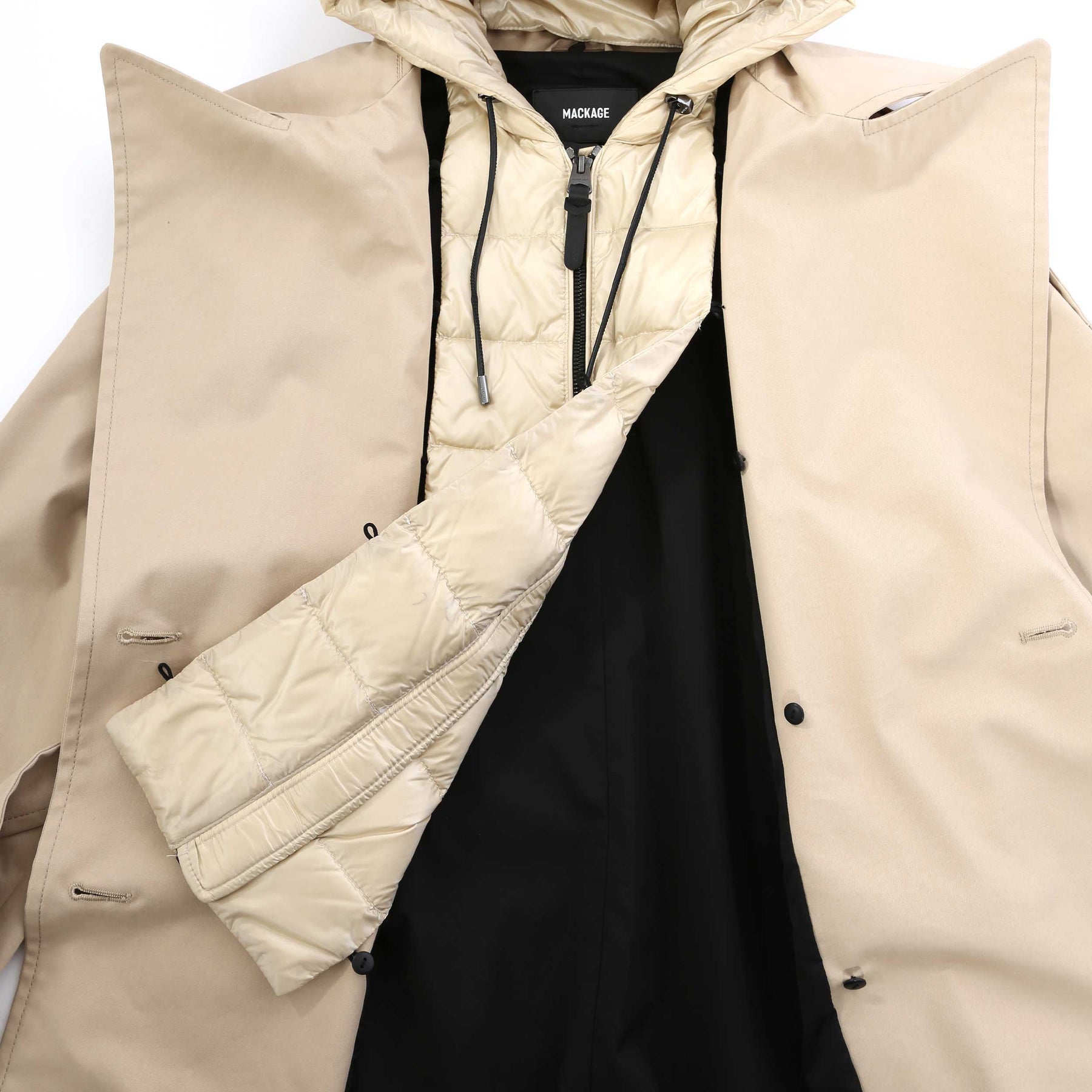 Mackage Trisha Ladies Jacket in Beige. A 2-in-1 trench coat made with a 100% recycled 2-layer shell. Removable hooded bib tothe inside of the jacket. Wide notch lapels and epaulettes to the shoulders. Sash belt to the waist and button tab cuffs. Mackage logo tab to the hood.