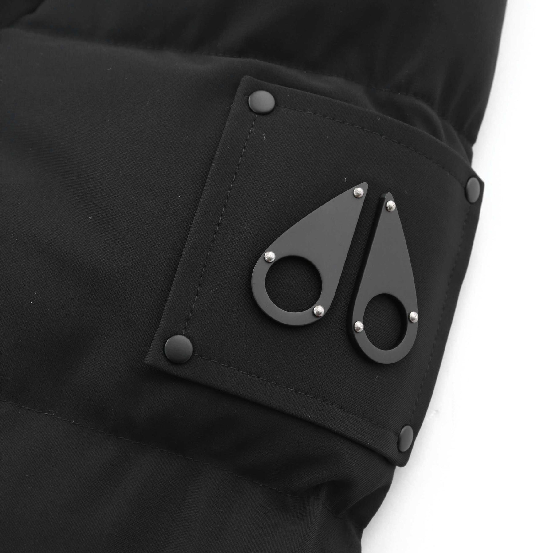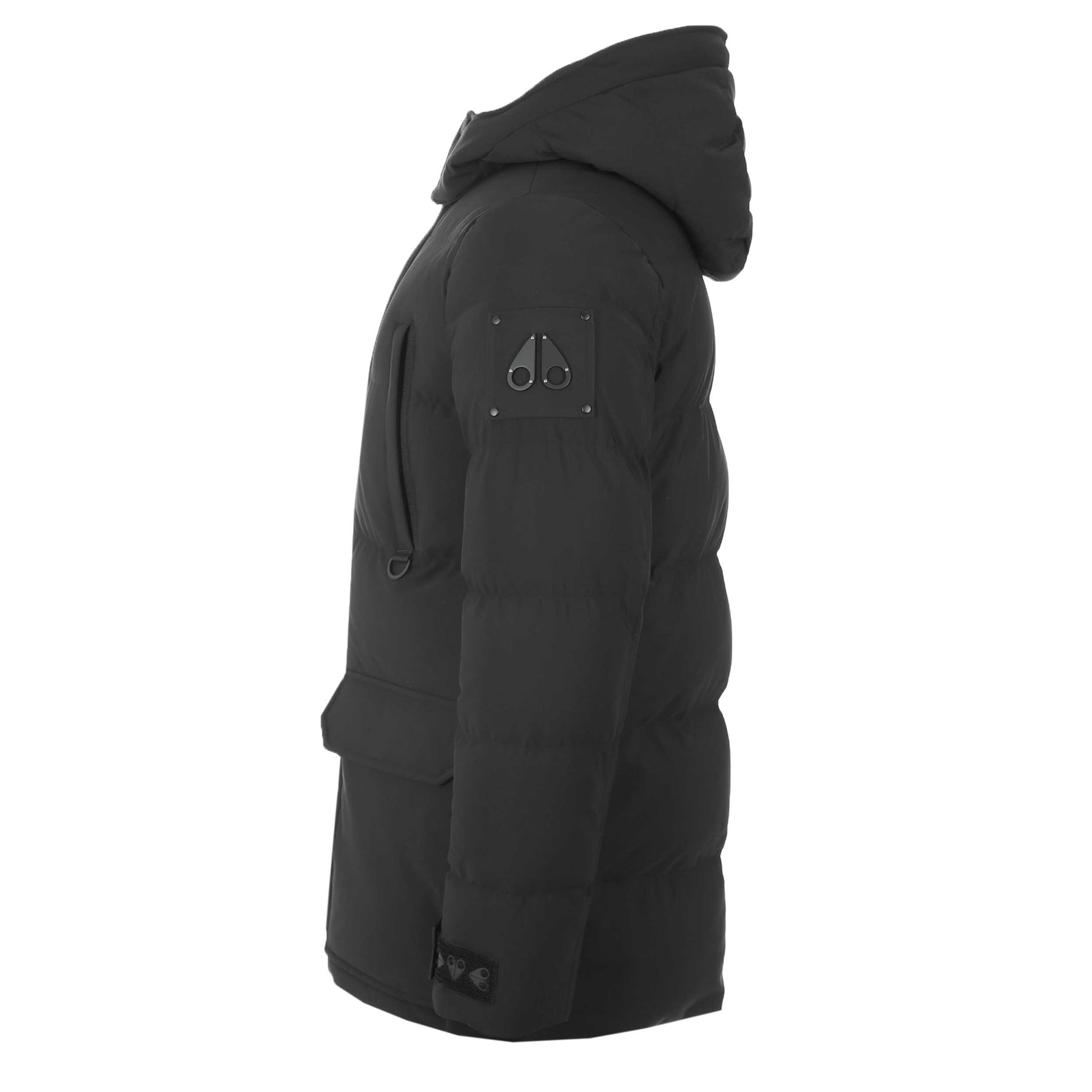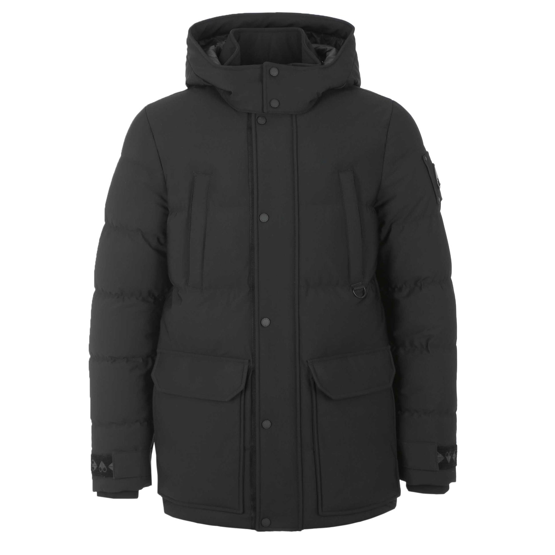 Moose Knuckles Valleyfield 2 Jacket in Black. A slim fitting Moose Knuckles coat. Two-way front zipper with a button-up storm flap. Elasticated cuffs. Two zip fastening pockets to the chest. Two dual entry pockets to the waist with side entry and flap fastening detail. Detachable hood and two front flap pockets. D ring detailing to the chest. Finished with a metal logo badge to the sleeve (colour of metal badge may vary black/gunmetal/silver.)