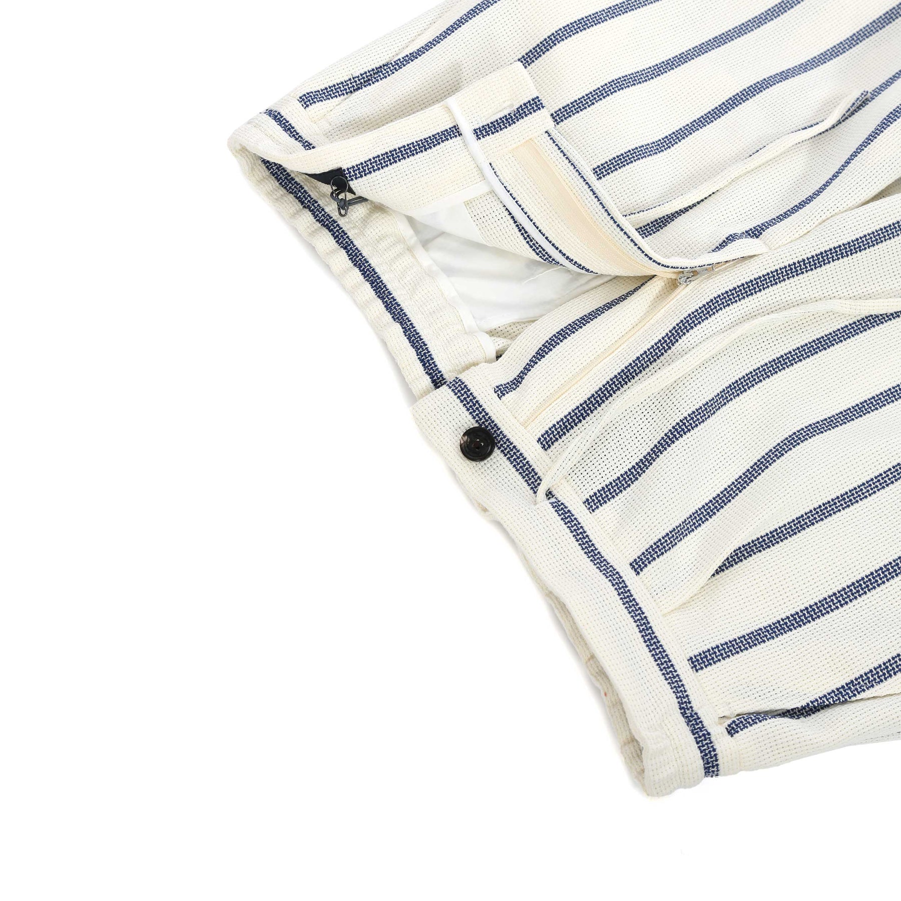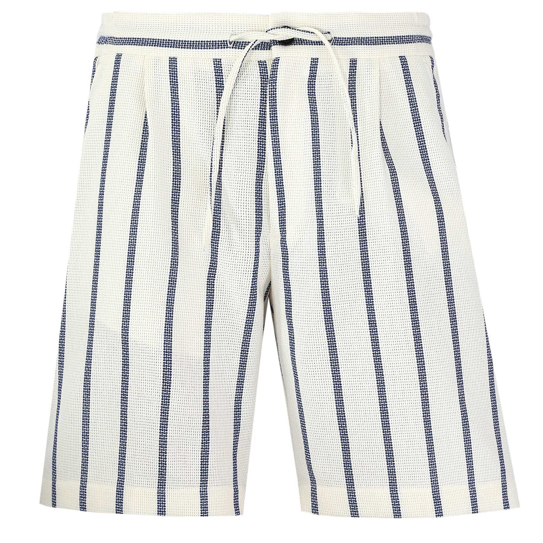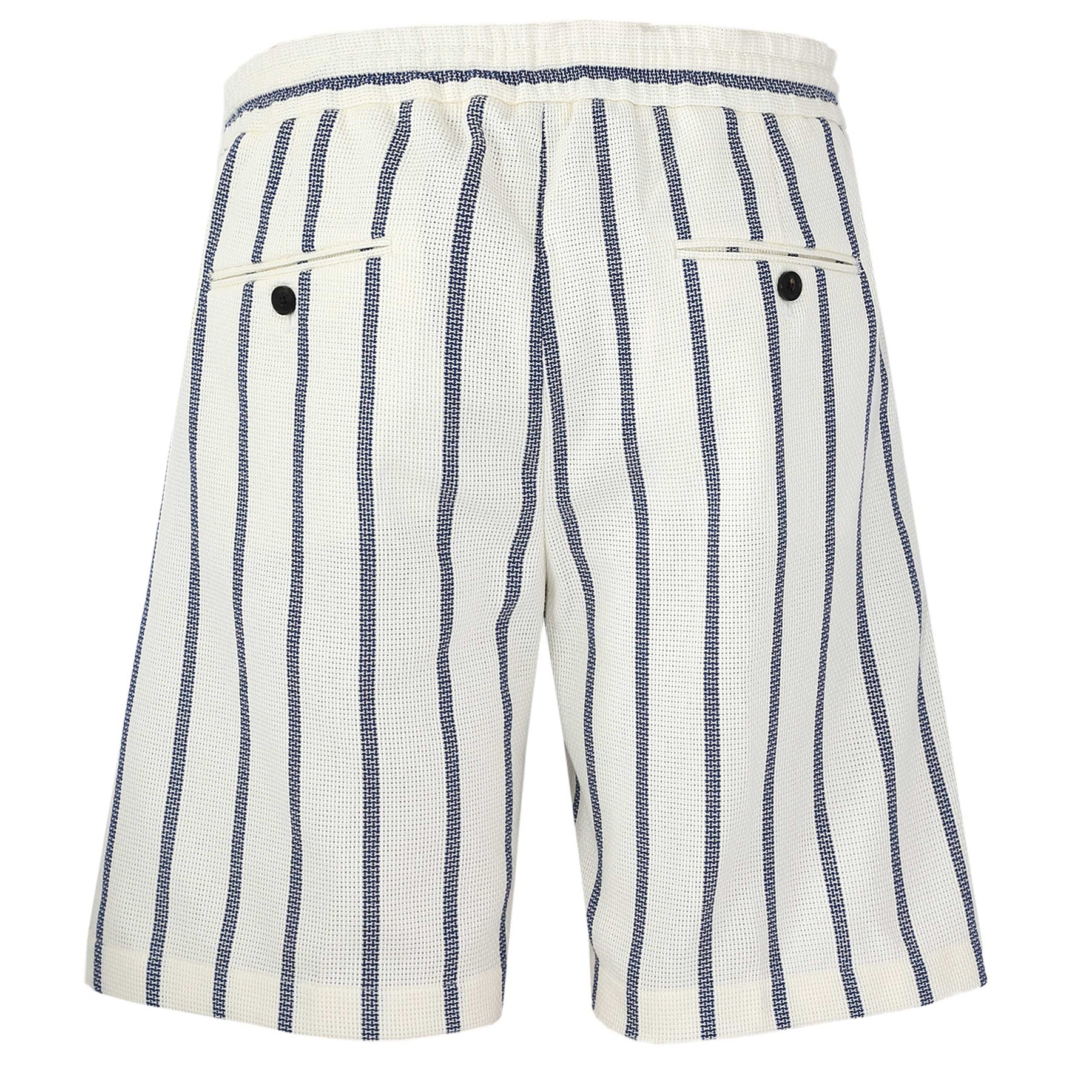 Oliver Sweeney Regatos Short in Ecru & Navy. The Regatos Shorts are cut from a loosely woven 100% cotton hessian, offering a substantial hand-feel with natural texture and structure. The heavier-weight cloth gives them presence, while remaining breathable and easy to wear. Designed with a relaxed silhouette, they feature a single front pleat for subtle shape, two slant side pockets and two jetted rear pockets finished with button fastening.