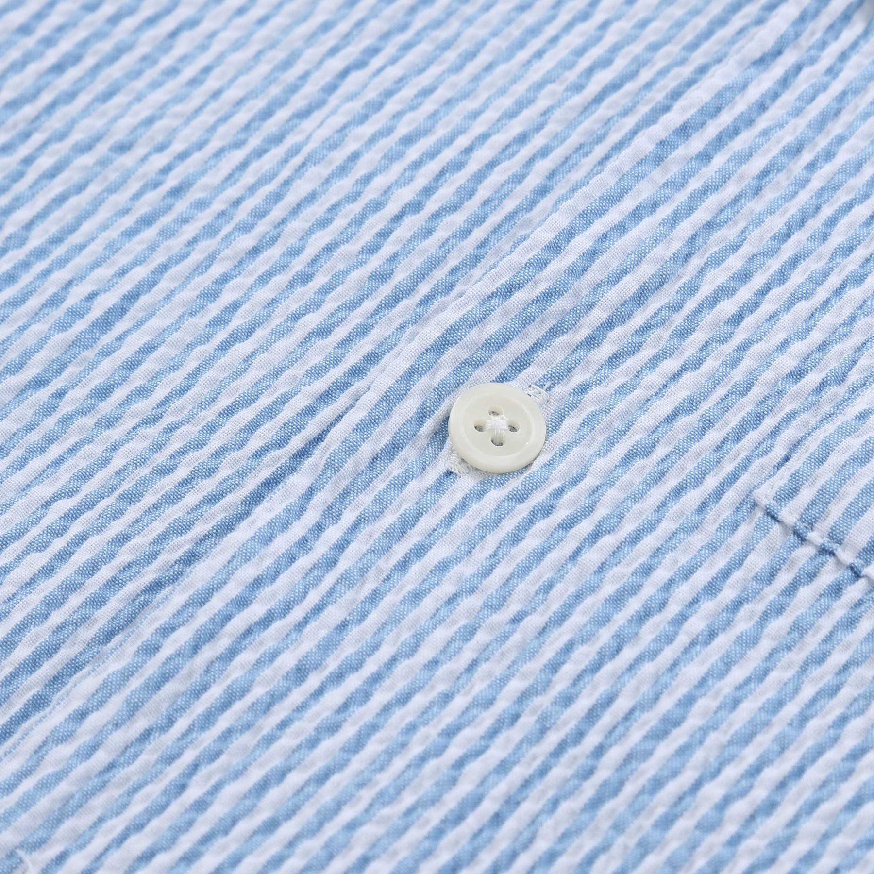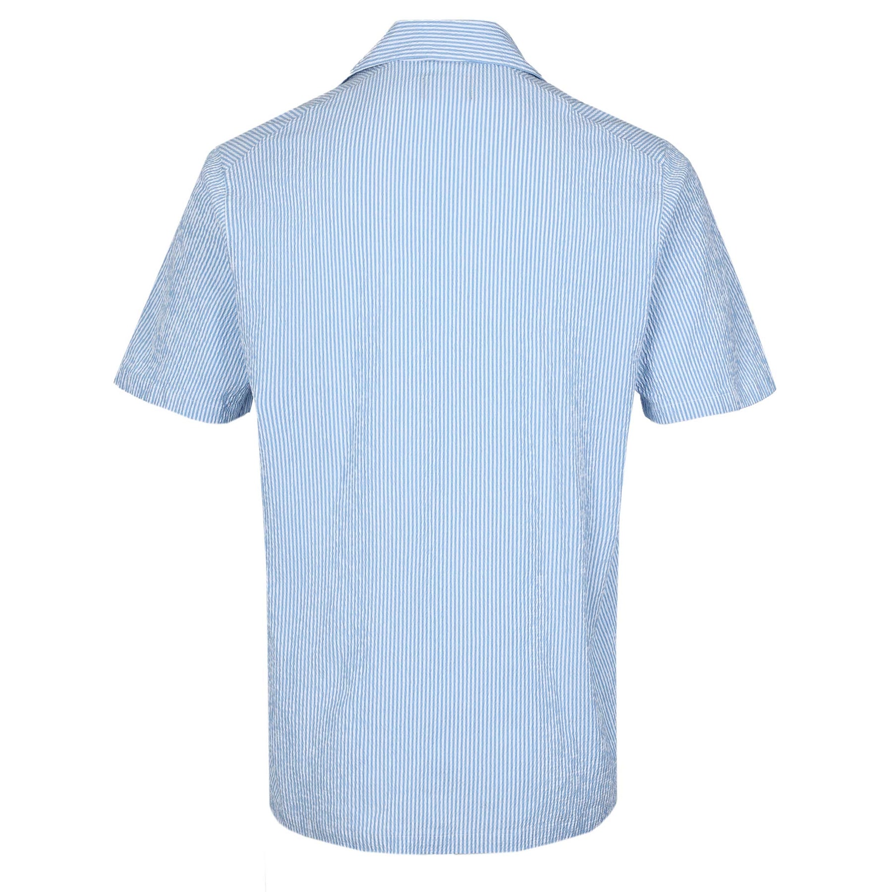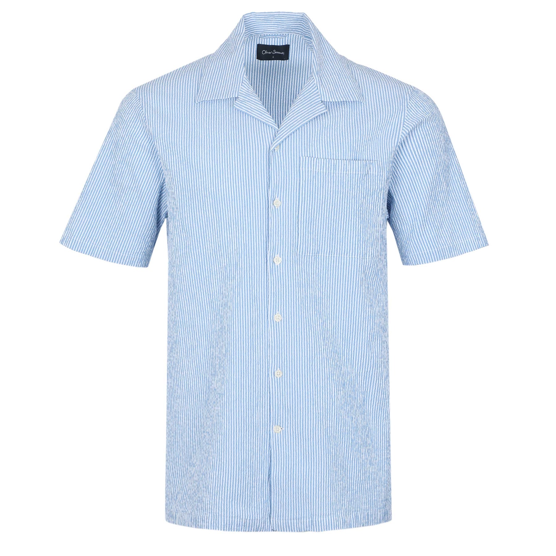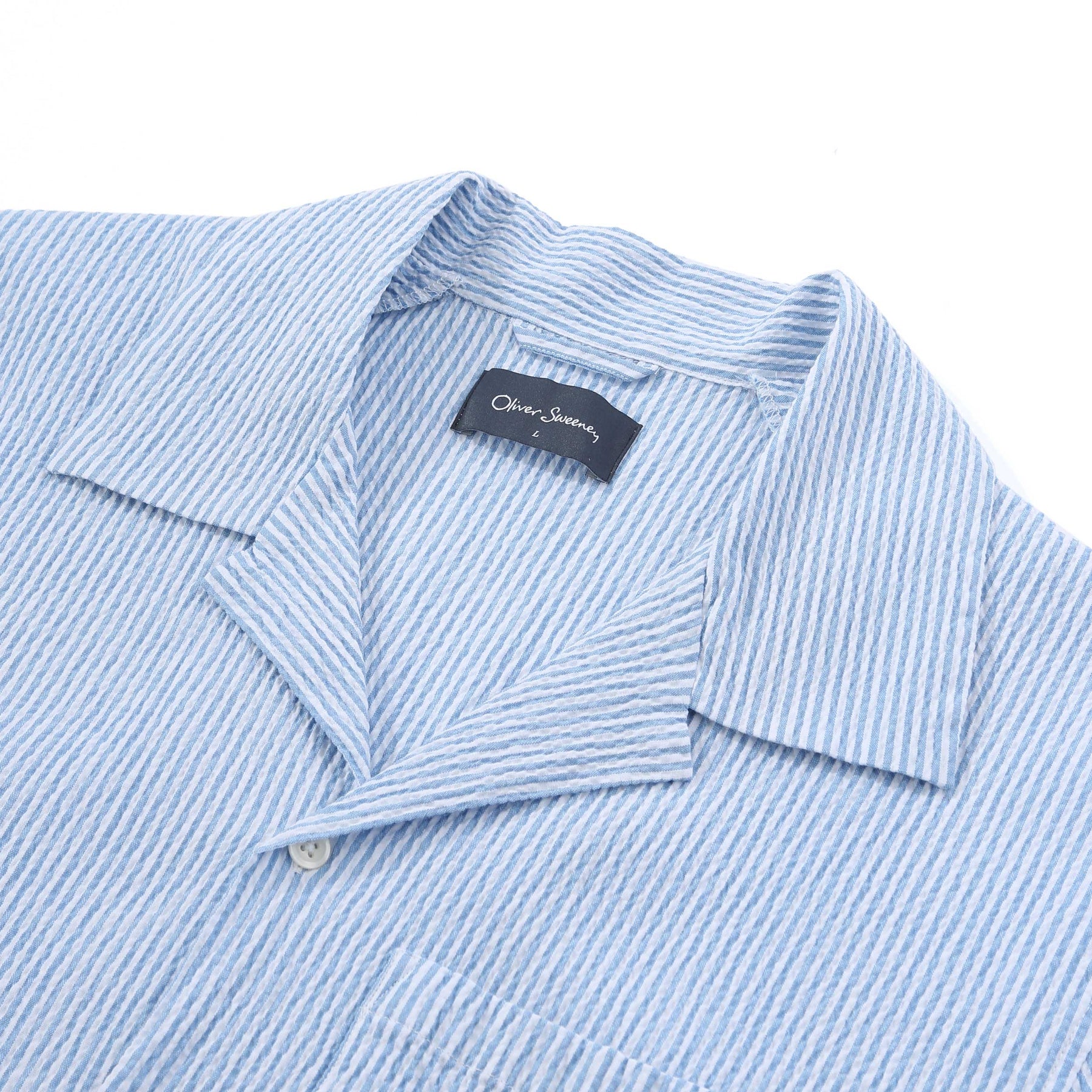 Oliver Sweeney Sereta SS Shirt in Light Blue Stripe. The Riviera Shirt is crafted from premium cotton seersucker, woven at the renowned Tessuti di Sondrio mill in Italy, with a touch of elastane for added comfort and ease of movement. Lightweight and naturally textured, seersucker’s puckered finish allows air to circulate while resisting heavy creasing making it an ideal choice for warm weather, packing and travel. Cut in a relaxed silhouette, it features an open-neck unstructured collar, short sleeves and a straight hem with twin side vents for effortless wear. Details include a single chest pocket, lined yoke for structure, subtle embroidered logo on the lower placket and refined pearl-effect buttons.