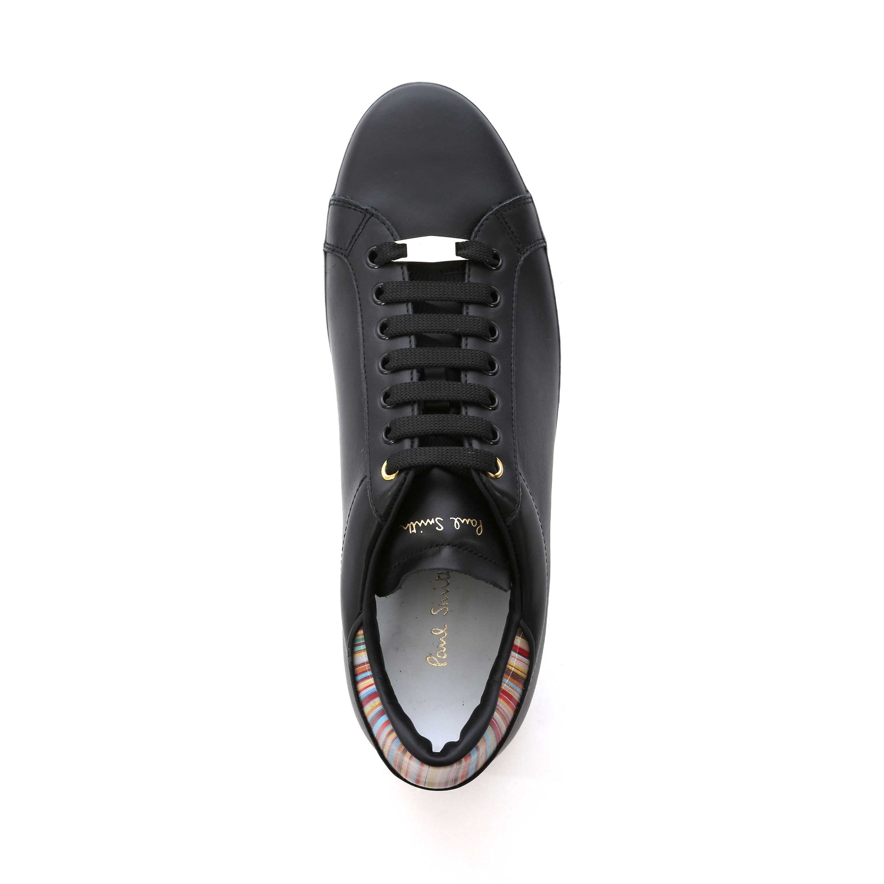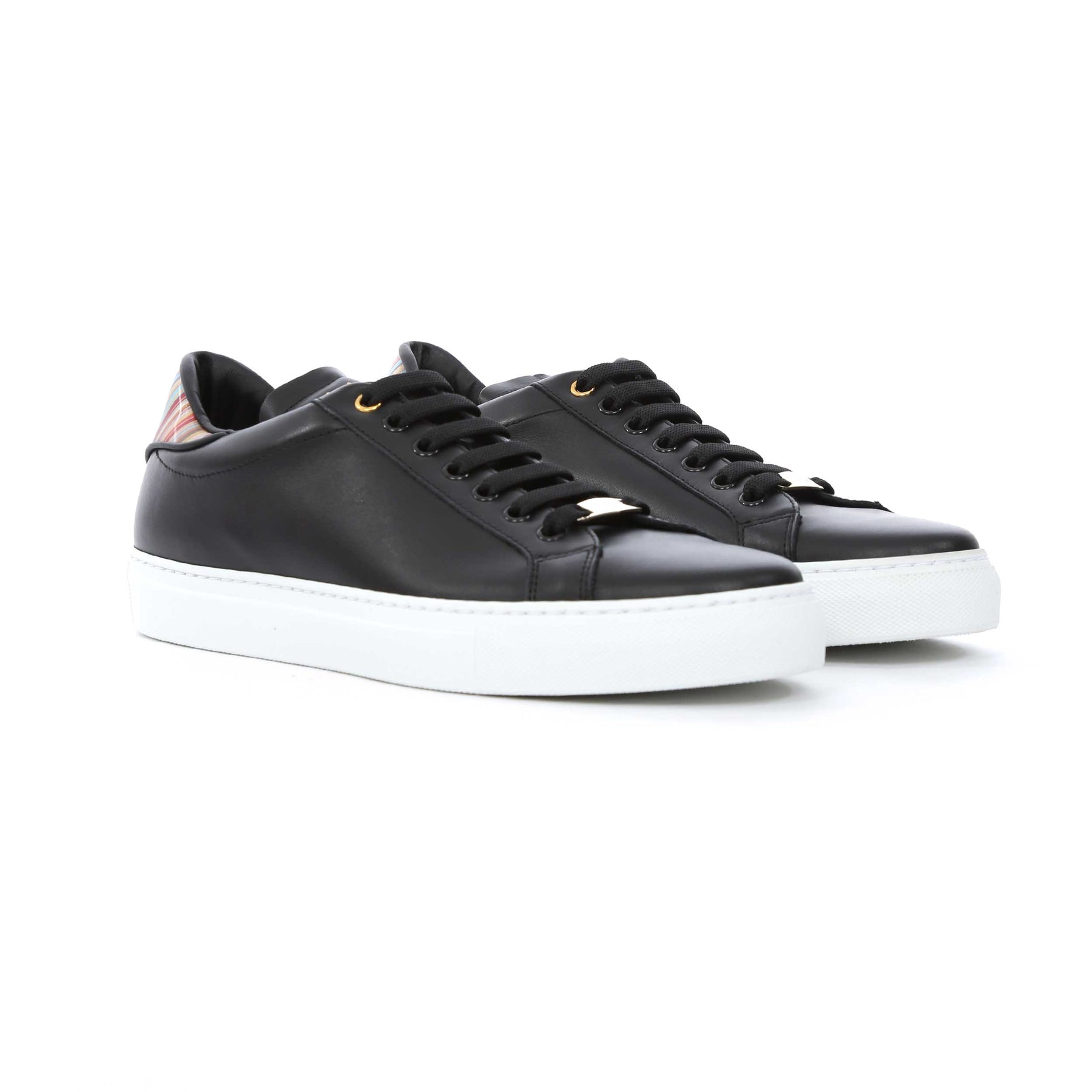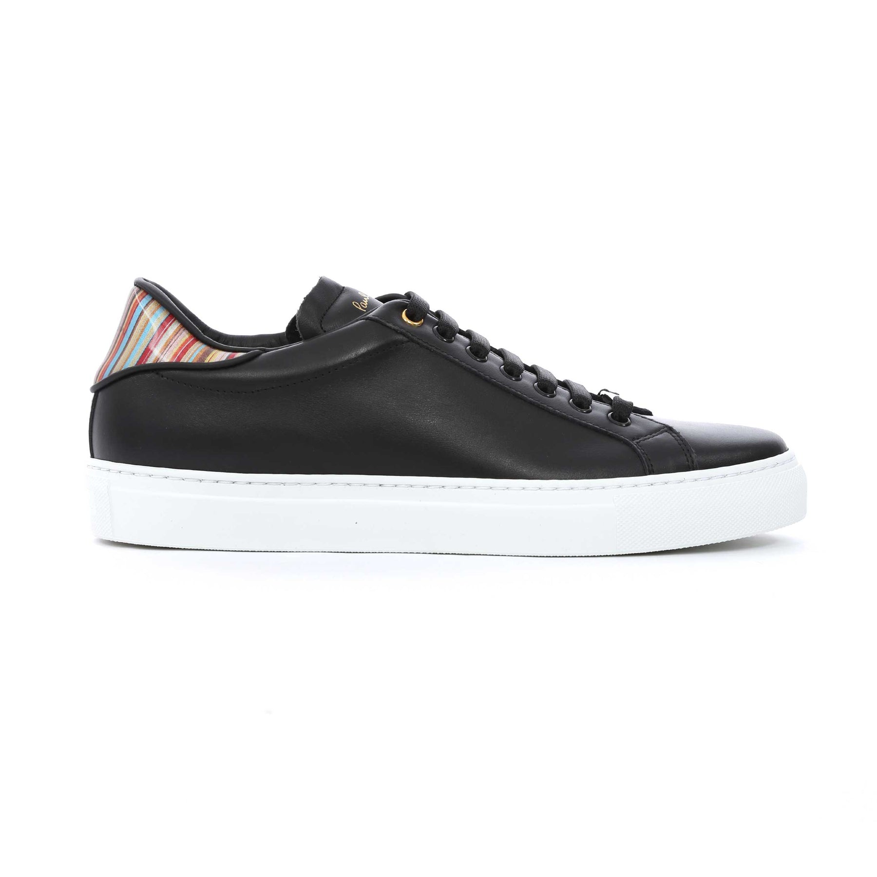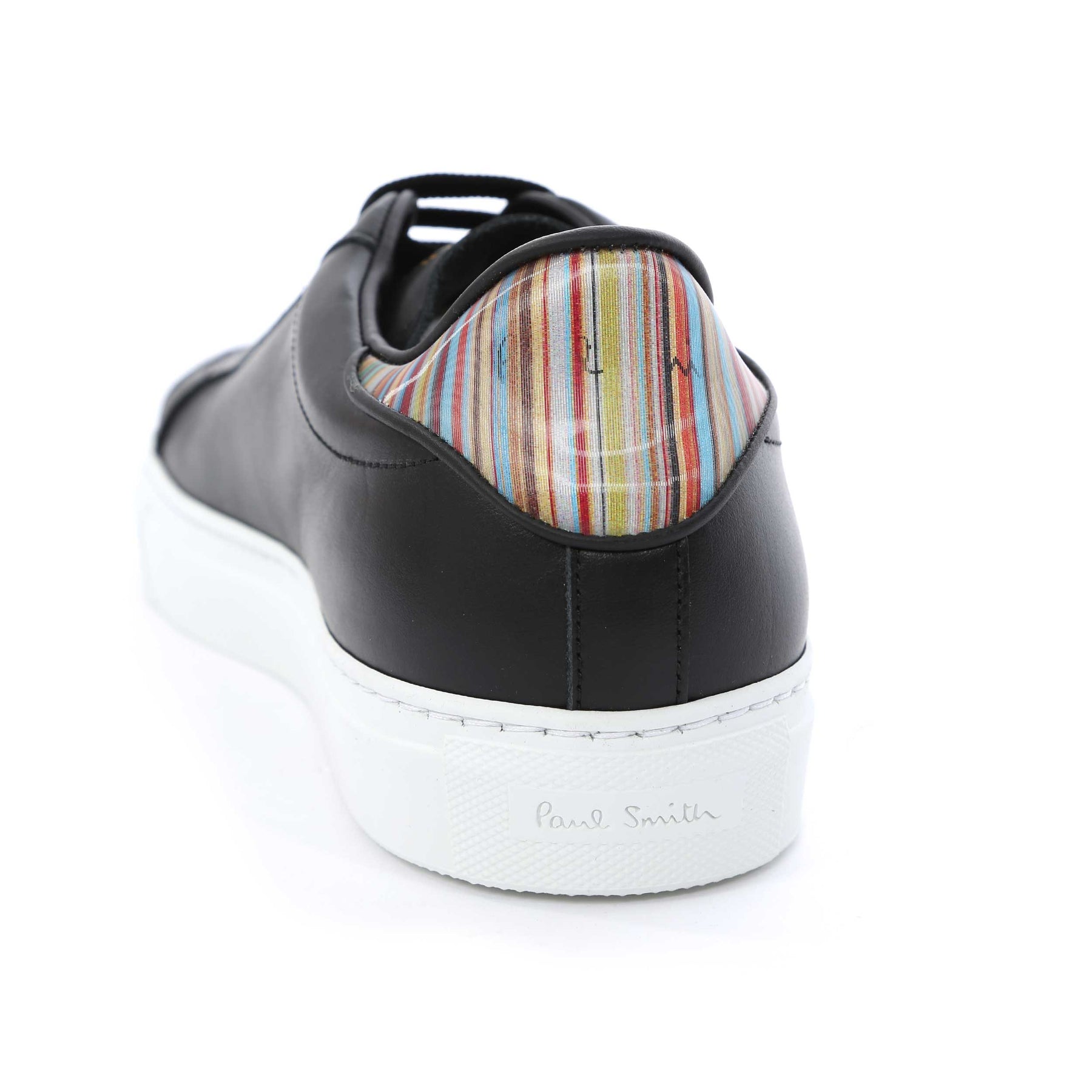 Paul Smith Beck Black Multi Spolier Trainer in Black. A plain design leather trainer by Paul Smith. Featuring the signature Paul Smith multi-coloured stripe design to the heel panels with Paul Smith branding. Finished with a contrasting colour sole unit. Perfect for everyday wear.