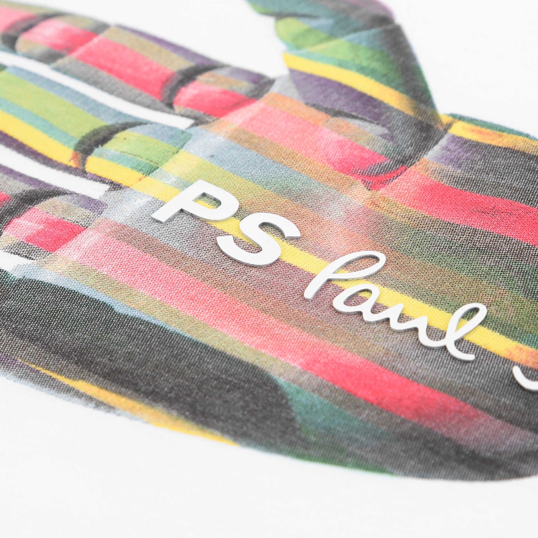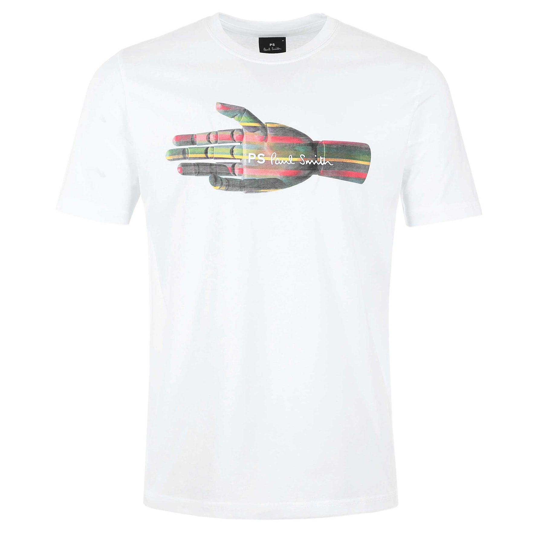 Paul Smith Hand T Shirt in White. A short sleeve crew neck t-shirt by Paul Smith featuring an artistic striped hand print design. Constructed from a soft cotton. Raised rubber Paul Smith branding on the body of the t-shirt. Perfect for everyday wear.