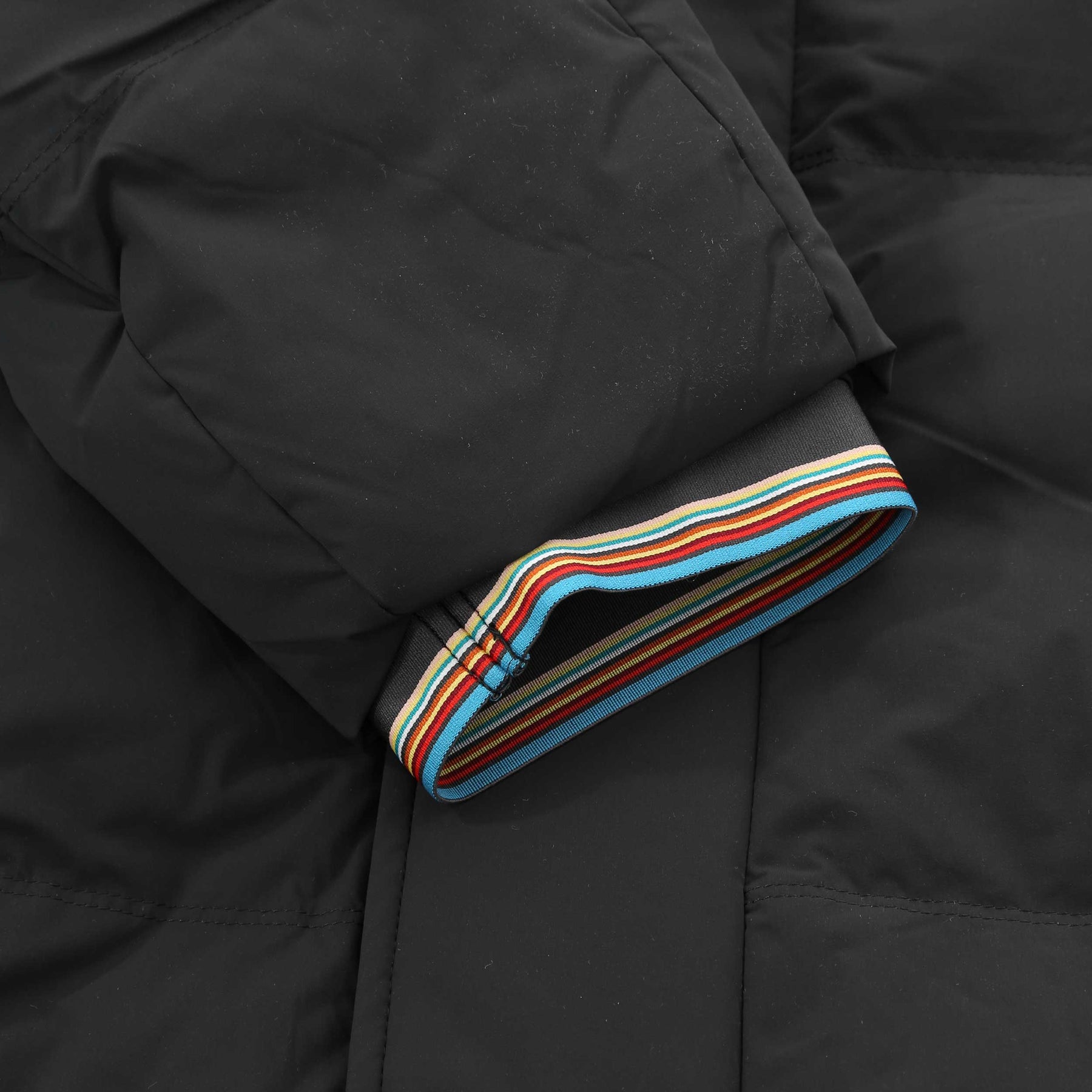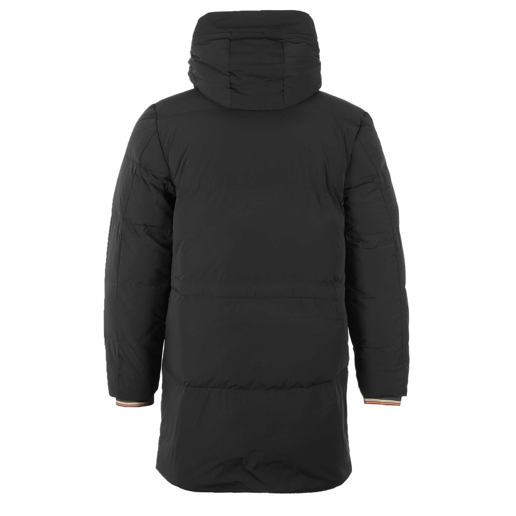 Paul Smith Hooded Down Jacket in Black Melange. A quilted parka style jacket by Paul Smith. A full zip fastening jacket with the iconic Paul Smith multi-coloured contrasting trim to the inside of the zip placket. Two front pockets with zip fastening. Elasticated cuffs with Paul Smith multi-coloured contrasting trim. Removable hood with elasticated drawstrings. Tonal Paul Smith logo badge to the chest.