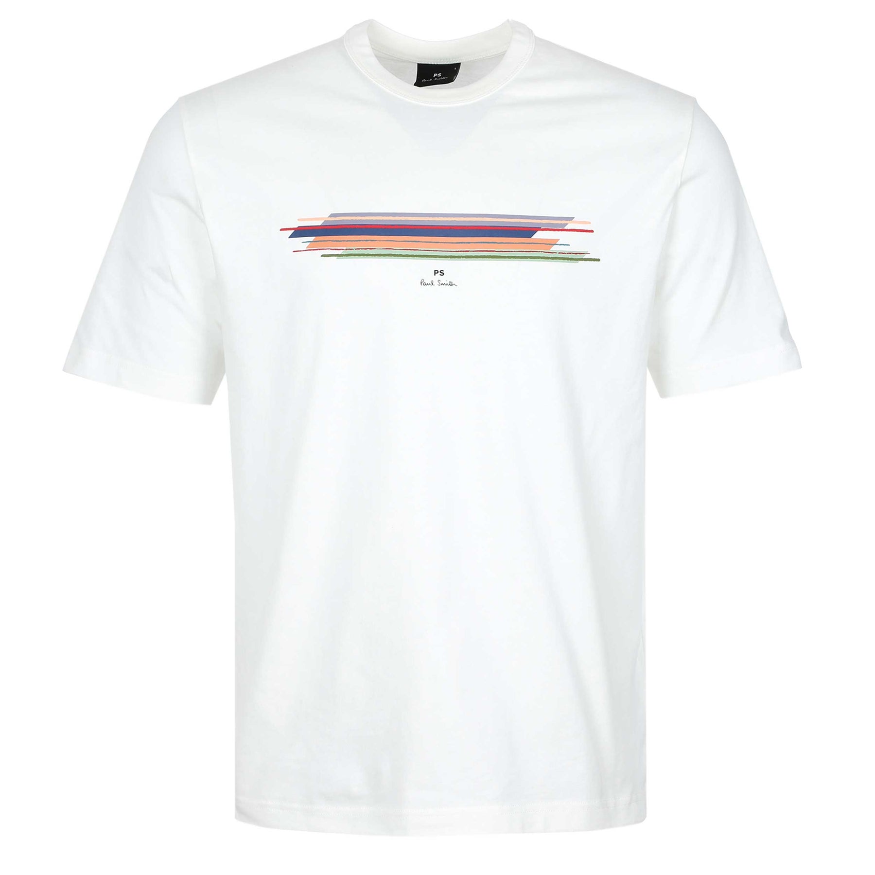 Discover the elegance and style of the Paul Smith Casual Fit Stripe T-Shirt in White. This versatile t-shirt is perfect for any casual outing, bringing a sophisticated touch to your everyday wardrobe. Designed by the renowned fashion designer Paul Smith, it showcases a unique printed multicoloured stripe design across the chest, making it a standout piece.