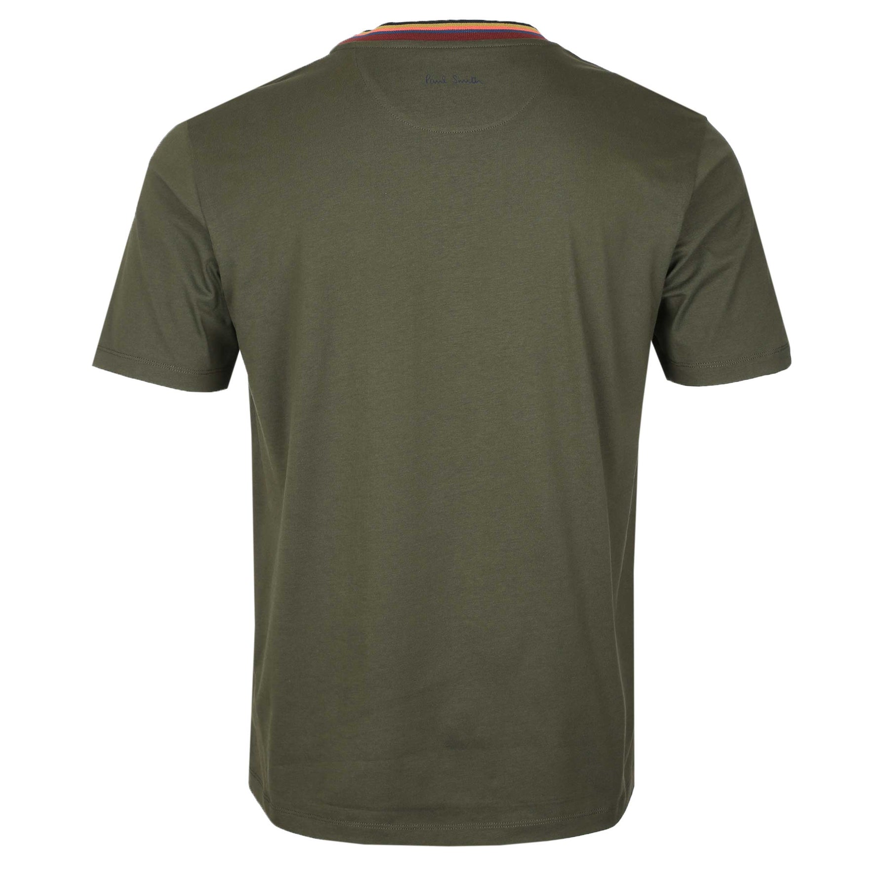 Paul Smith Stripe Rib T Shirt in Army Green. A classic T shirt by Paul Smith. With a crew neck and short sleeves. A plain design with a contrasting multi-coloured stripe neckline. Paul Smith branding to the nape of the neck.