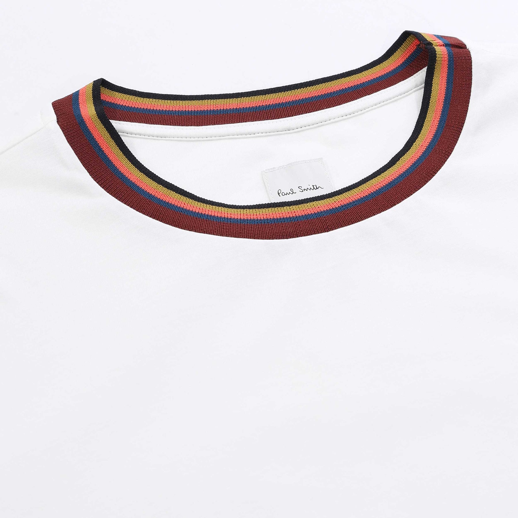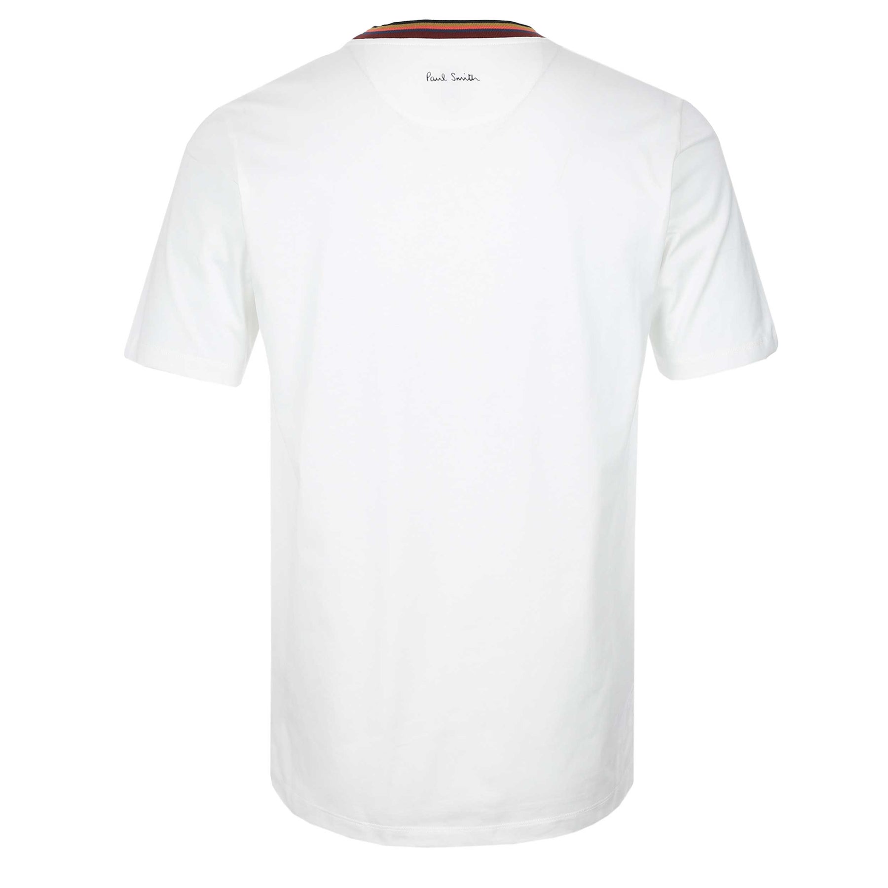 Paul Smith Stripe Rib T Shirt in White. A classic T shirt by Paul Smith. With a crew neck and short sleeves. A plain design with a contrasting multi-coloured stripe neckline. Paul Smith branding to the nape of the neck.