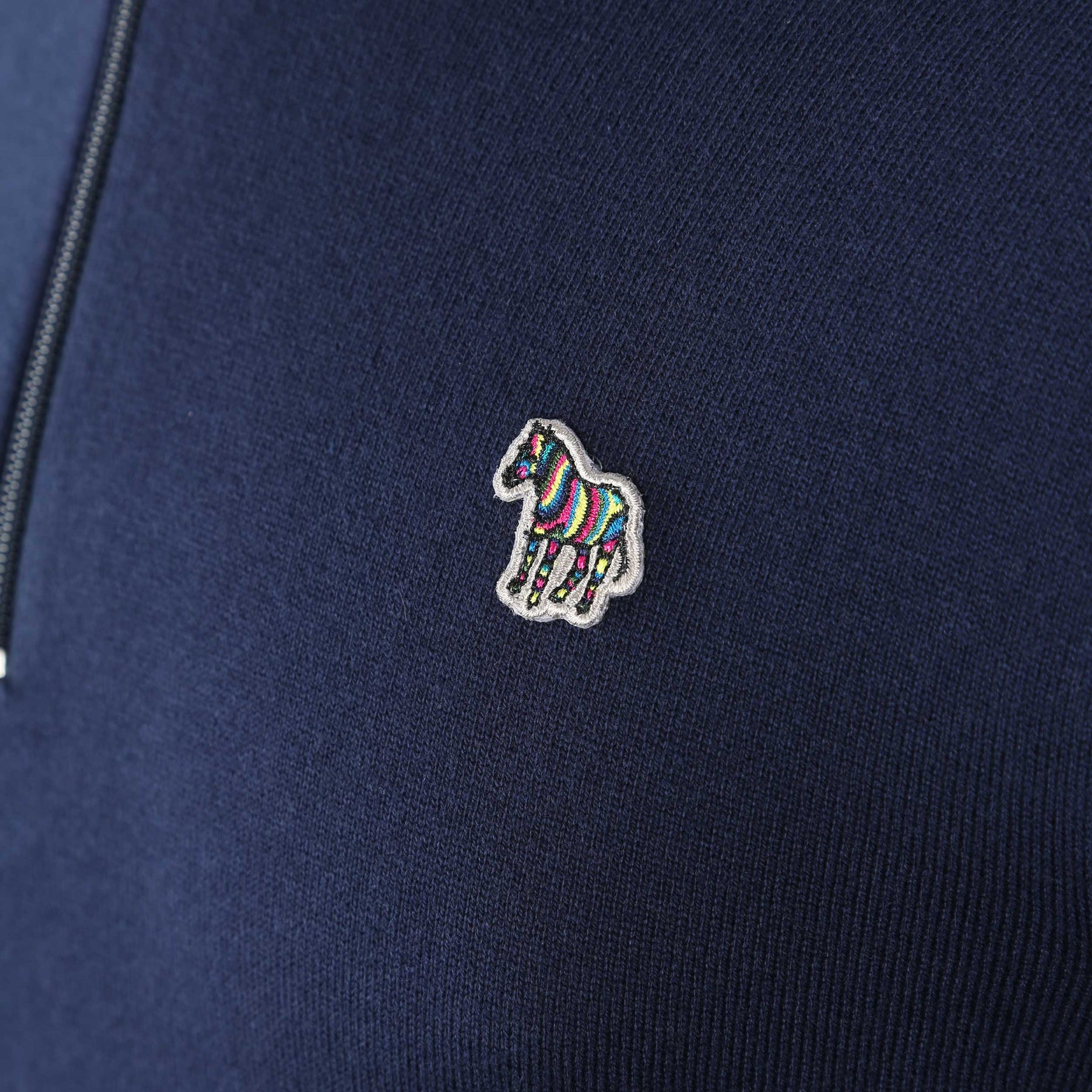 Paul Smith Zip Neck Zeb Bad Knitwear in Navy. A classic knitwear by Paul Smith. Featuring long sleeves, a funnel neck and half zip fastening. Finished with a ribbed waistband and cuffs, and a striped zebra logo on the chest in a multi-colour pattern. Perfect for everyday wear.