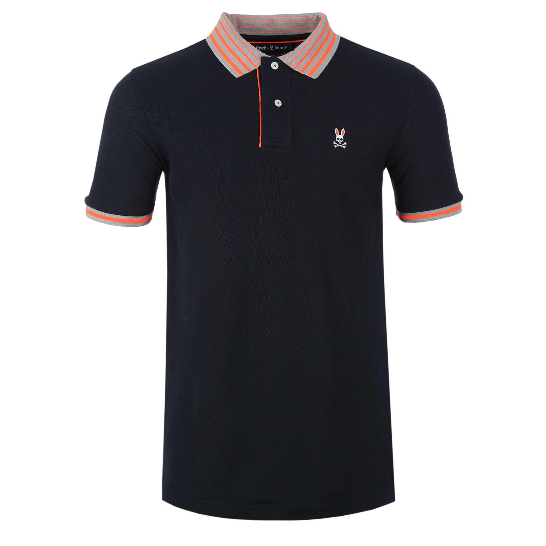 Psycho Bunny Norris Pique Polo Shirt in Navy. A classic style polo shirt by Psycho Bunny. Classic polo collar with a 2-button placket. Contrasting colour collar and cuffs with stripe detailing. Signature bunny logo on the left breast. The perfect everyday polo shirt.