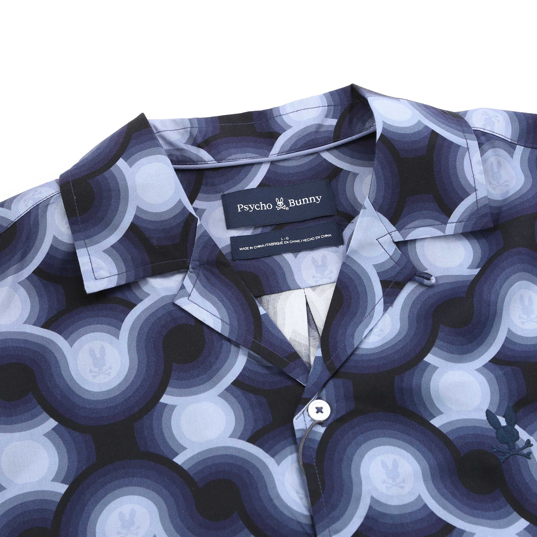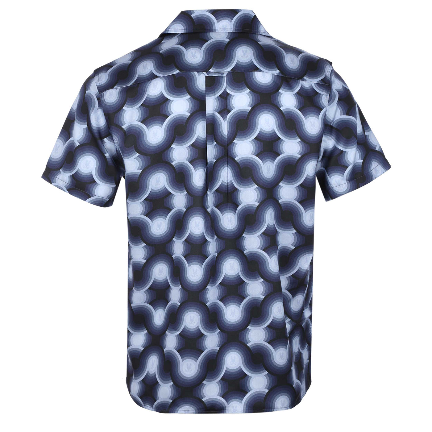 Psycho Bunny Paros SS Shirt in Navy Serenity Blue. A regular fit short sleeve shirt by Psycho Bunny. Soft cuban collar. Full button fastening placket. Crafted from tencel with a geometric printed design. Embroidered Psycho Bunny logo on the left breast. The perfect everyday casual shirt. Matching short available.