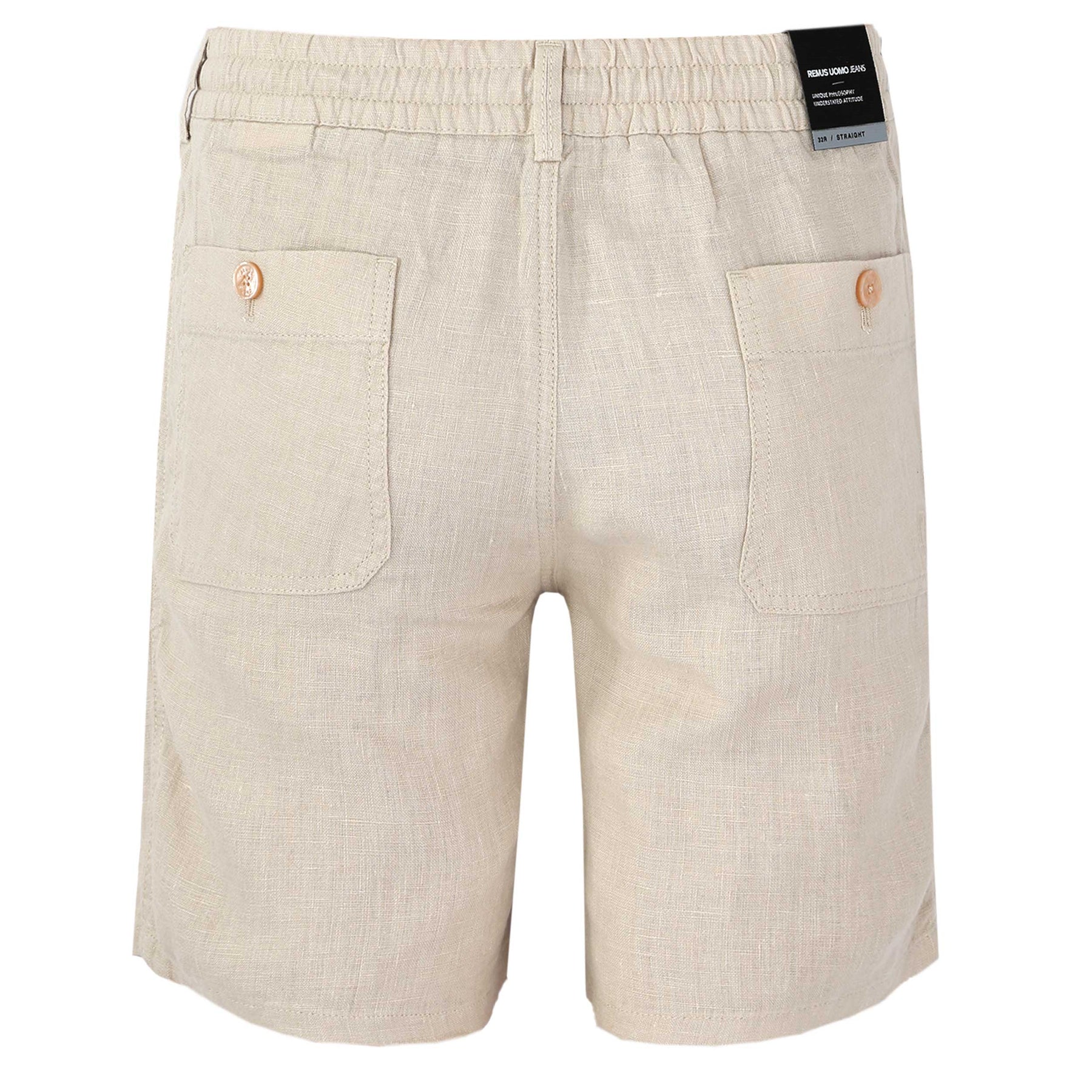 Remus Uomo Elio Linen Short in Beige. This is a straight fit, chino style short crafted from 100% linen. Fly and zip fastening placket. Elasticated waistband with drawstring fastening. Detailed with two slit pockets on the front of the shorts and finishing with two buttoned seat pockets. Tonal Remus Uomo logo to the seat pocket.
