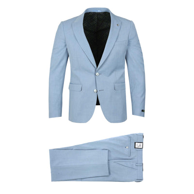 Remus Uomo Massa Trouser in Sky Blue. Slim fit trouser by Remus Uomo. Zip and hook fastening to the waistband. Detailed with two slash pockets to the sides and button fastening pockets to the seat. Matching jacket available.