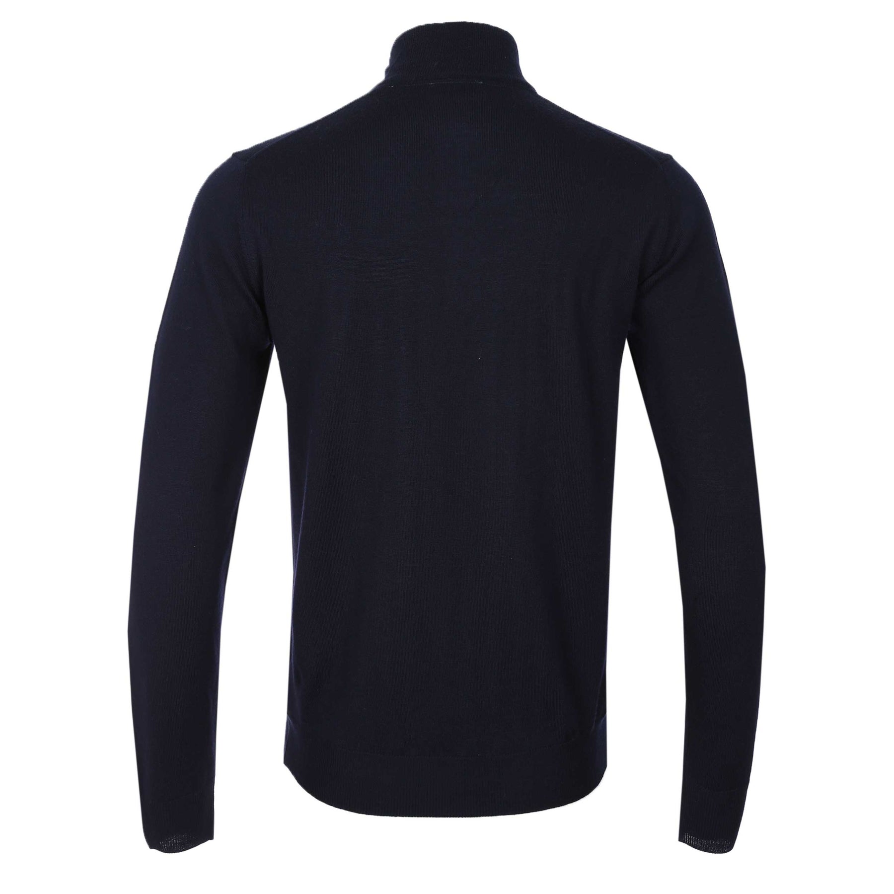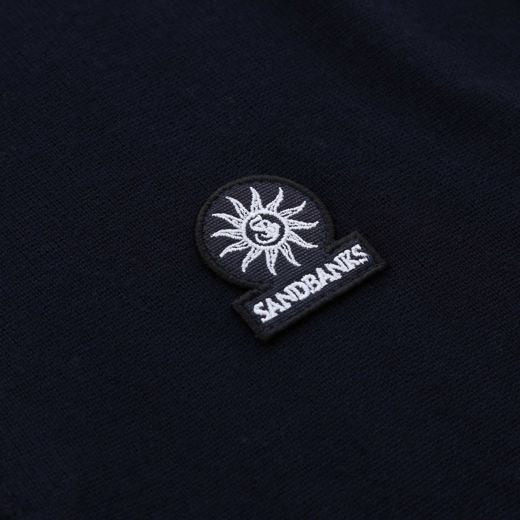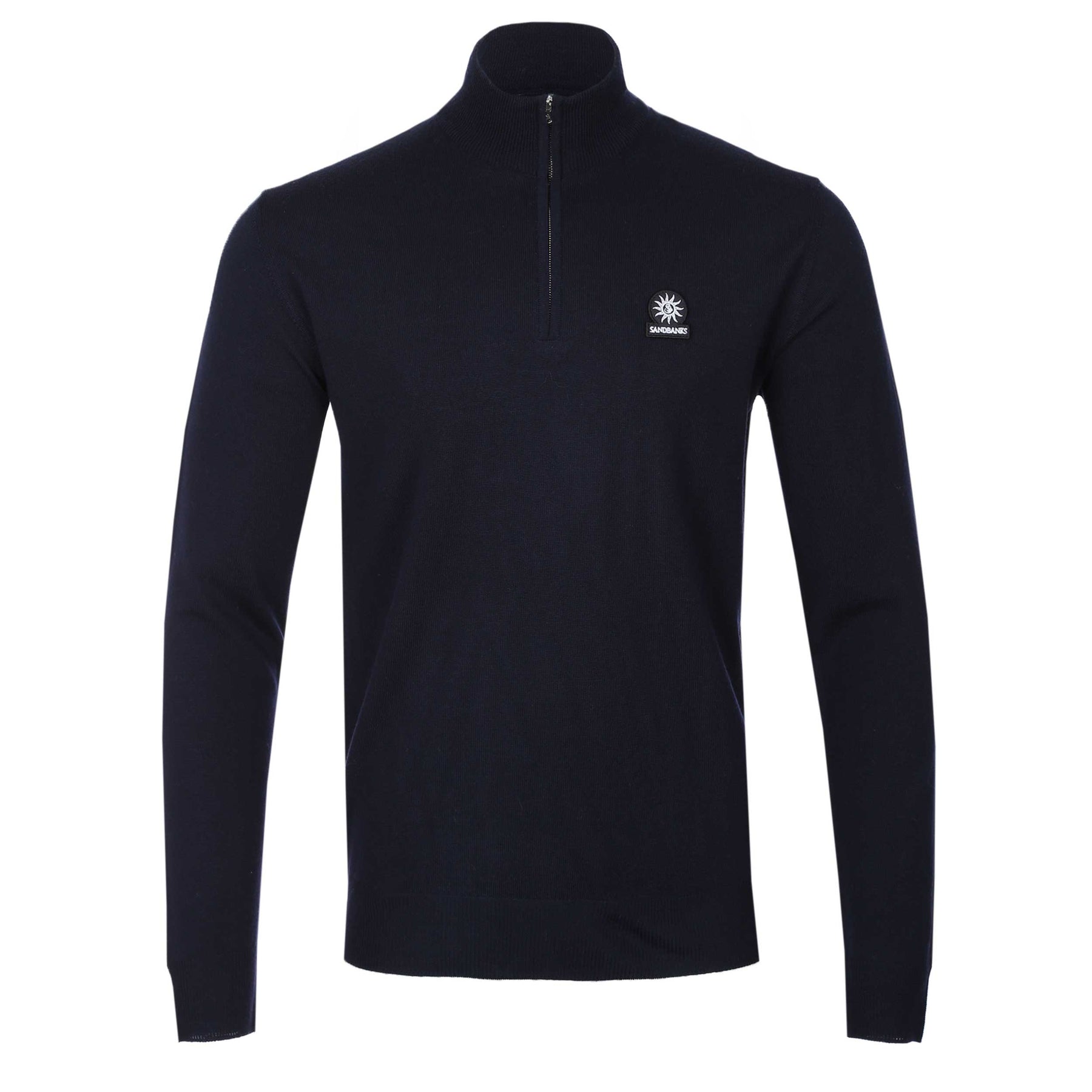 Sandbanks Merino Wool 1/4 Zip Knitwear in Navy. Knitwear by Sandbanks. Constructed from a fine gauge wool. Ribbed funnel neck with a 1/4 zip fastening placket. Ribbed cuffs and waistband. Embroidered Sandbanks logo badge to the left sleeve.