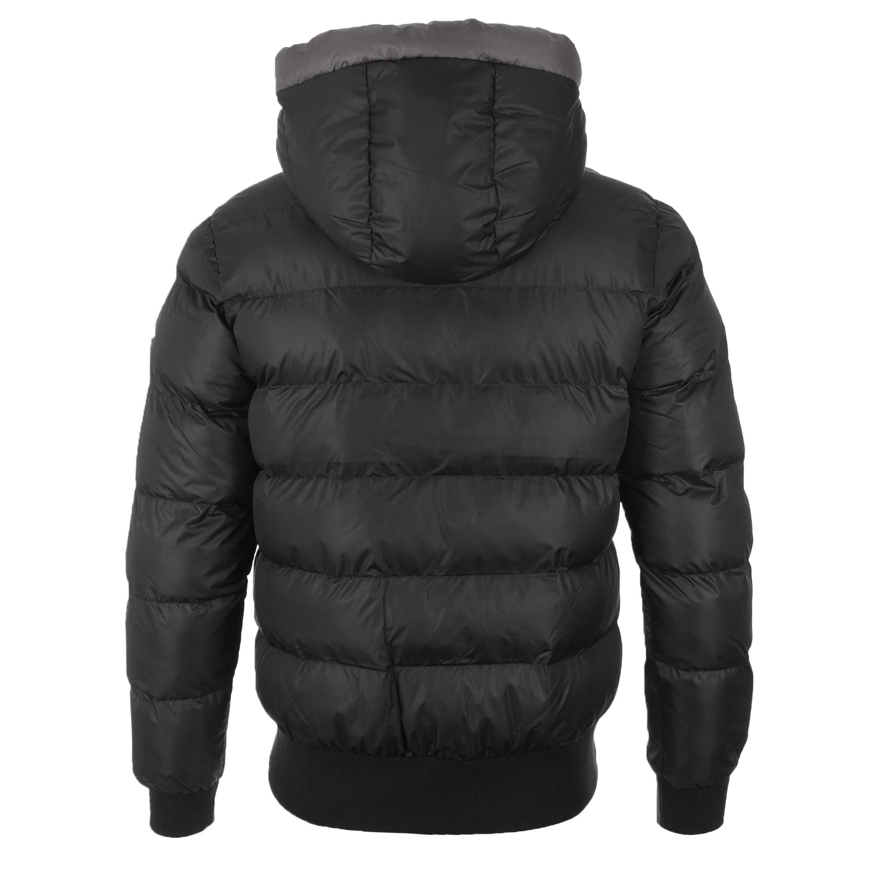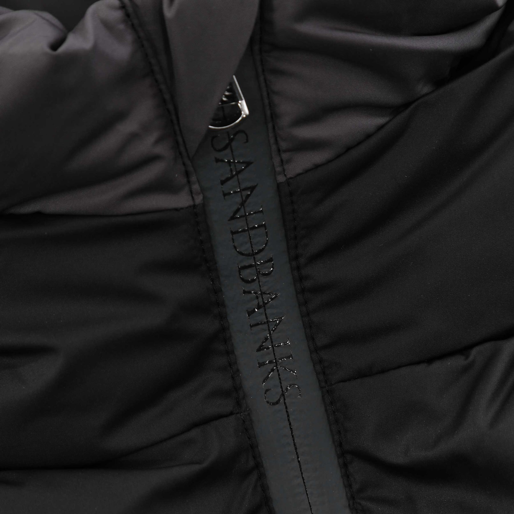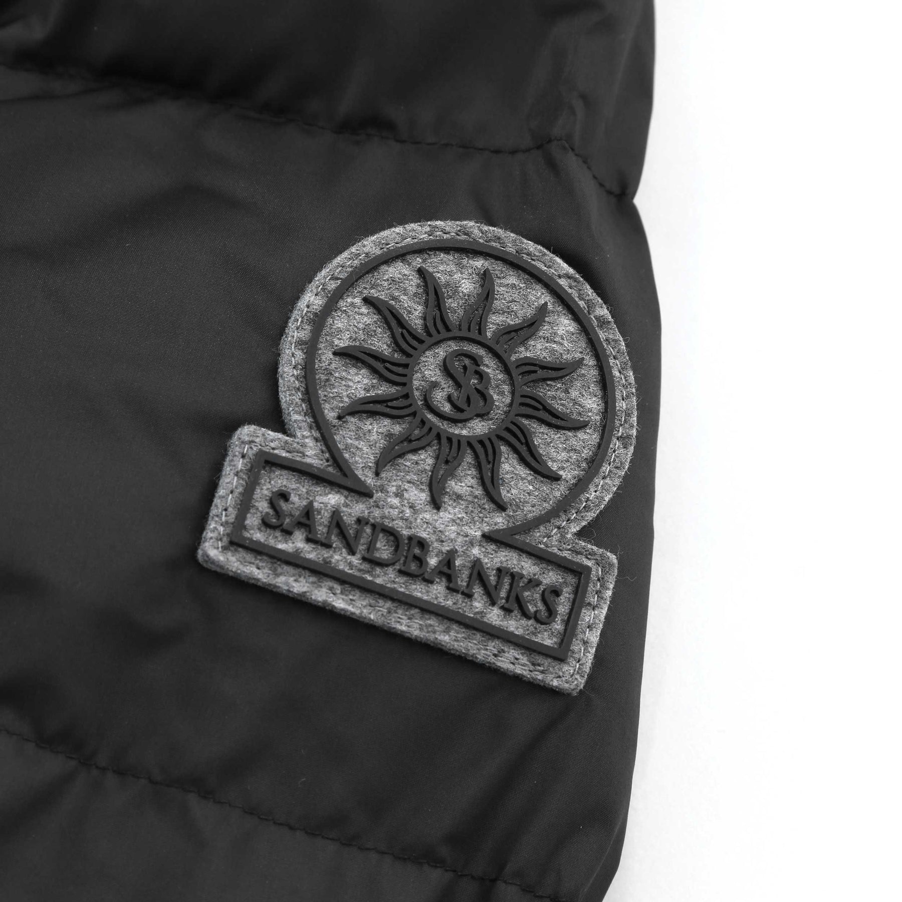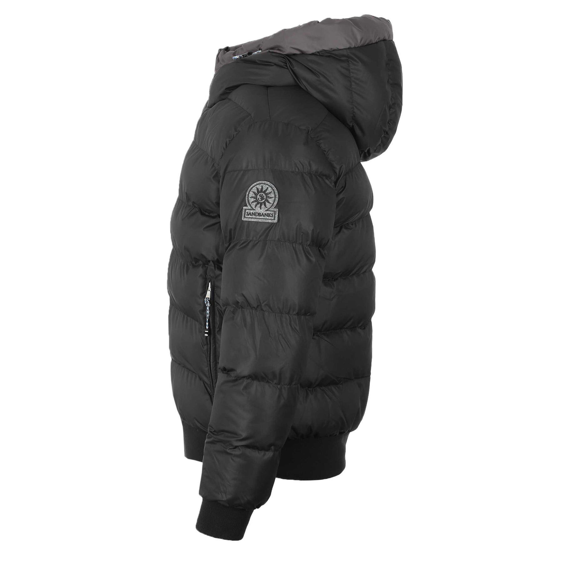 Sandbanks Apres Puffer Jacket in Black. A regular fit bomber style puffer jacket by Sandbanks. Two way fastening zip placket to the front. Hood with elasticated drawstrings. Contrasting colour trim to the hood. Two way zipper front pockets. Branding to the zip placket. Elasticated ribbed cuffs and waistband. Embroidered Sandbanks logo badge to the sleeve.