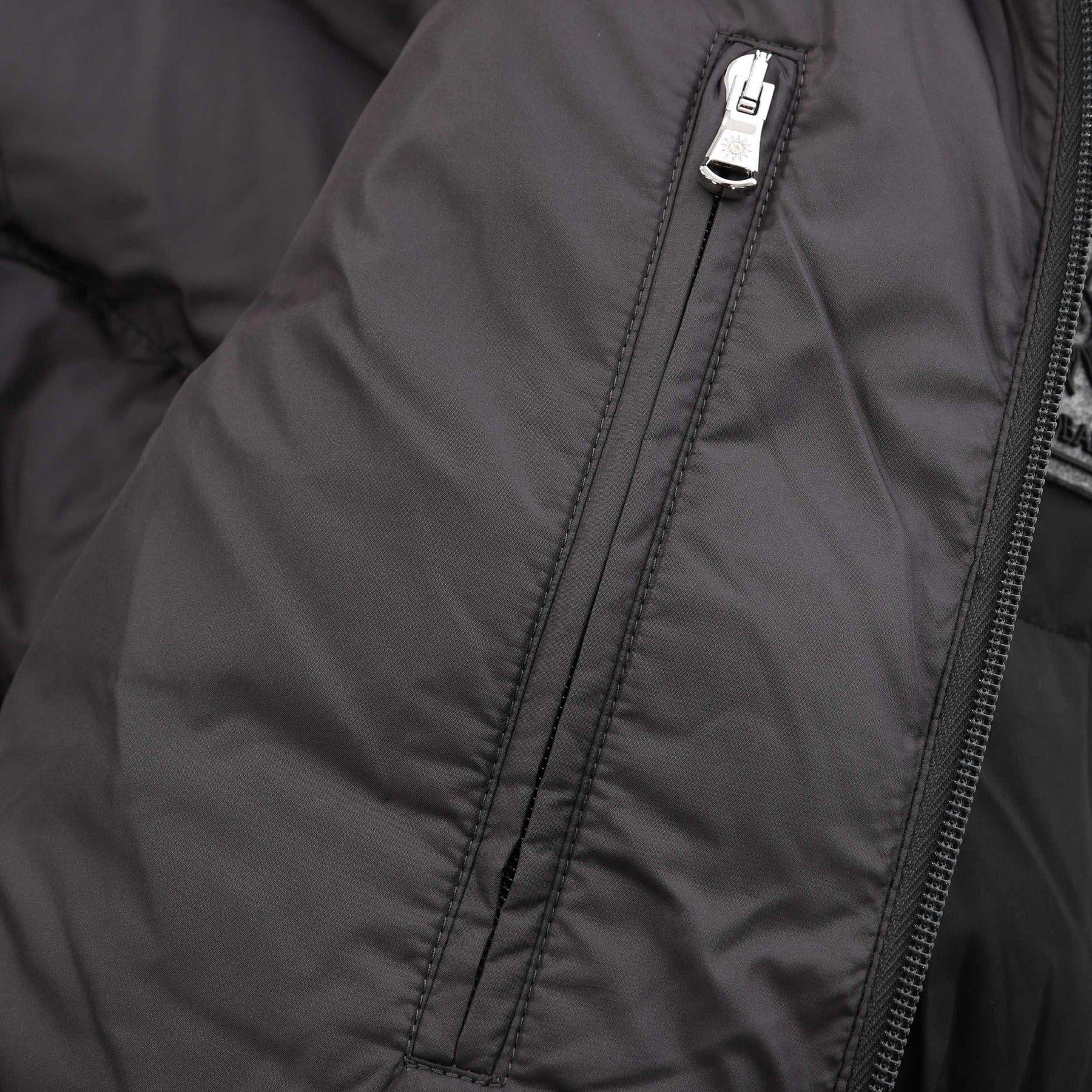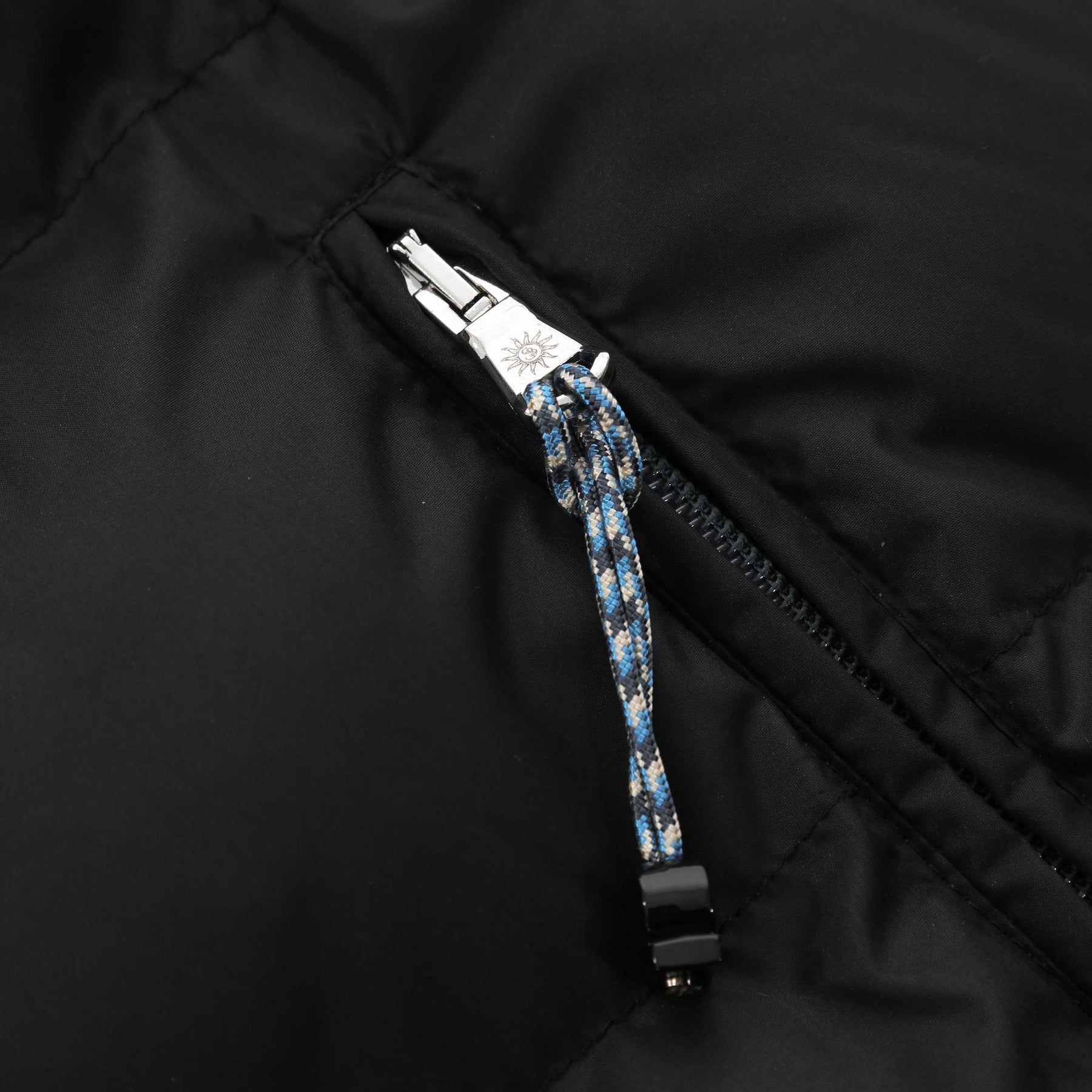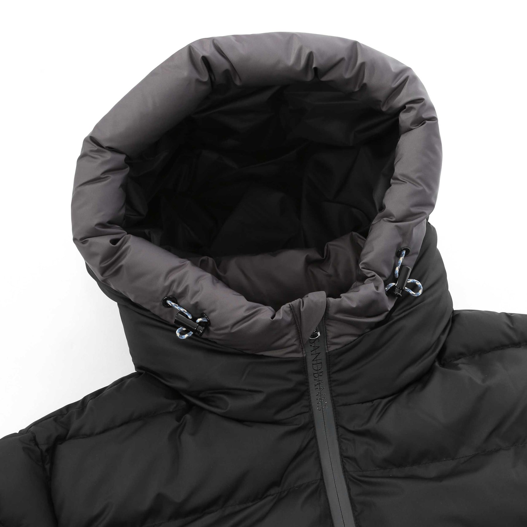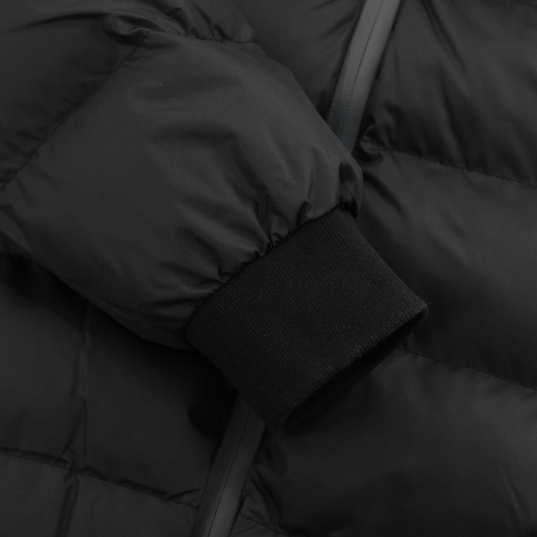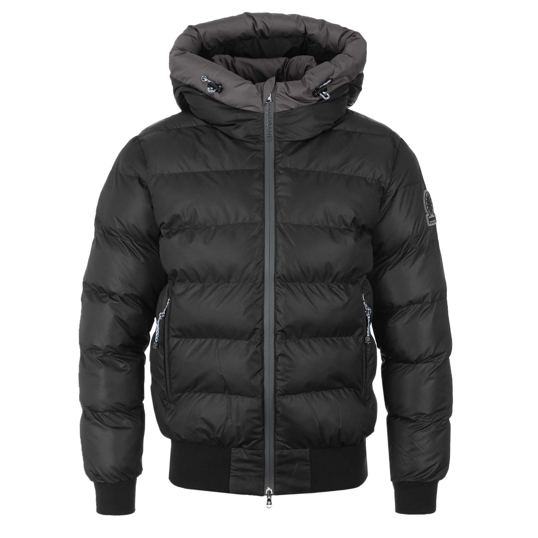 Sandbanks Apres Puffer Jacket in Black. A regular fit bomber style puffer jacket by Sandbanks. Two way fastening zip placket to the front. Hood with elasticated drawstrings. Contrasting colour trim to the hood. Two way zipper front pockets. Branding to the zip placket. Elasticated ribbed cuffs and waistband. Embroidered Sandbanks logo badge to the sleeve.