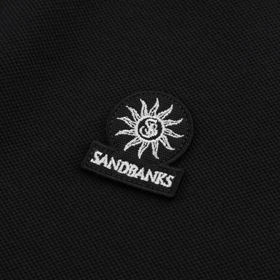 Sandbanks Badge Logo Polo Shirt in Black. Polo shirt by Sandbanks. A regular fitting polo shirt with short sleeves. Classic style polo collar with a 2 button fastening placket. Tri-colour tipped collar and cuffs. Constructed from a mercerised cotton for a luxurious feel. Sandbanks embroidered logo to the chest.