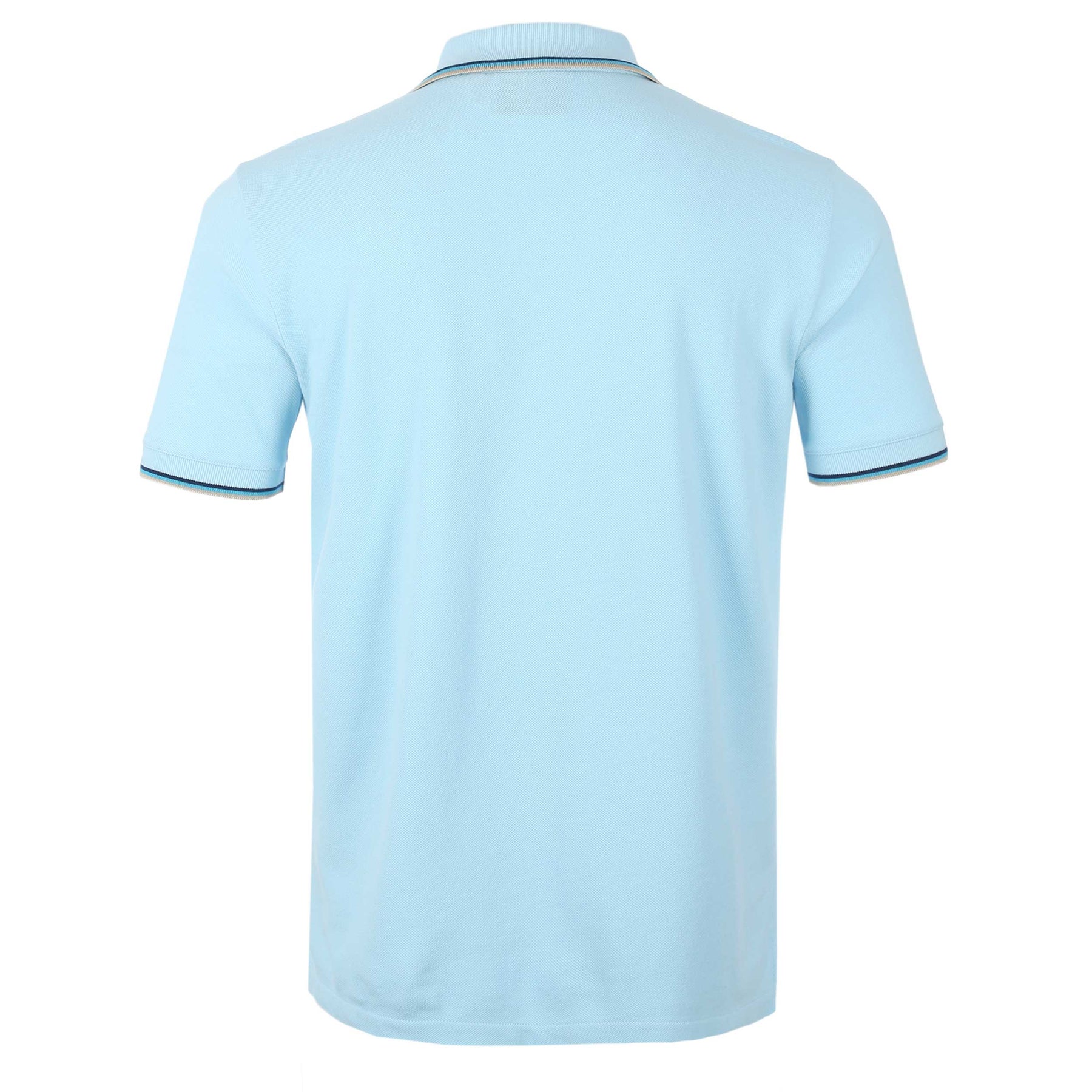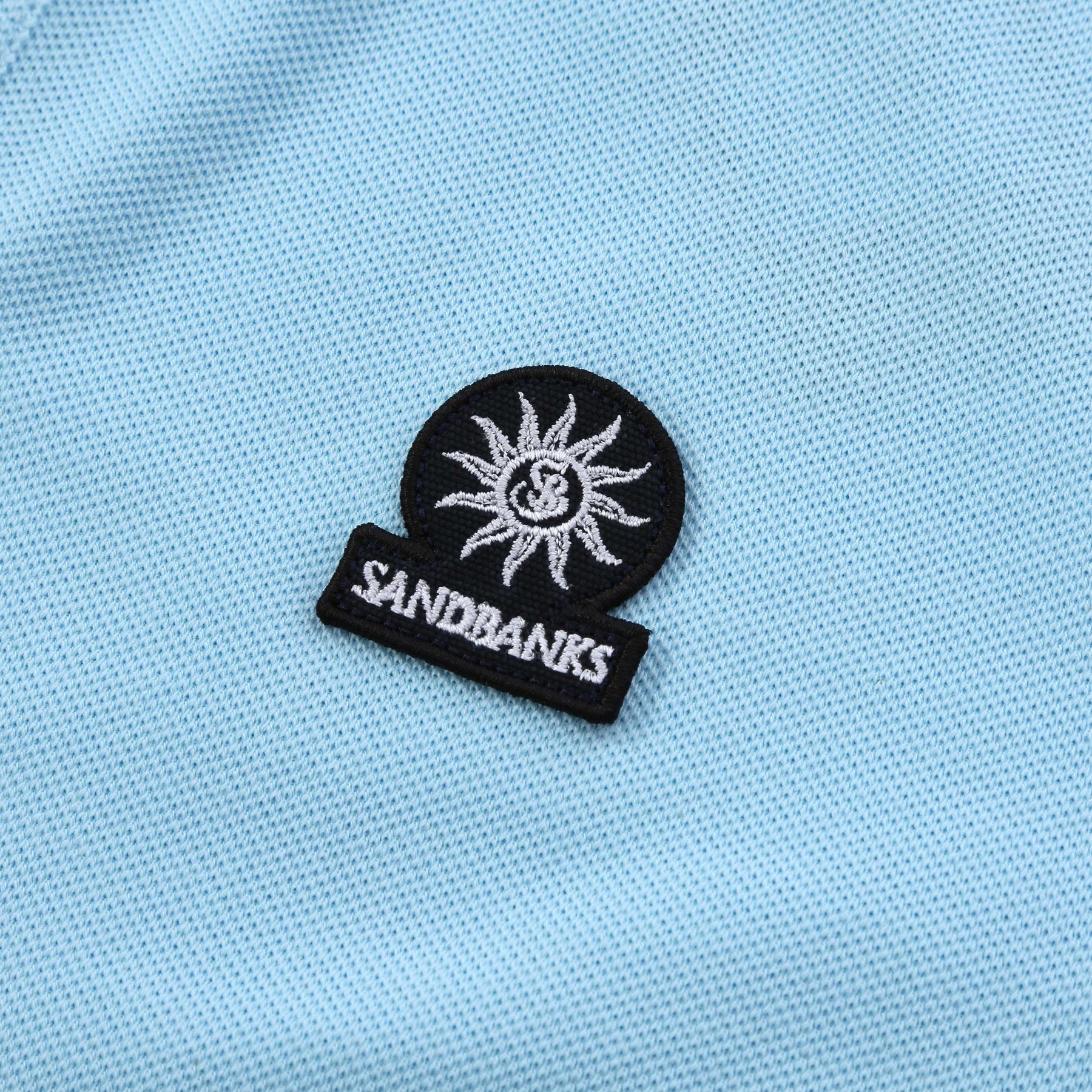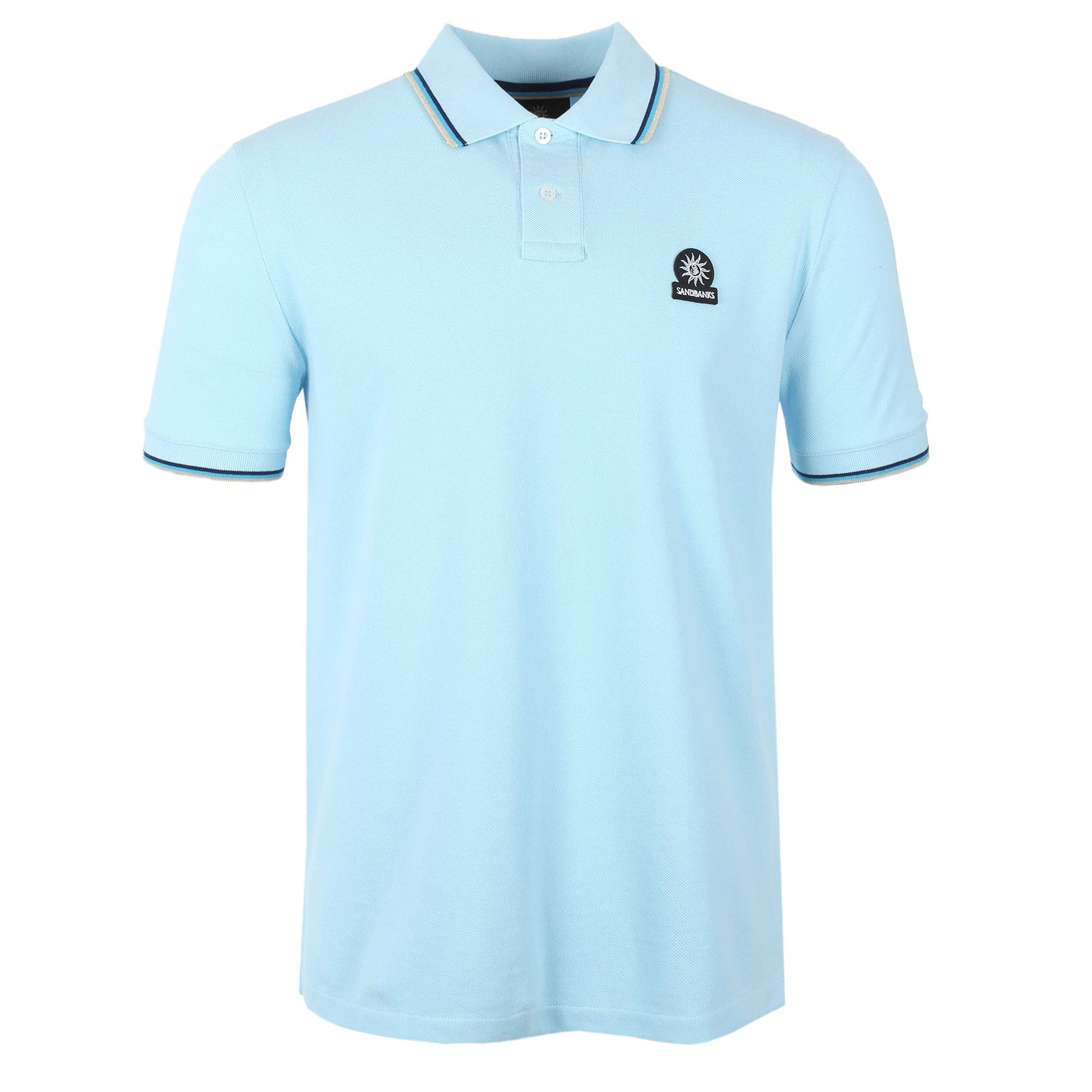 Sandbanks Badge Logo Tipped Polo Shirt in Crystal Blue. Polo shirt by Sandbanks. A regular fitting polo shirt with short sleeves. Classic style polo collar with a 2 button fastening placket. Tri-colour tipped collar and cuffs. Constructed from a mercerised cotton for a luxurious feel. Sandbanks embroidered logo to the chest.