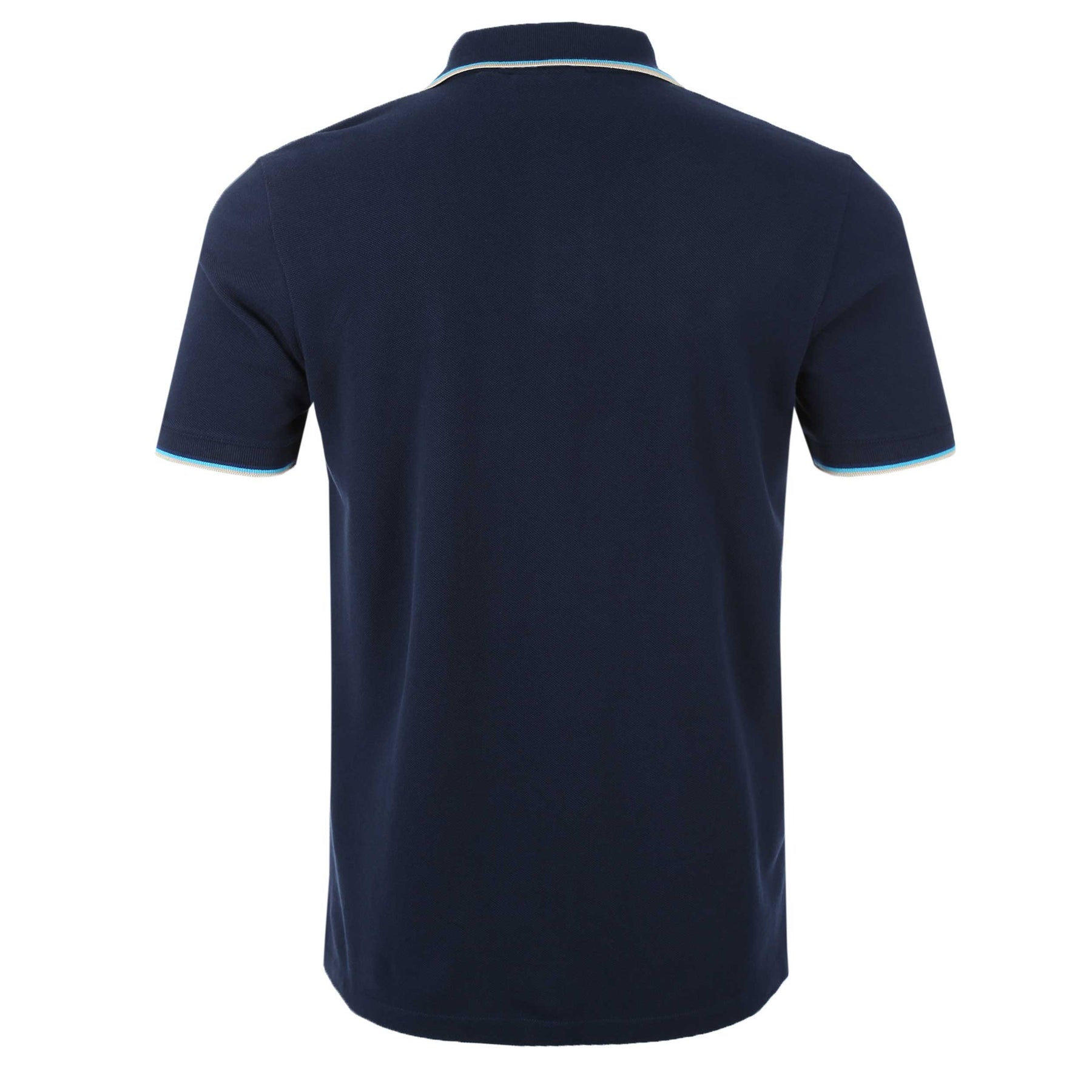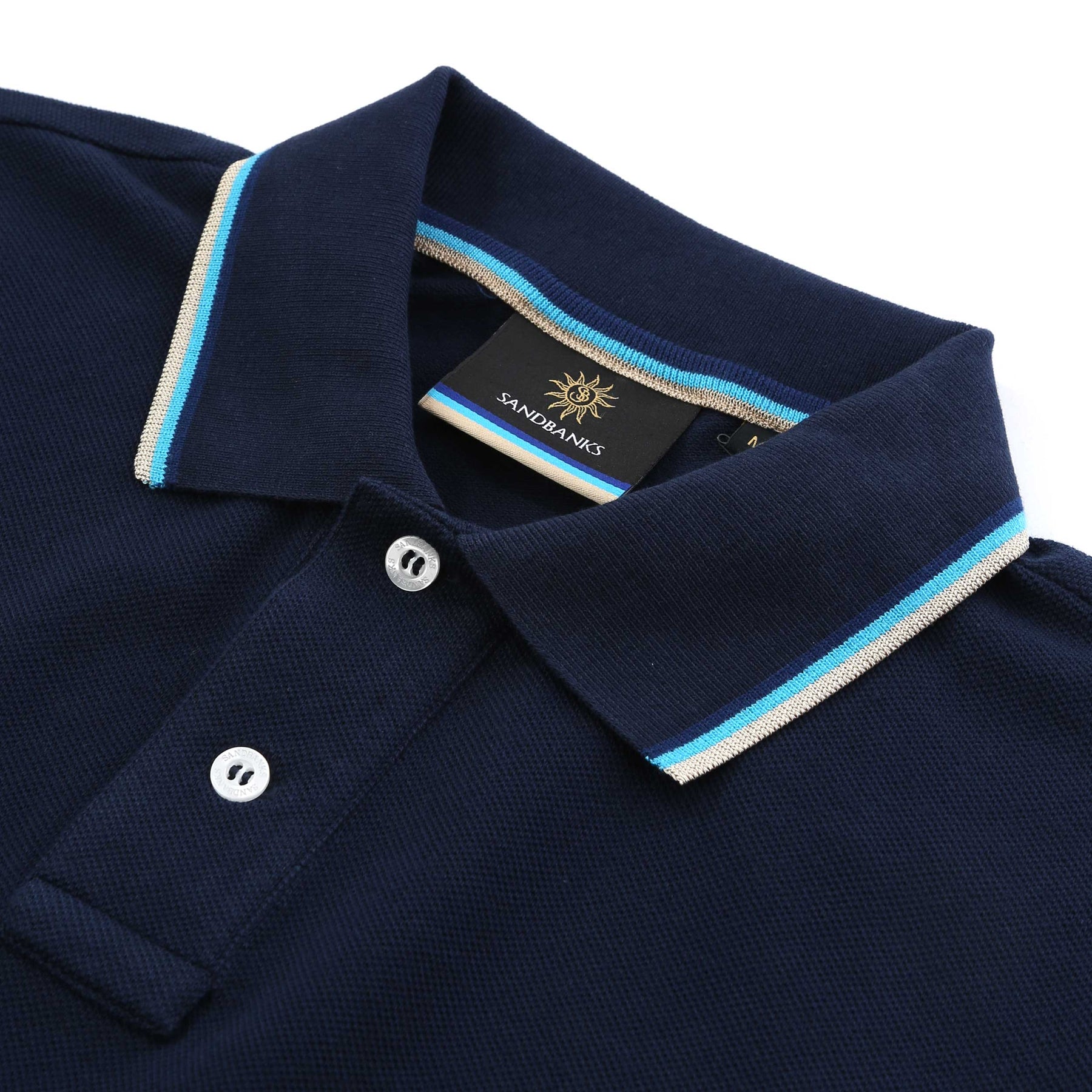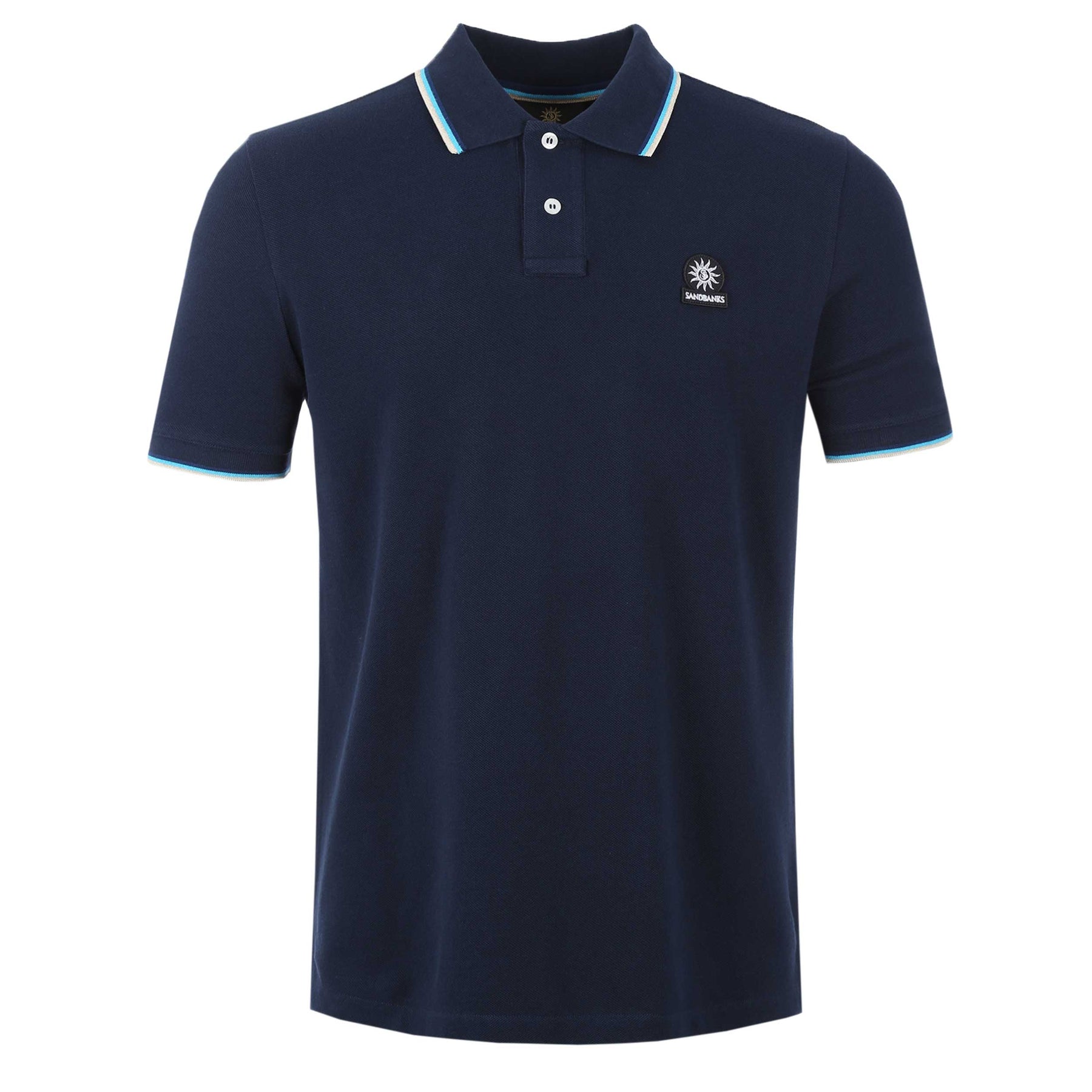 Sandbanks Badge Logo Tipped Polo Shirt in Navy. Polo shirt by Sandbanks. A regular fitting polo shirt with short sleeves. Classic style polo collar with a 2 button fastening placket. Tri-colour tipped collar and cuffs. Constructed from a mercerised cotton for a luxurious feel. Sandbanks embroidered logo to the chest.