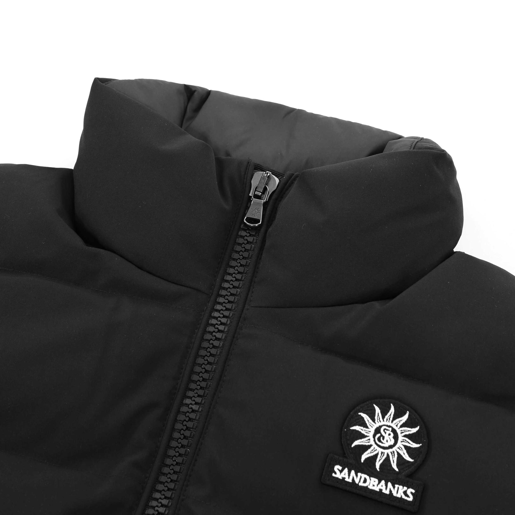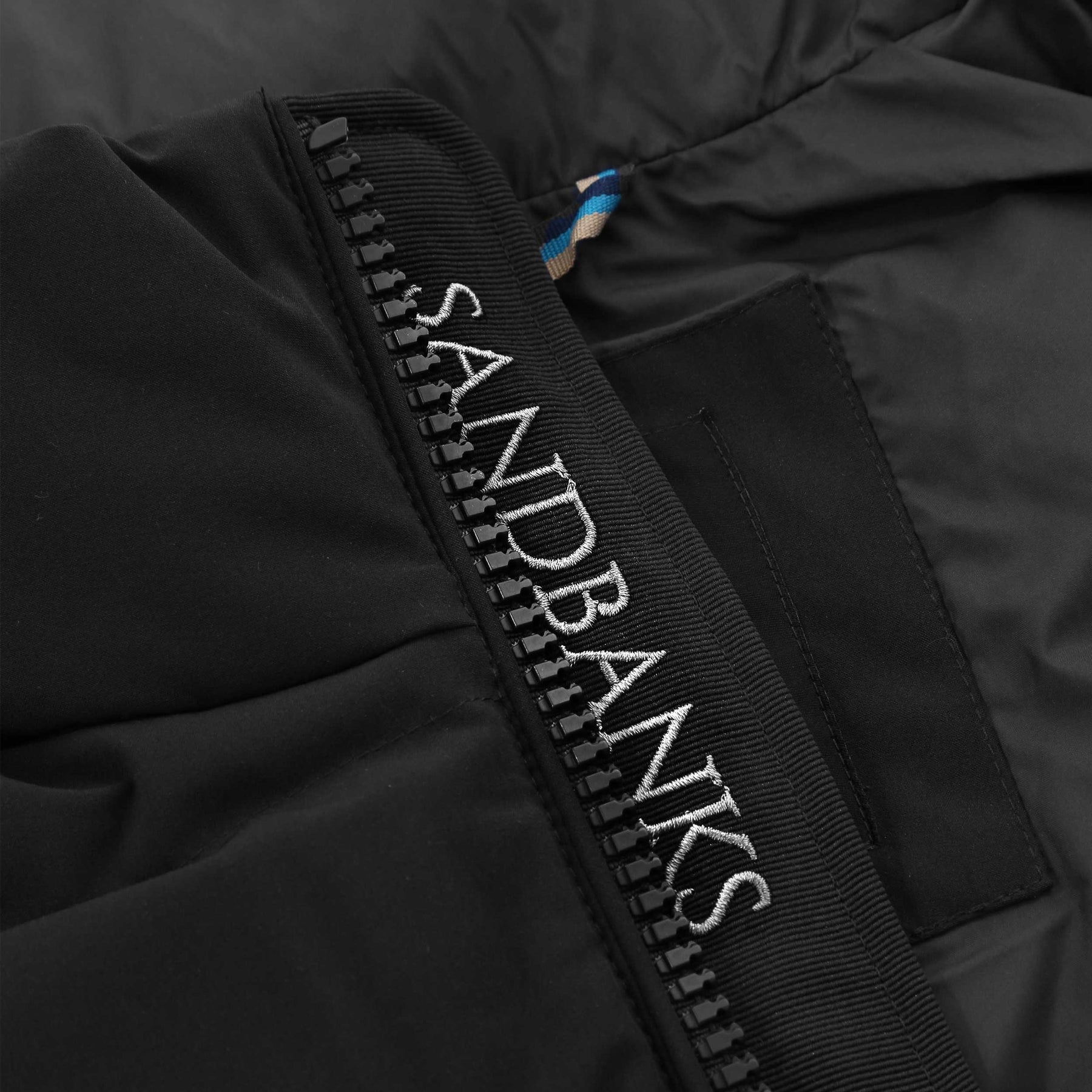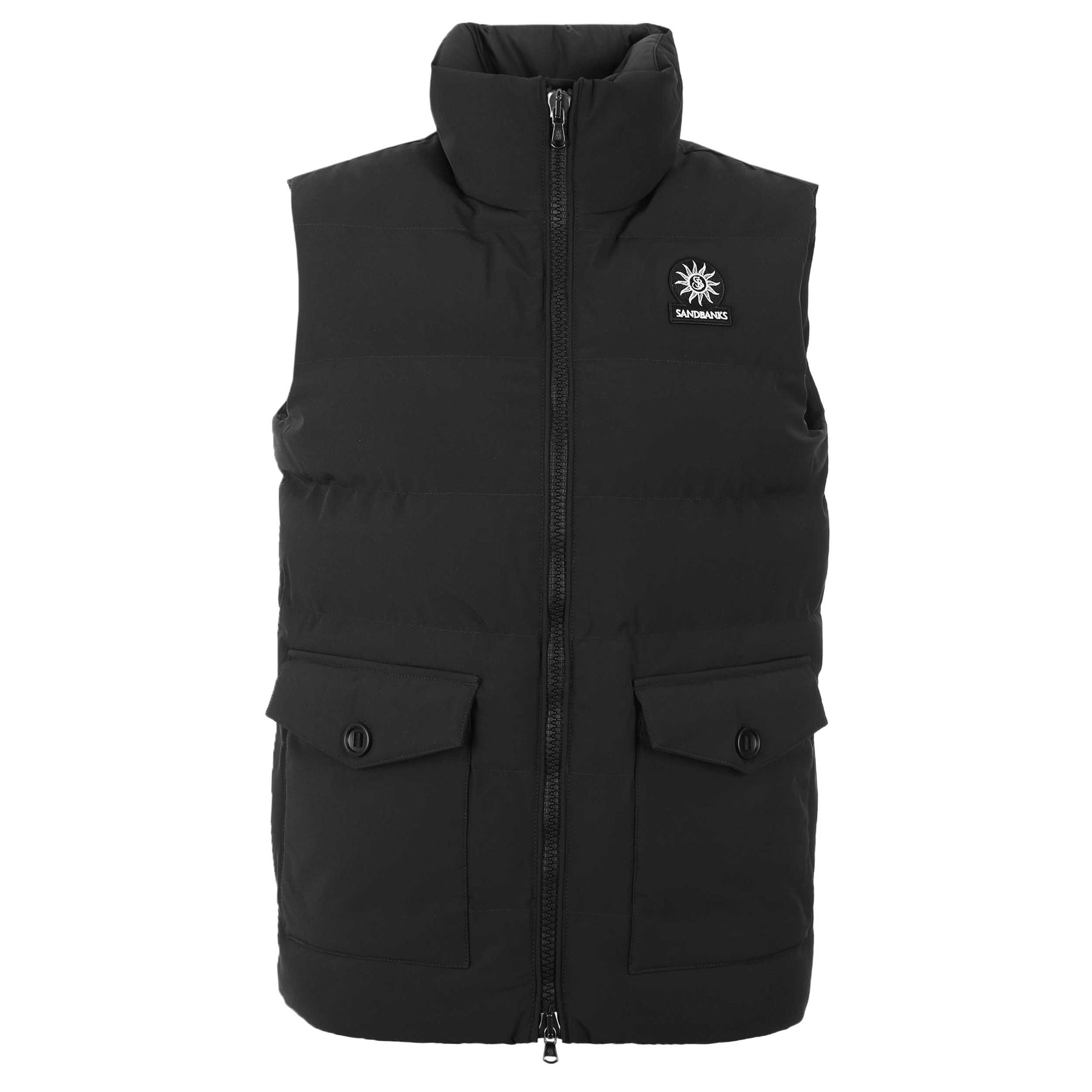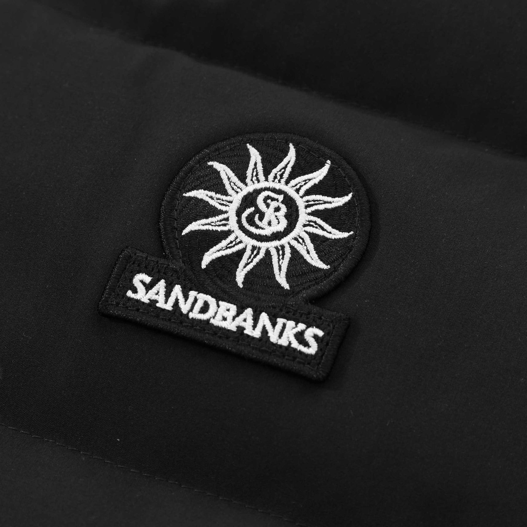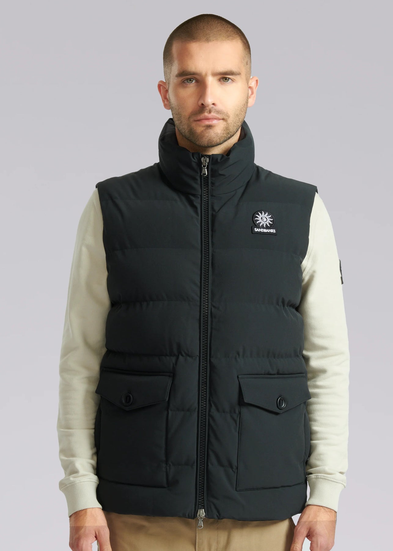 Sandbanks Explorer Gilet in Black. This Sandbanks gilet with its padding feature, keeps your body warm. Full, two way zip closure with 2 large utility pockets tothe front. Sandbanks embroidered logo to the inside of the placket. Fleece lined concealed side pockets. Rubberised Sandbanks buttons to the pockets. This water-repellent gilet is perfect for those mild days. Finished off with a Sandbanks logo badge tothe chest.