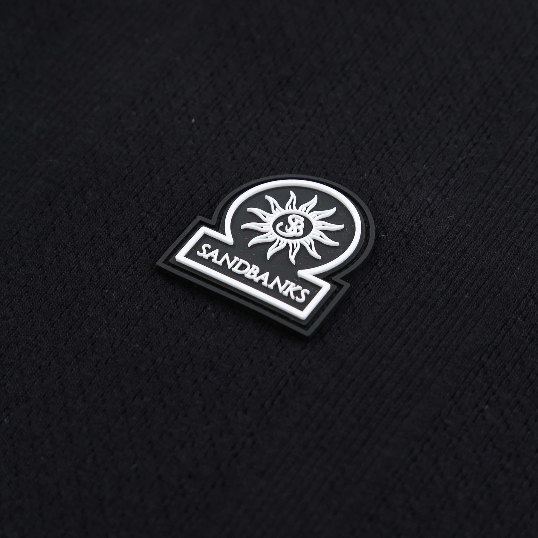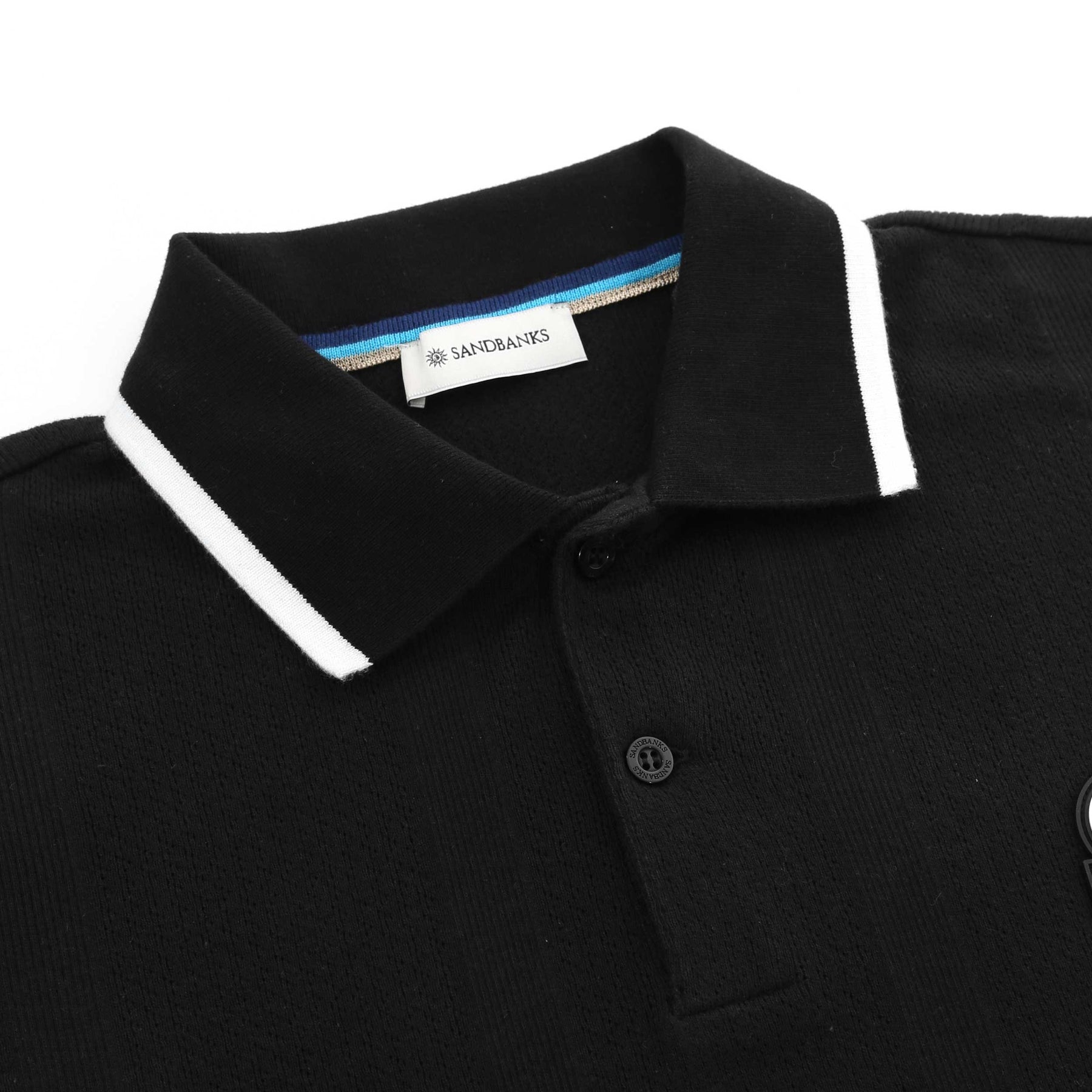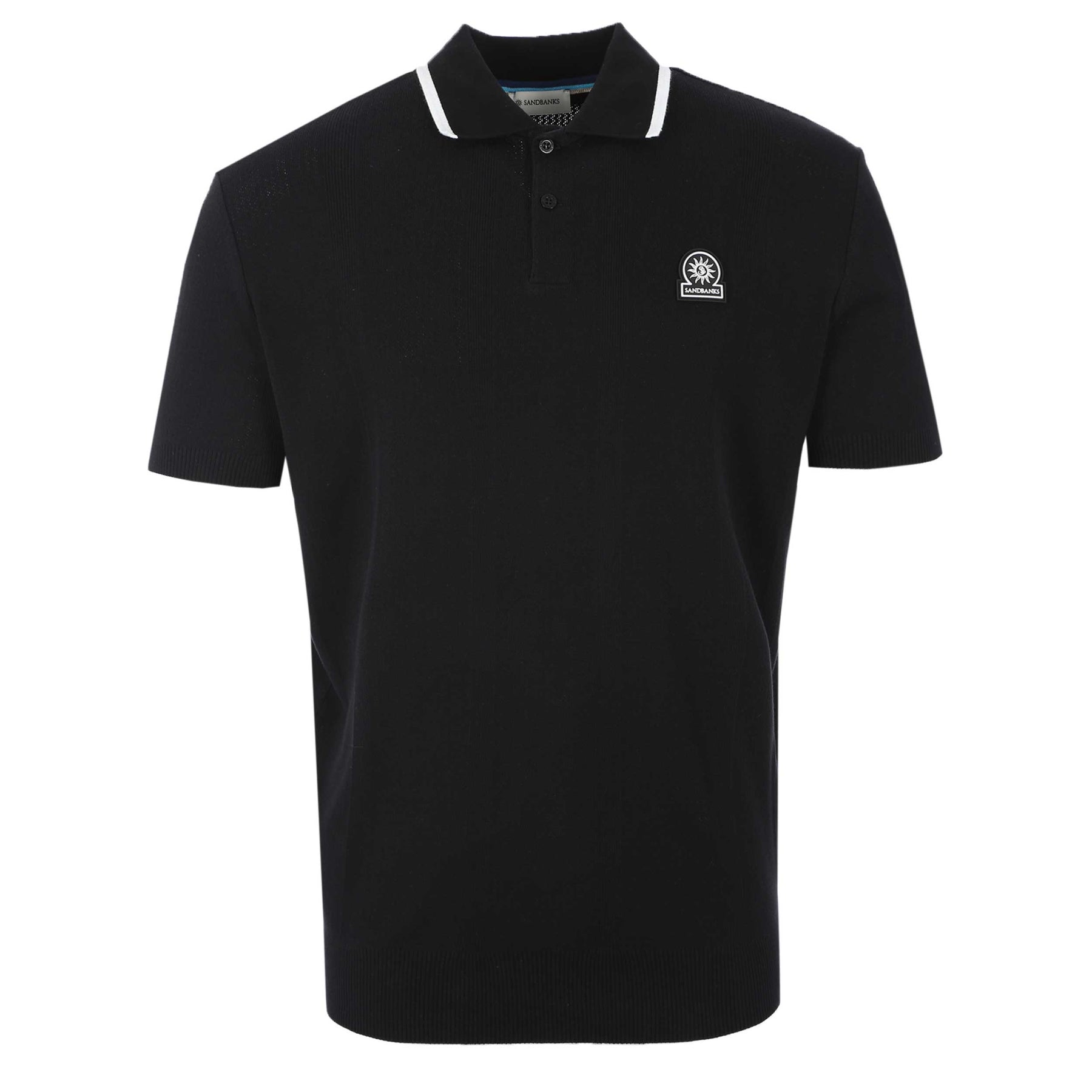 Sandbanks Jacquard Stripe Knit Polo Shirt in Black. Polo shirt by Sandbanks. A regular fitting plain design polo shirt with short sleeves. Classic style polo collar with a 2 button fastening placket. Jacquard stripe design throughout the polo shirt. Contrasting trim detailing to the collar and cuffs. Sandbanks rubber logo to the chest.