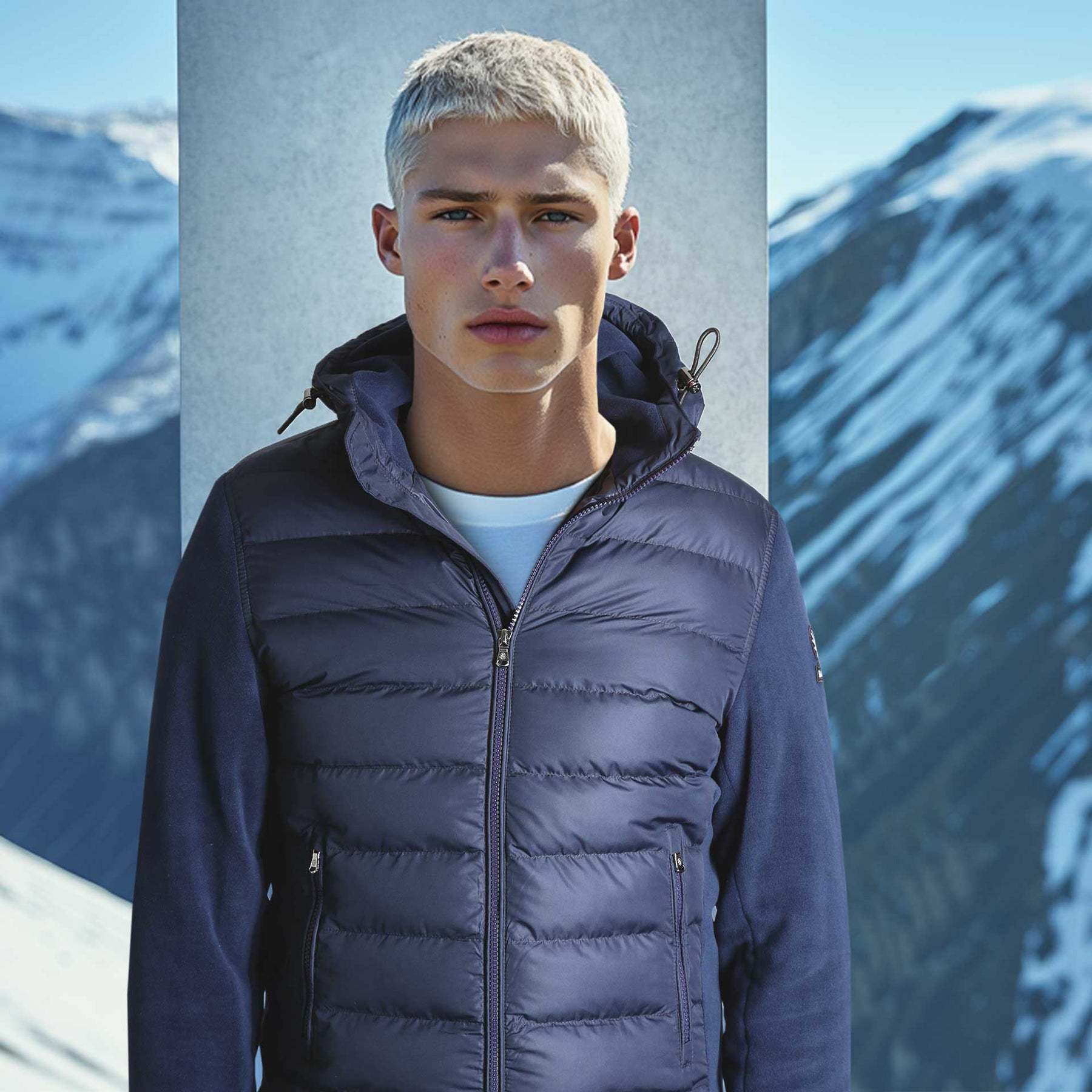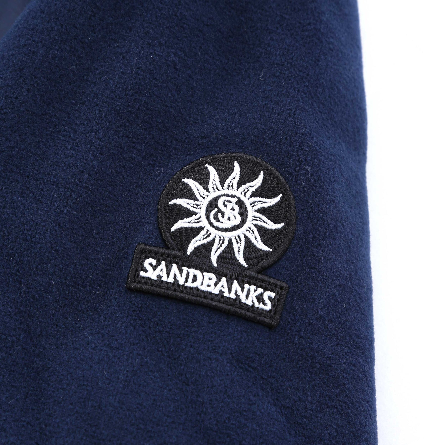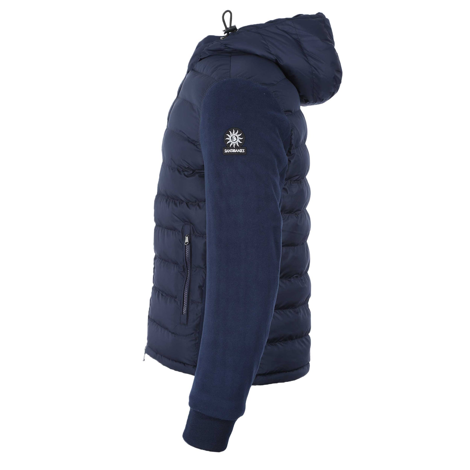 Sandbanks Polartec Hybrid Jacket in Navy. A regular fit puffer jacket by Sandbanks. Two way fastening zip placket to the front. Fleece lined hood with elasticated drawstrings. Contrasting quilted body. Fleece sleeves with elasticated ribbed cuffs. Adjustable waist with elasticated pulls. Two way zipper front pockets. Embroidered Sandbanks logo badge to the sleeve.