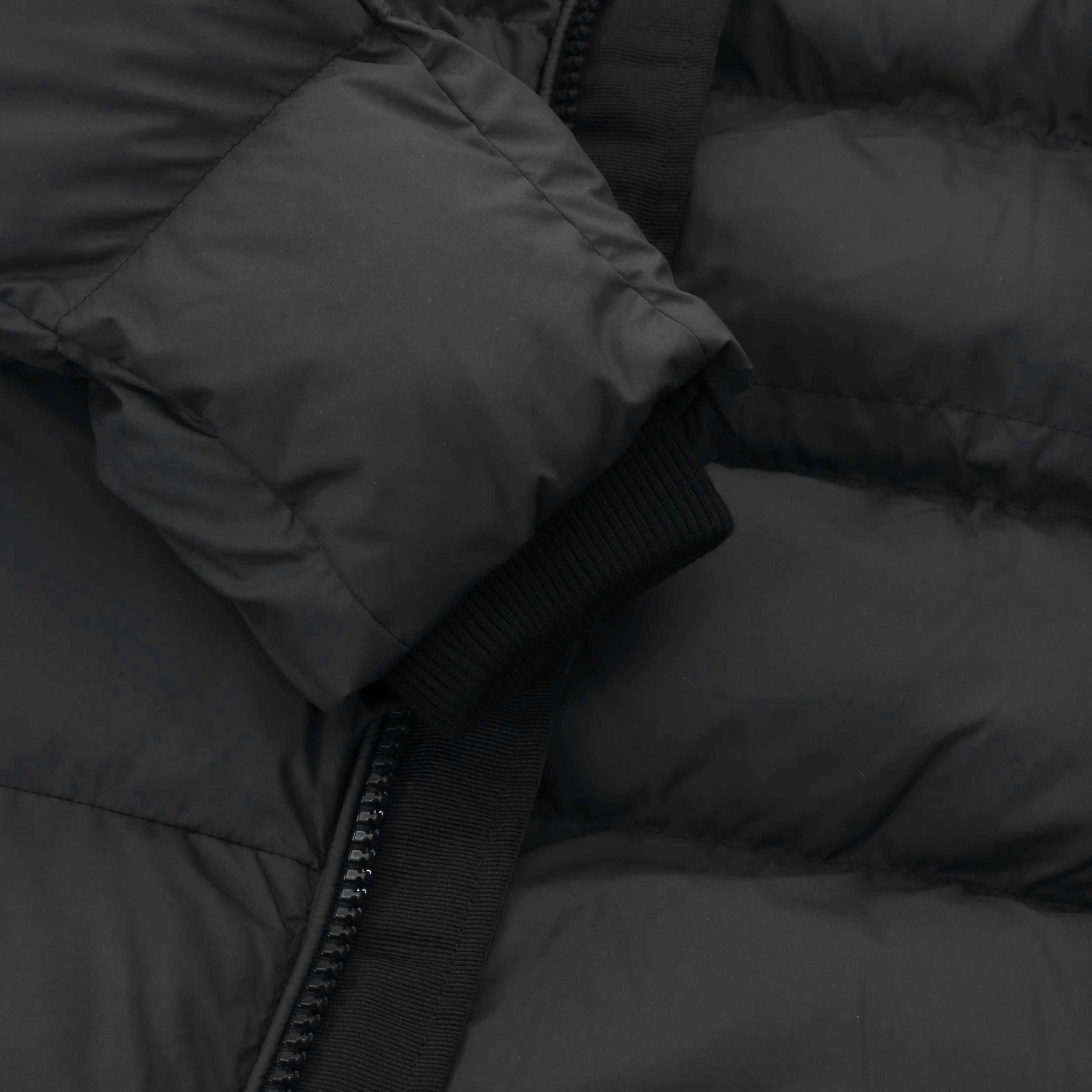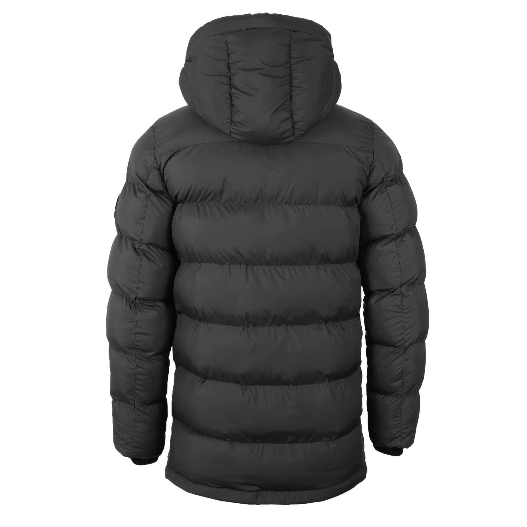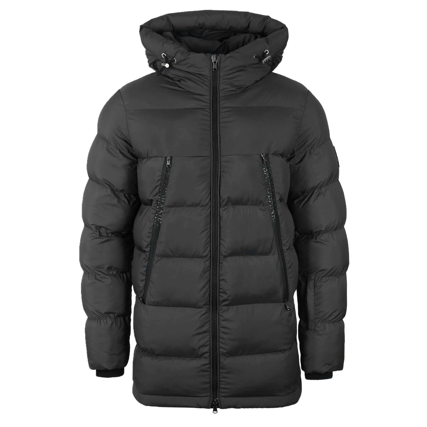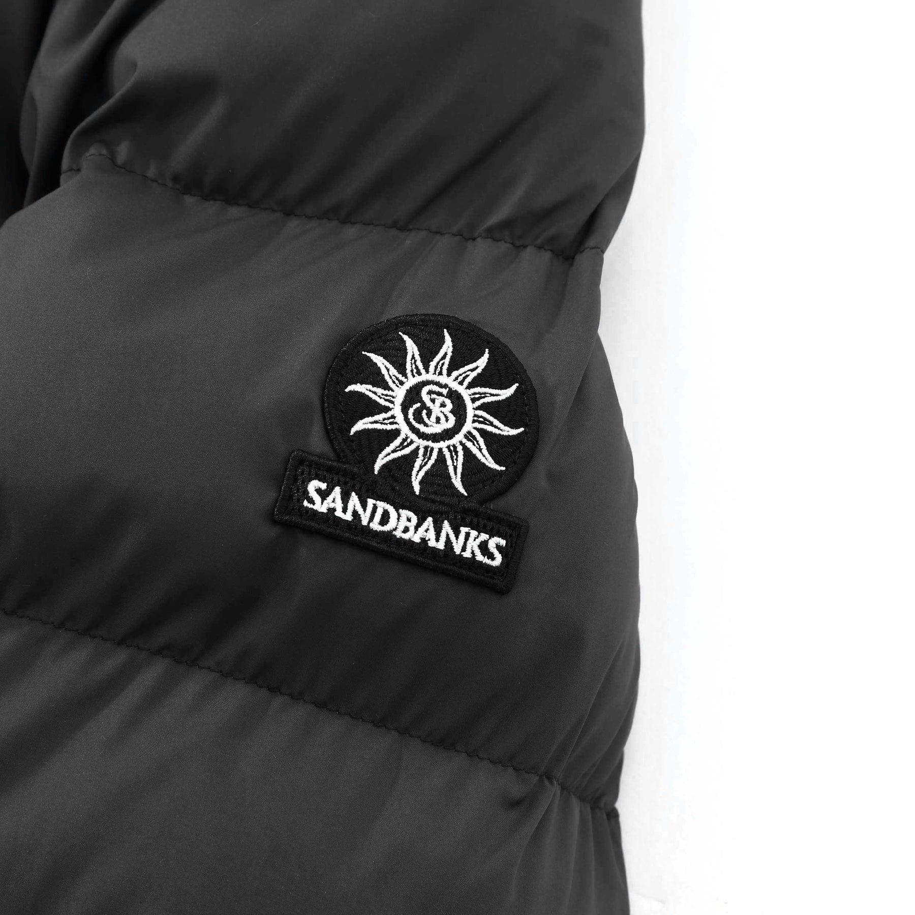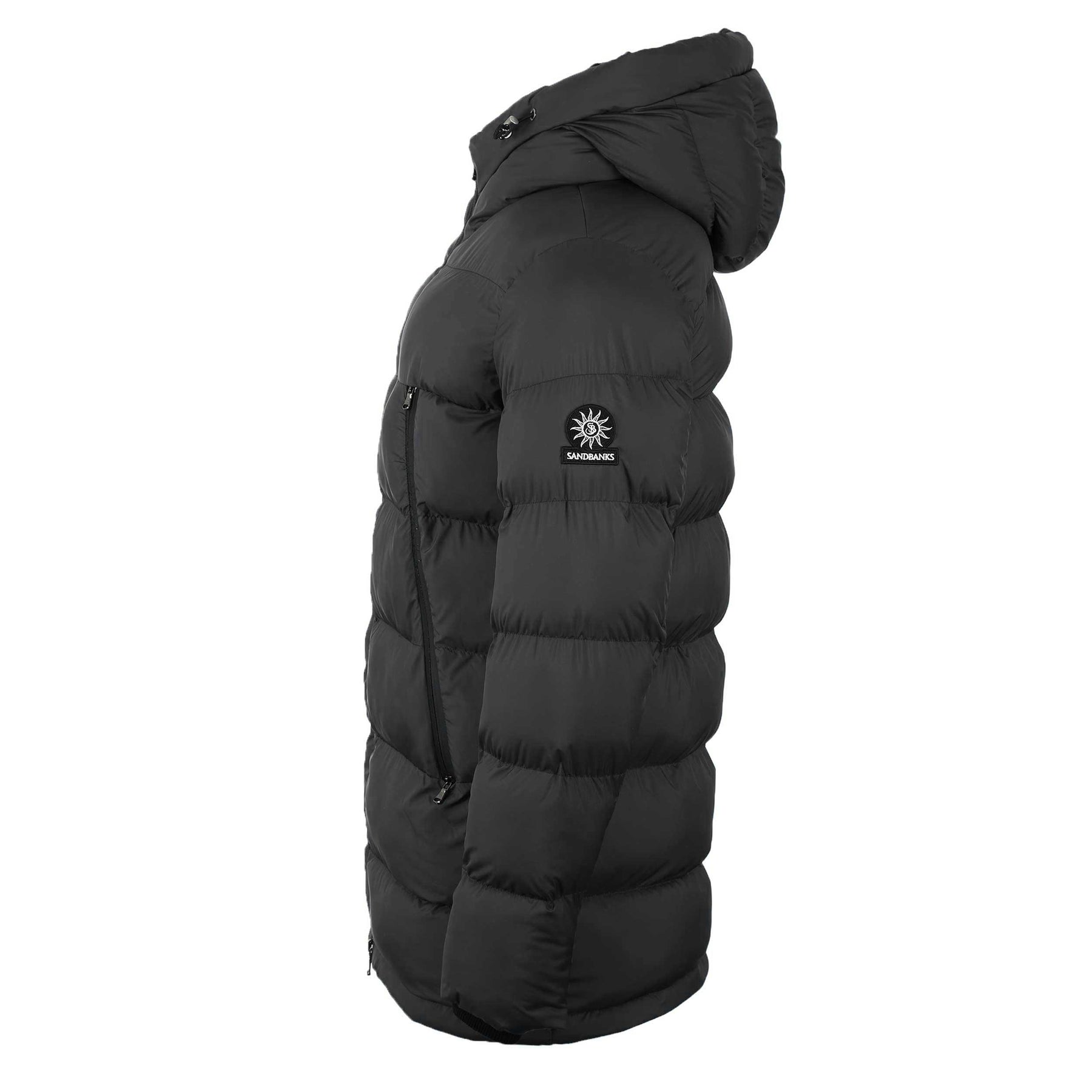 Sandbanks Ravine Mid Puffer Jacket in Black. A regular fit, mid length puffer jacket by Sandbanks. Two way fastening zip placket to the front. Hood with elasticated drawstrings. Two way zipper front pockets with Sandbanks tape branding. Branded placket to the inner placket. Concealed ribbed cuffs. Embroidered Sandbanks logo badge to the sleeve.