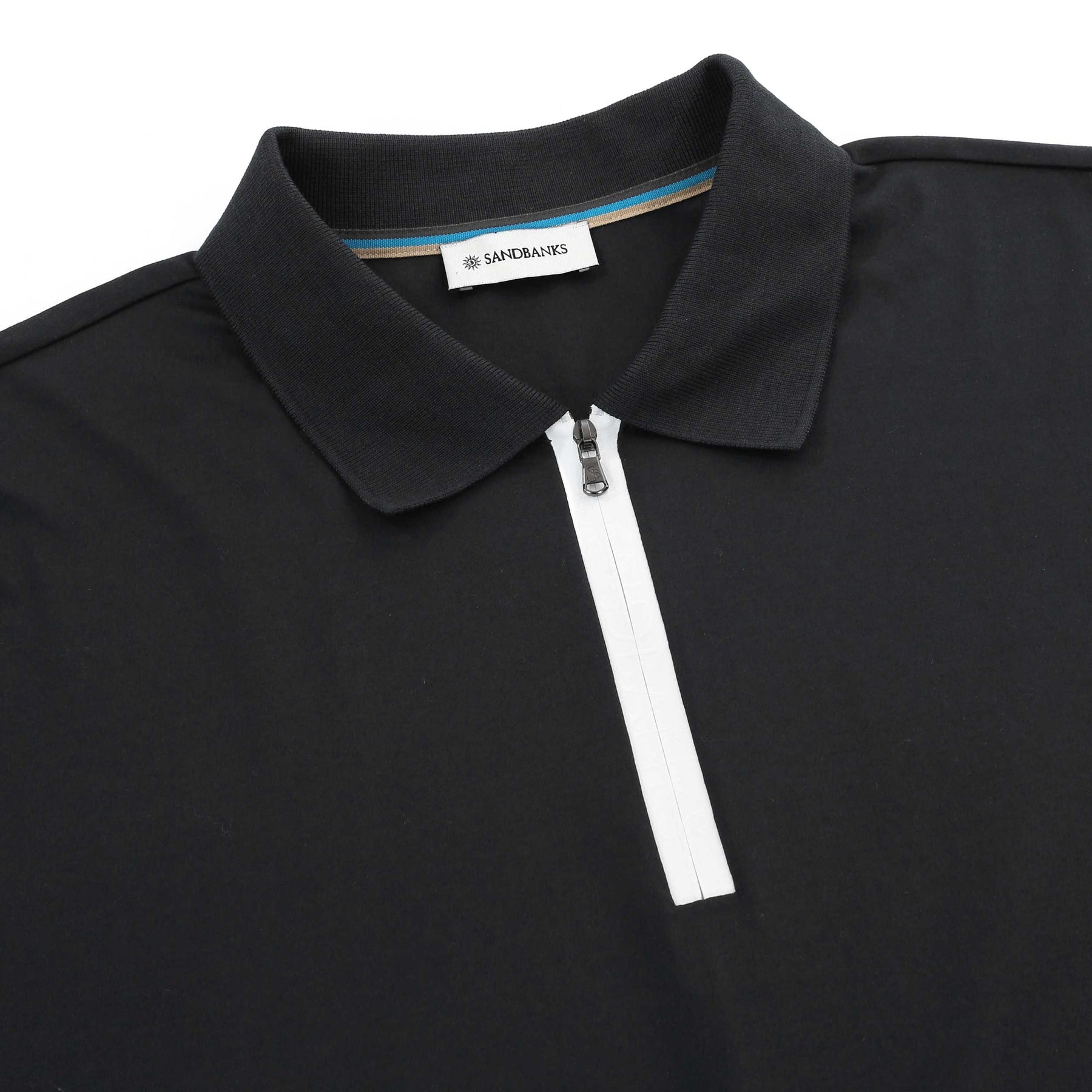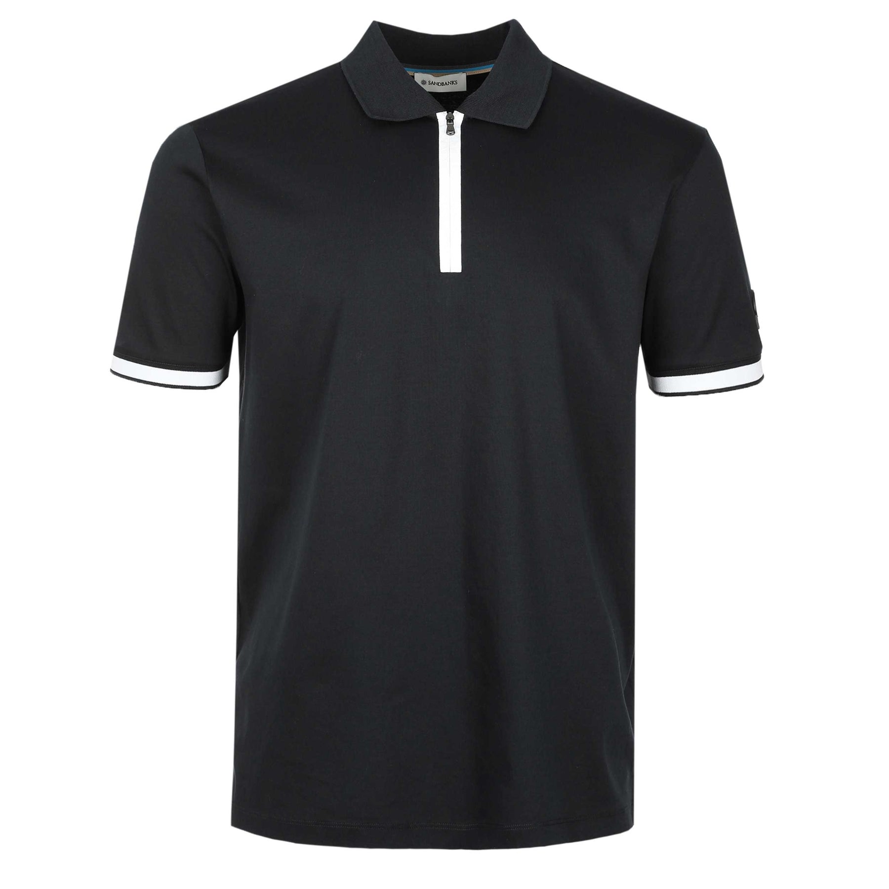 Sandbanks Silicone Zip Polo Shirt in Black. Polo shirt by Sandbanks. A regular fitting polo shirt with short sleeves. Classic style polo collar with a zip fastening placket. Contrasting colour trim to the cuffs. Constructed from a mercerised cotton for a luxurious feel. Sandbanks rubberised logo to the sleeve.
