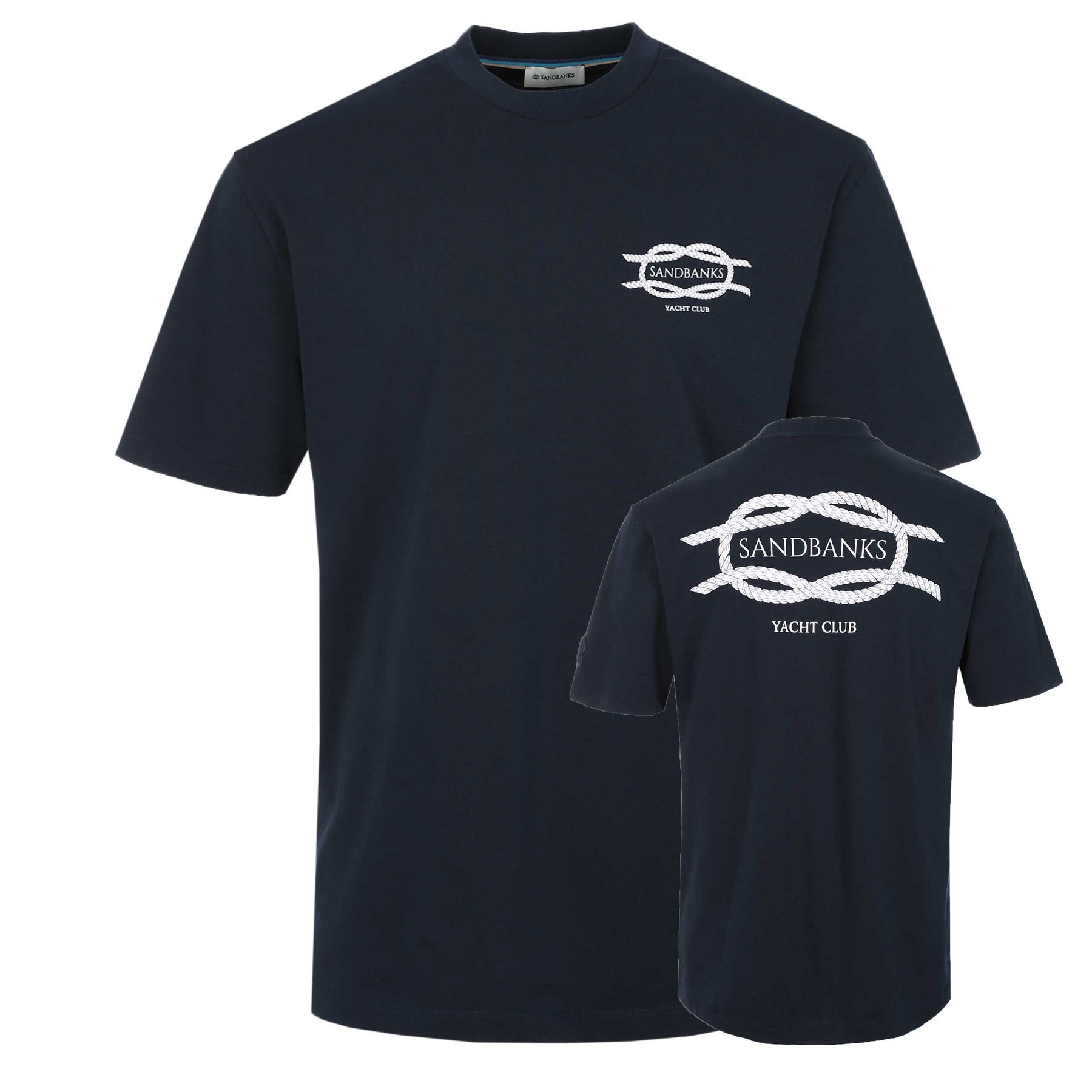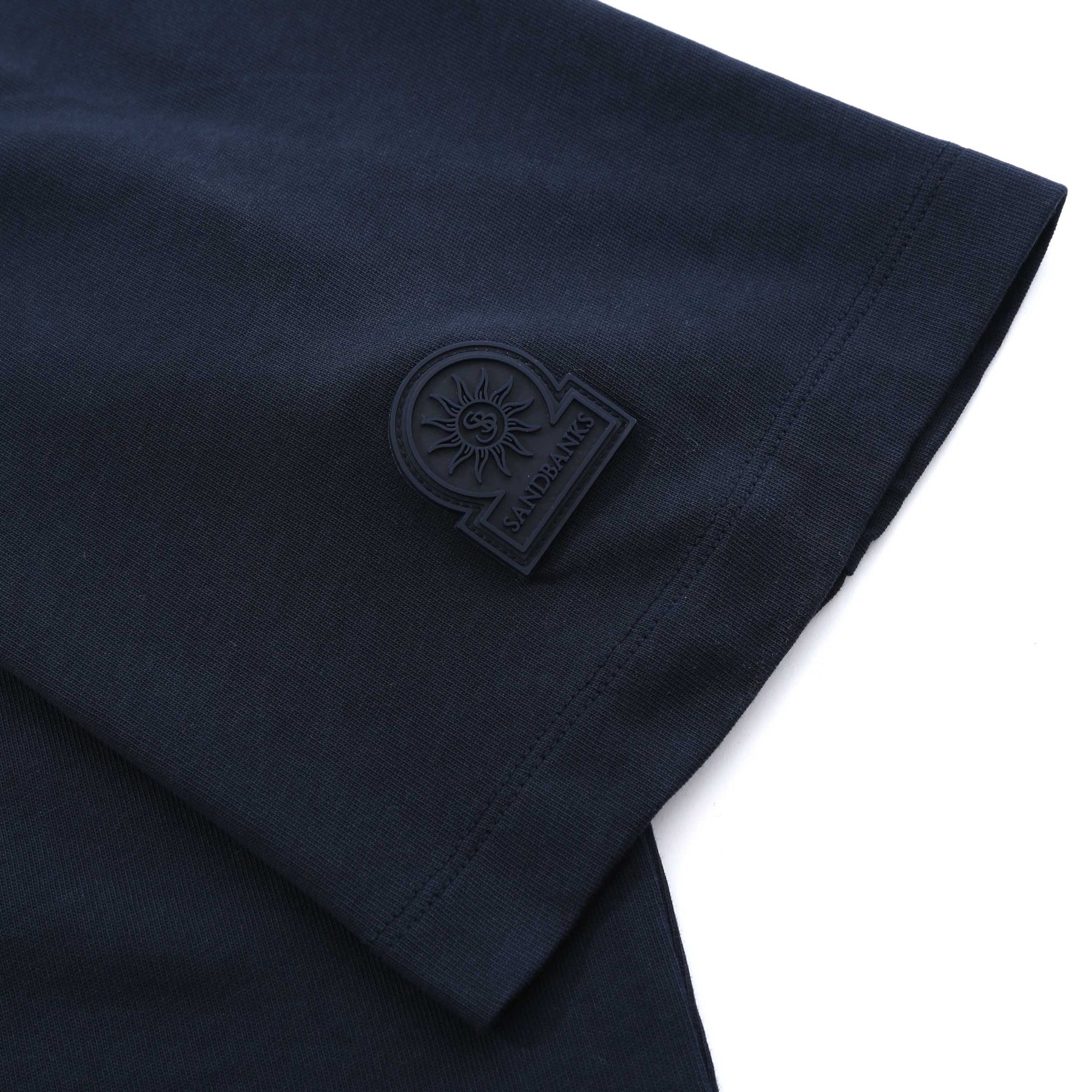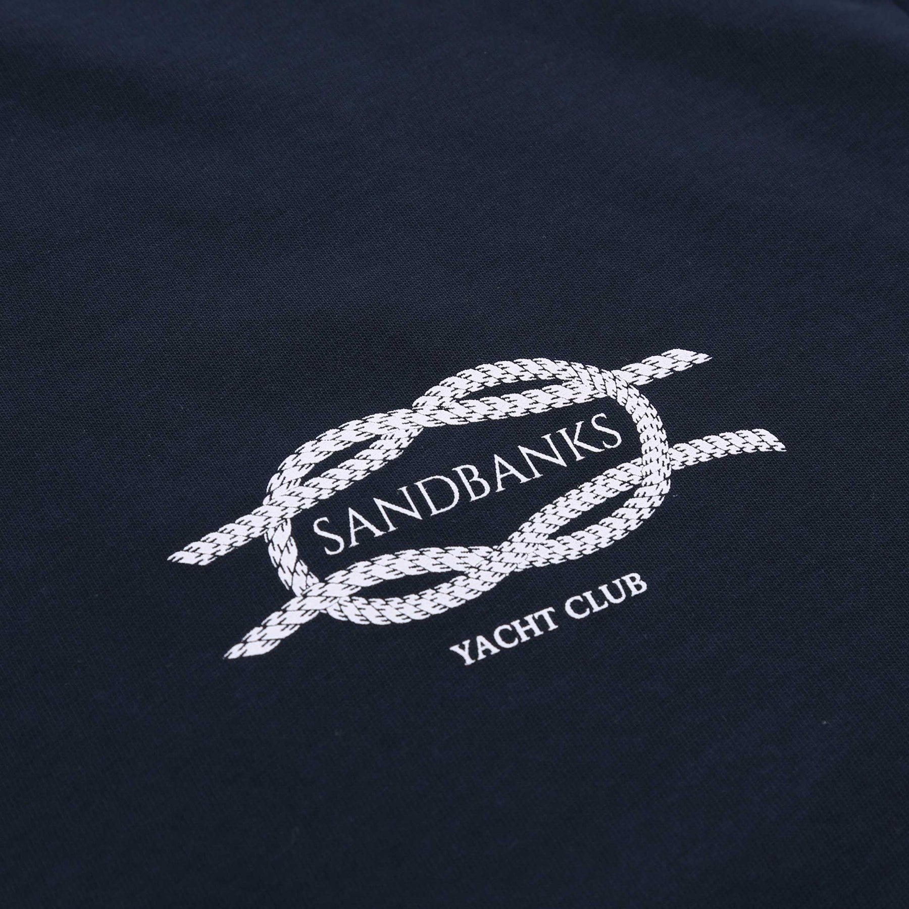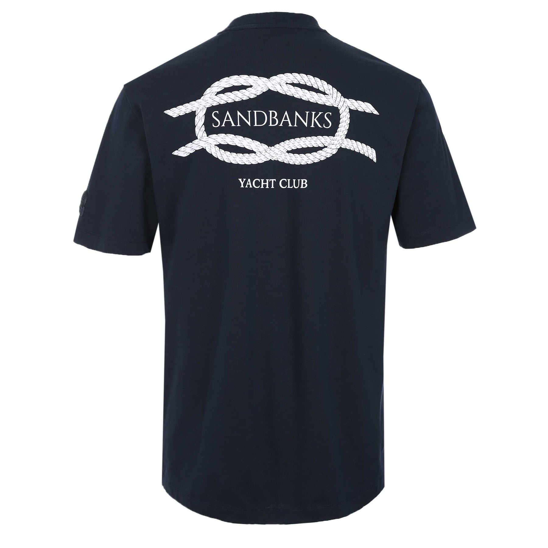 Sandbanks Yacht Club T Shirt in Navy. T-shirt by Sandbanks. Relaxed t shirt with short sleeves and a crew neck. Constructed from a mercerised cotton for a luxurious feel. Sandbanks Yacht club logos to the chest and back in a contrasting colour print. Tonal rubber Sandbanks log badge to the left sleeve.