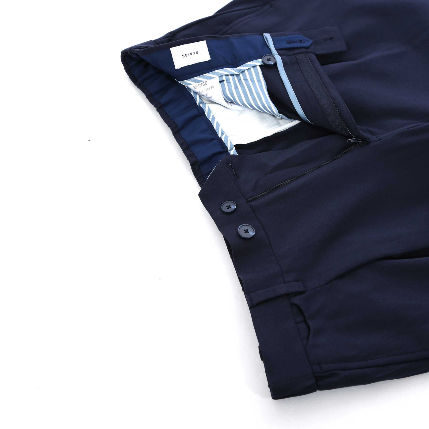 Seinse Basic Stretch Shirt in Navy. Stretch trouser by Seinse. These regular fit trousers arrive wityh a button and fly fastening. Partially elasticated waistband for added comfort. French pockets to the side with welt pockets on the seat on the trouser. Single pleats to the front of the trouser