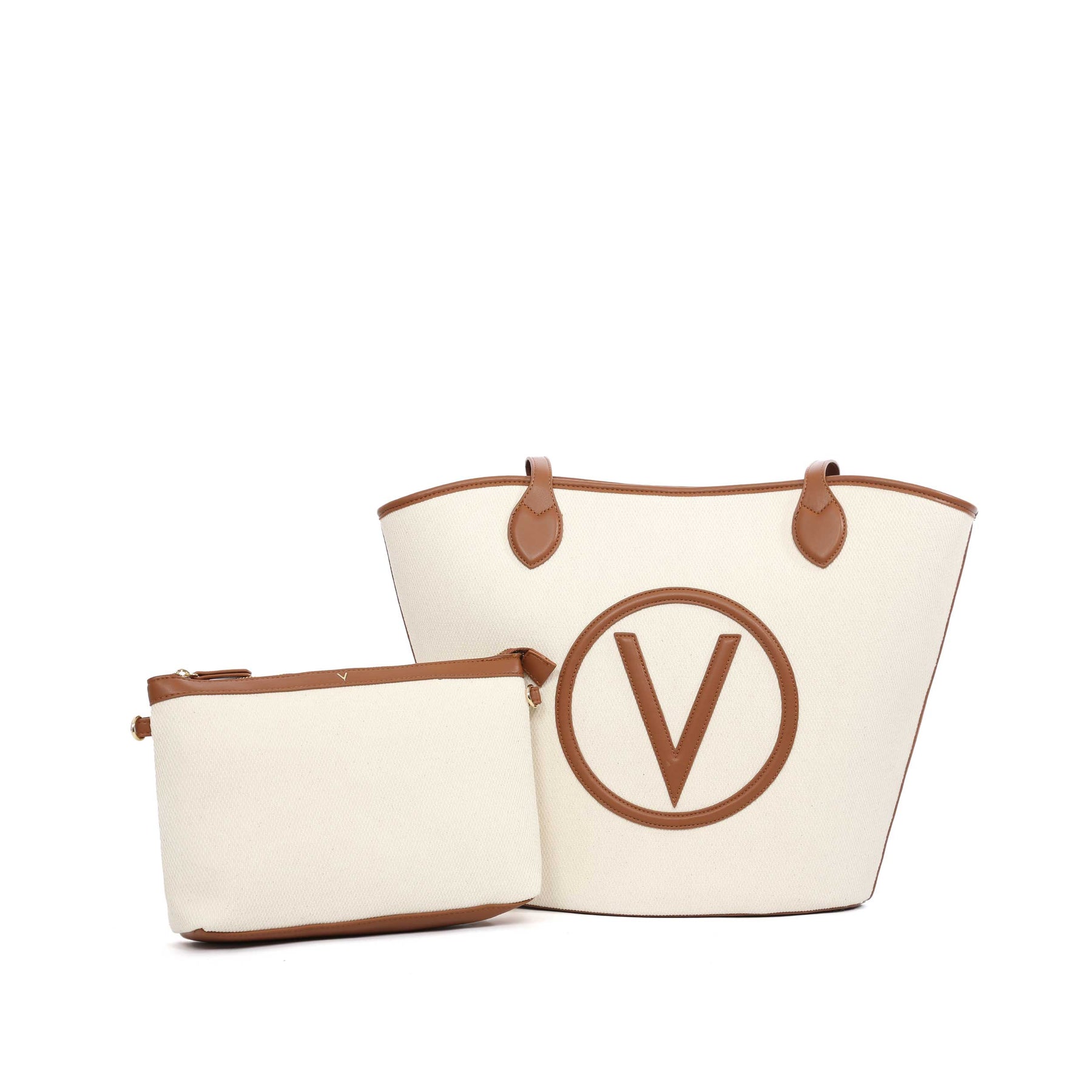 Valentino Bags Covent Ladies Beach Bag in Natural & Tan. A classic beach bag style by Valentino Bags. Constructed with a rattan basket weave design. Featuring a carrier handle and a large Valentino lettering logo. Clasp fastening to the inside. Matching clutch bag included. Contrasting trim in PU leather