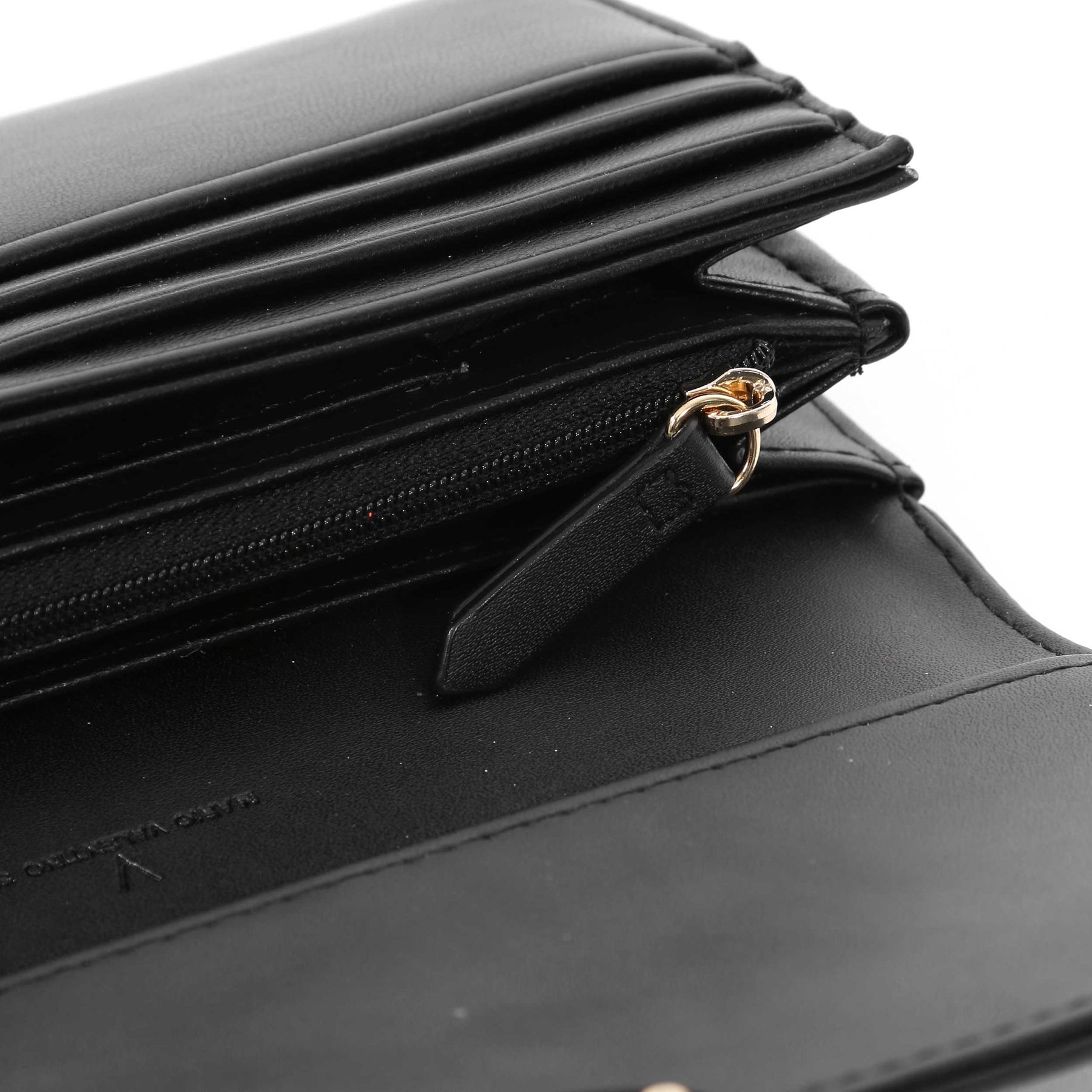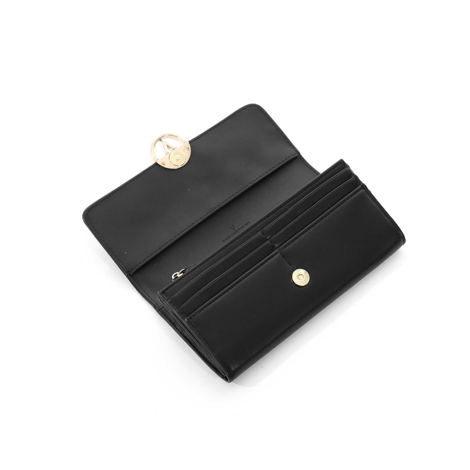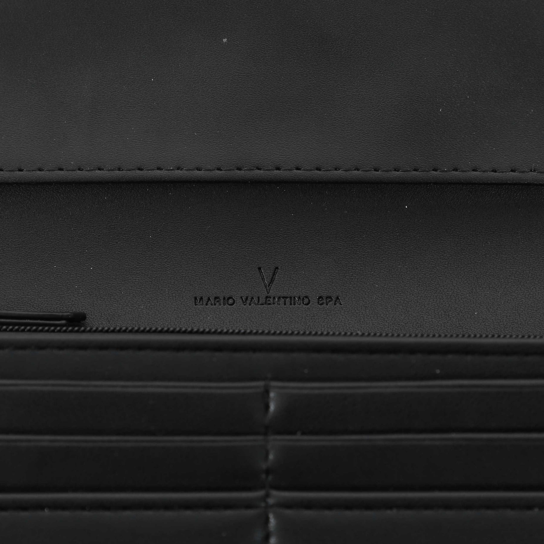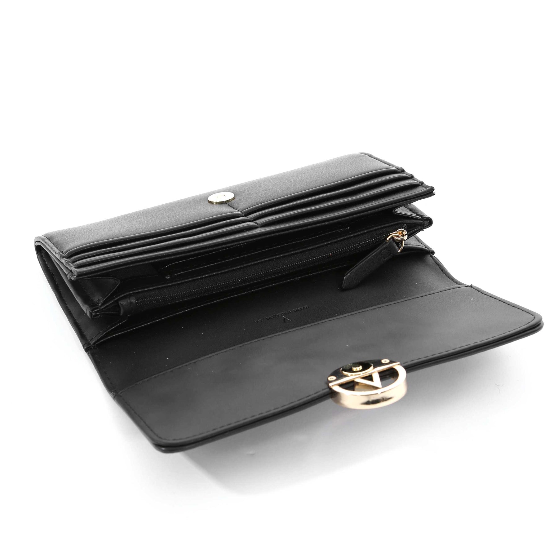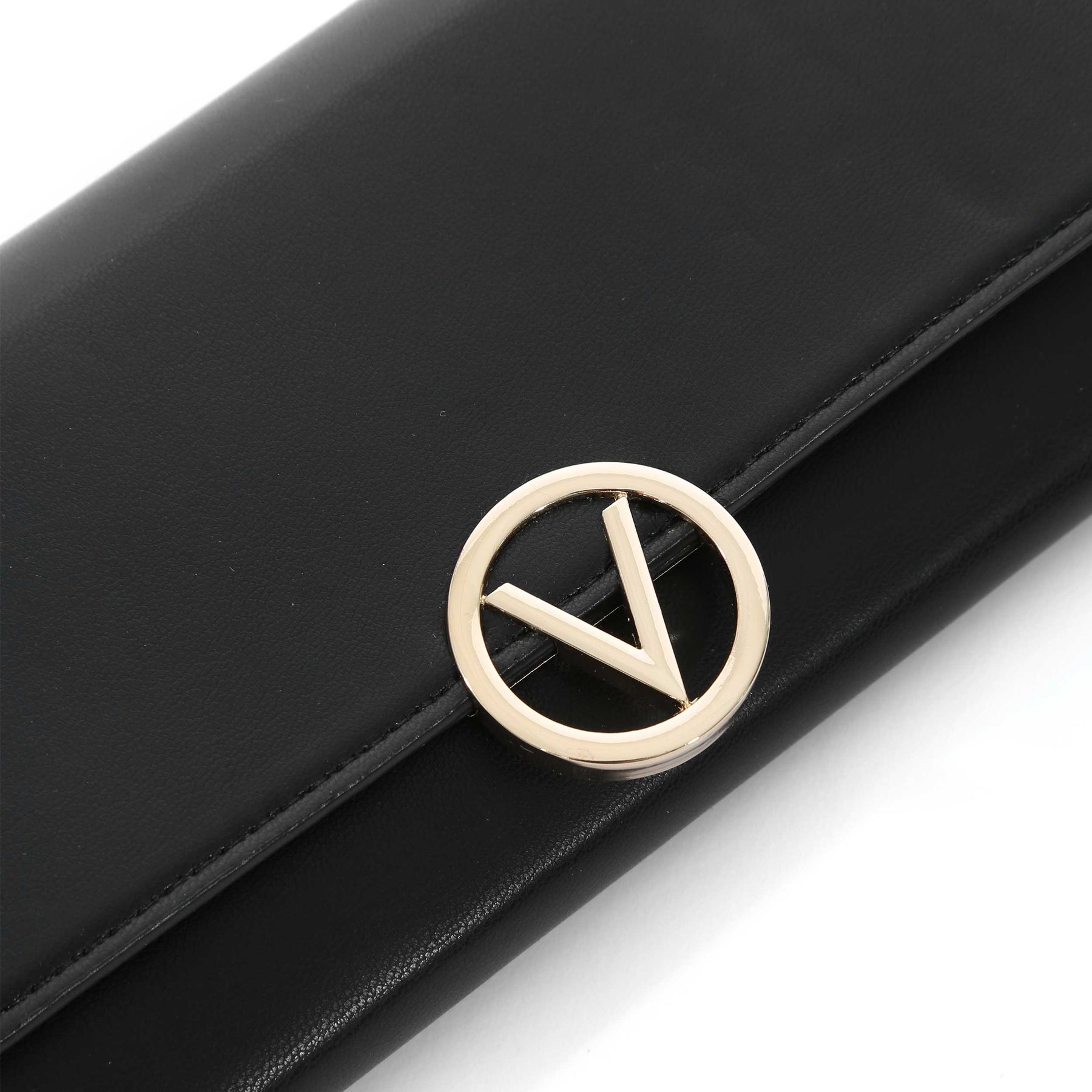 Valentino Bags July RE Ladies Purse in Black. Purse by Valentino by Mario Valentino. This ladies purse arrives in a plain PU leather design. It arrives with magnetic fastening and a signature Valentino V branding badge to the front. Zip compartment with multiple card slots and pockets for notes and coins.
