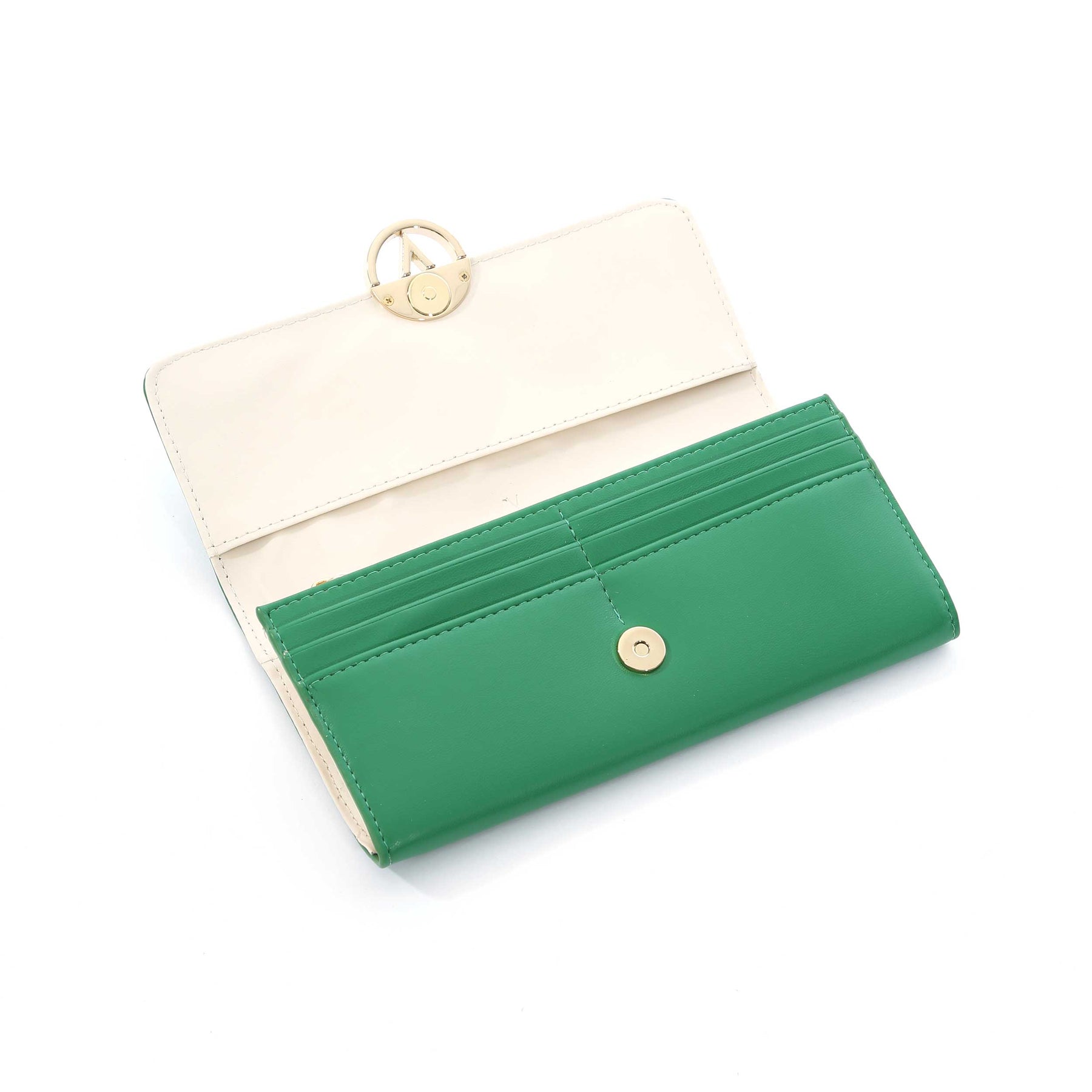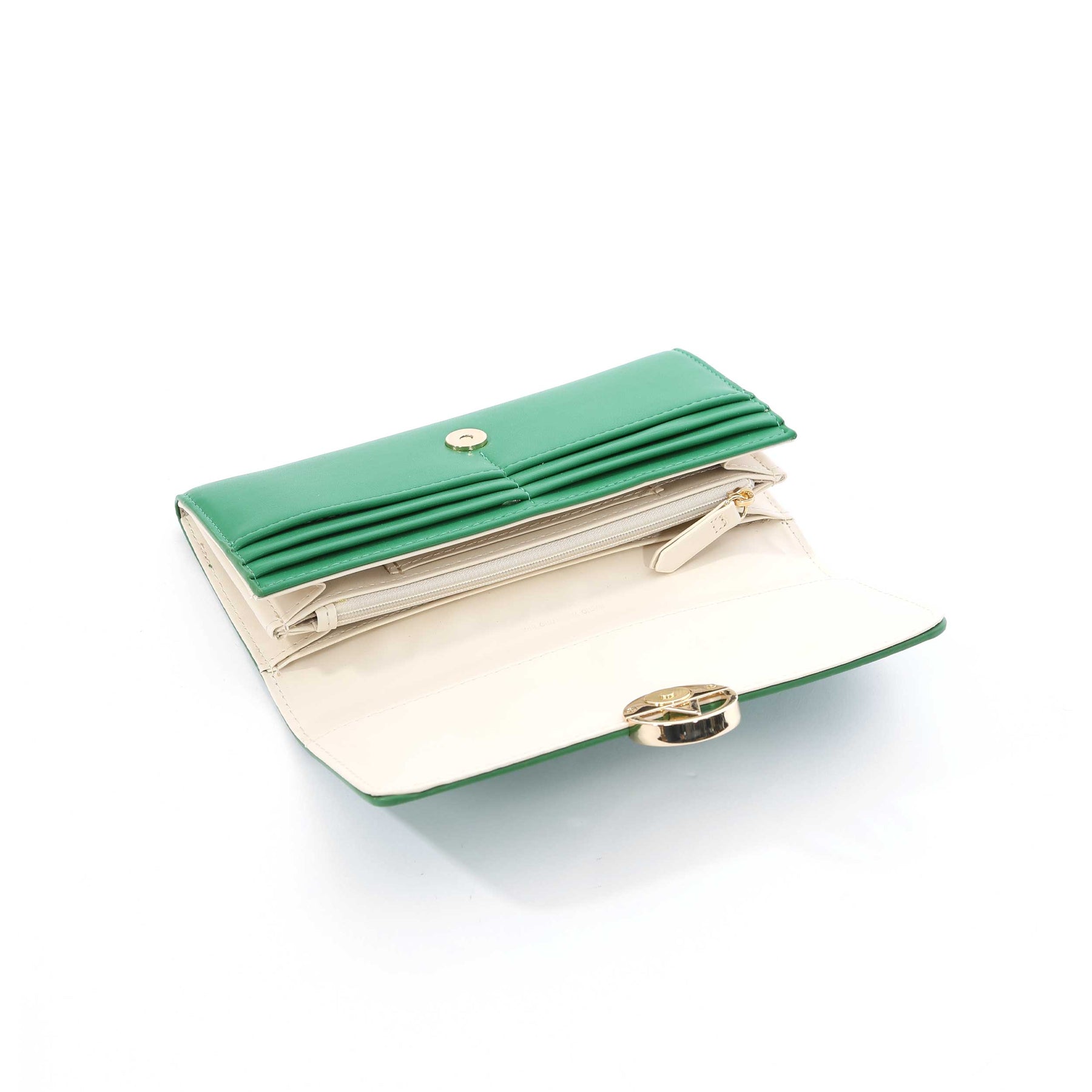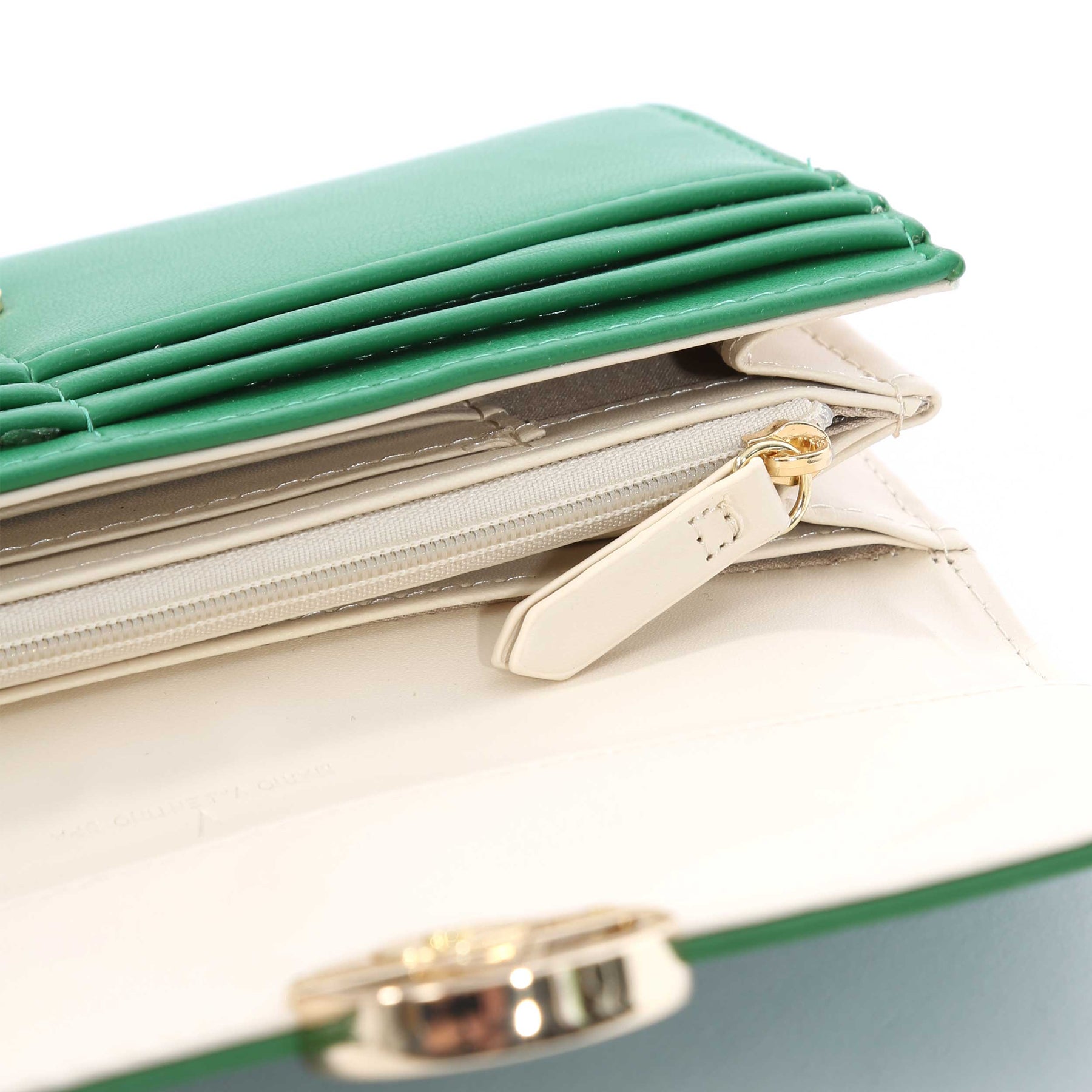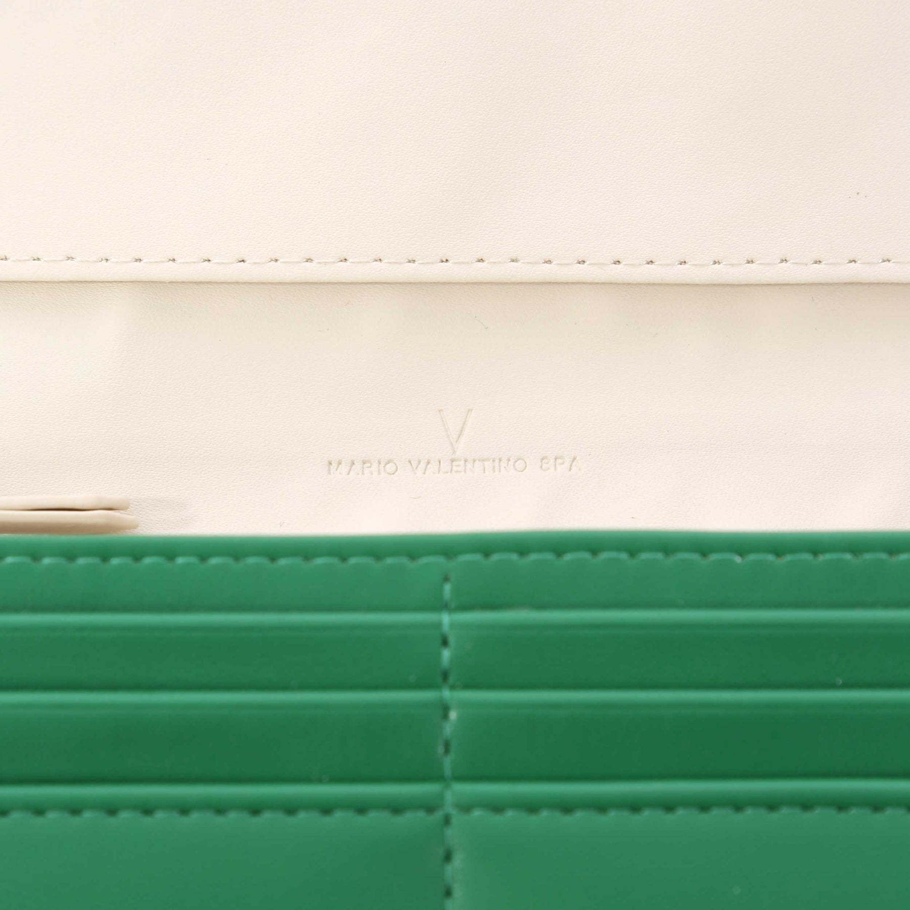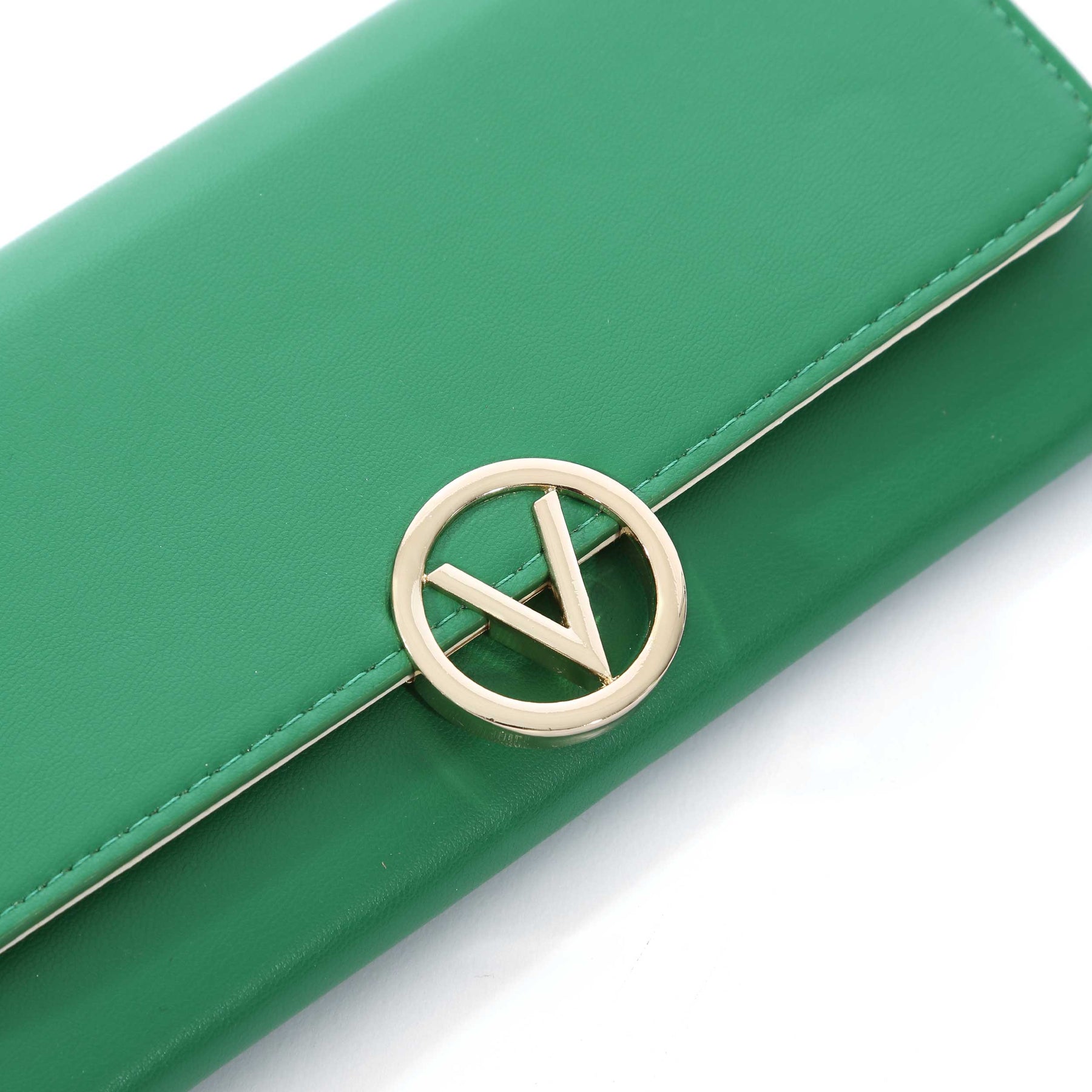 Valentino Bags July RE Ladies Purse in Green. Purse by Valentino by Mario Valentino. This ladies purse arrives in a plain PU leather design. It arrives with magnetic fastening and a signature Valentino V branding badge to the front. Zip compartment with multiple card slots and pockets for notes and coins.