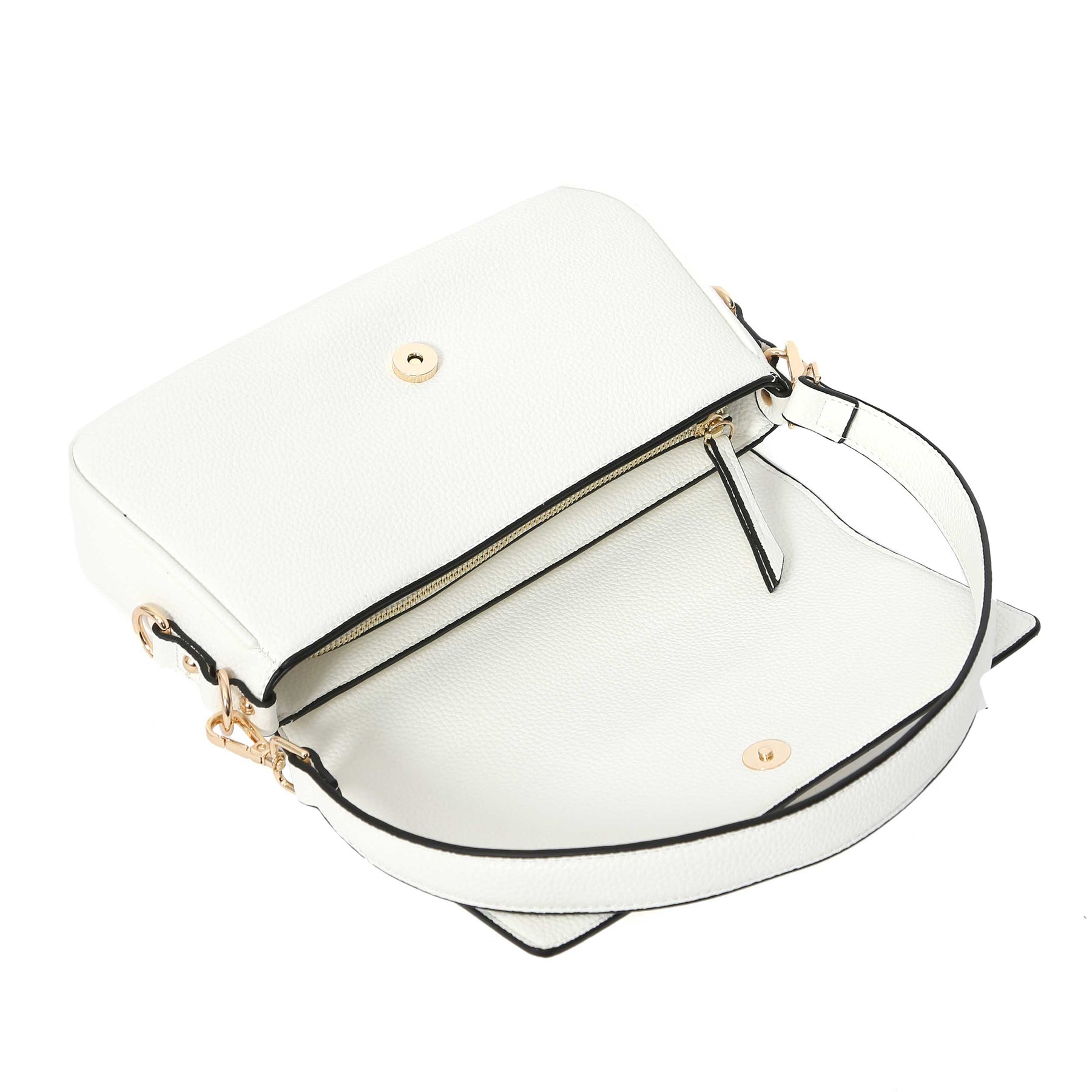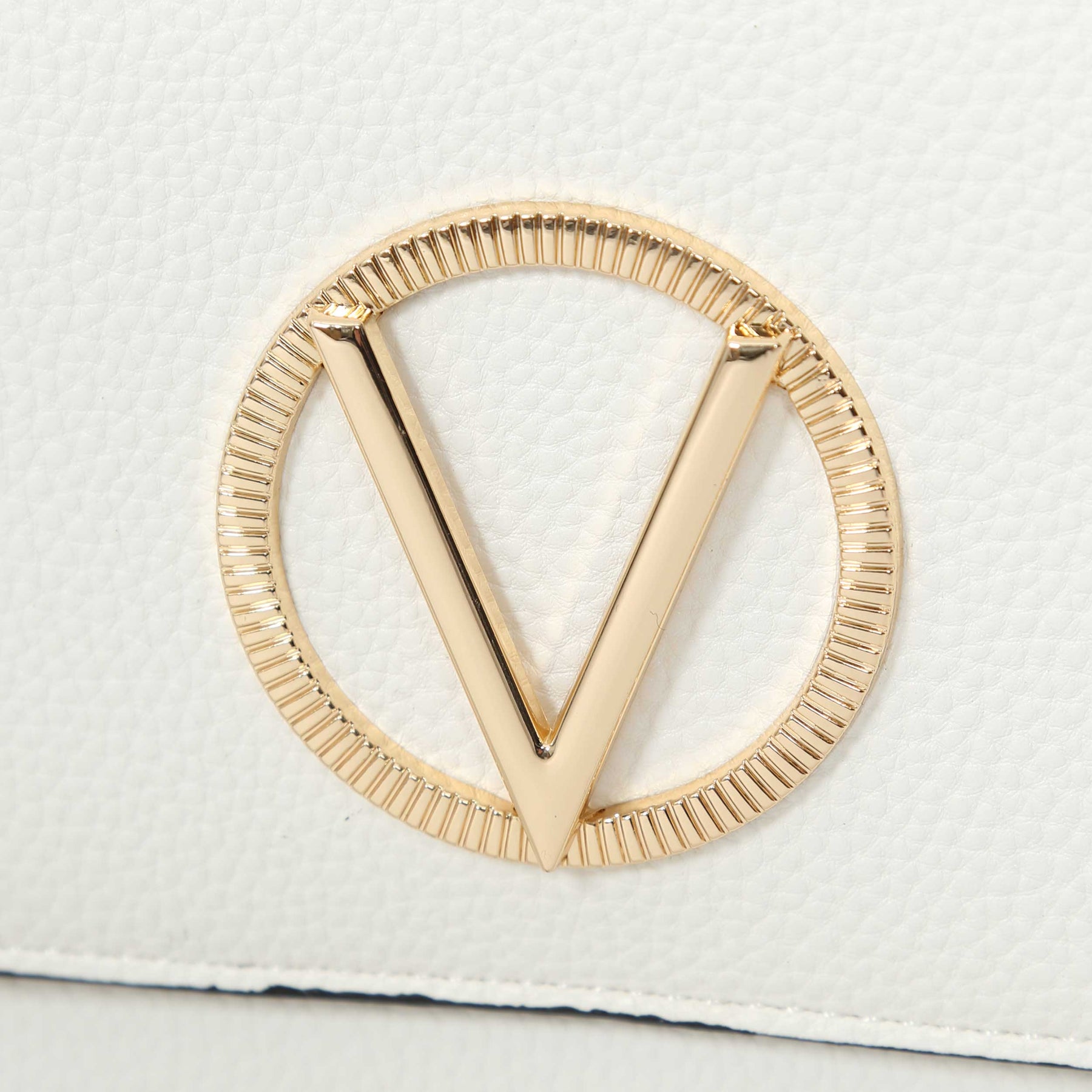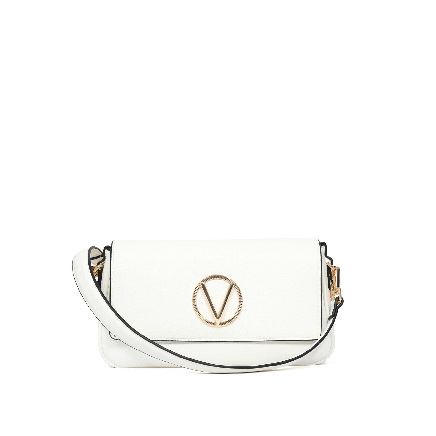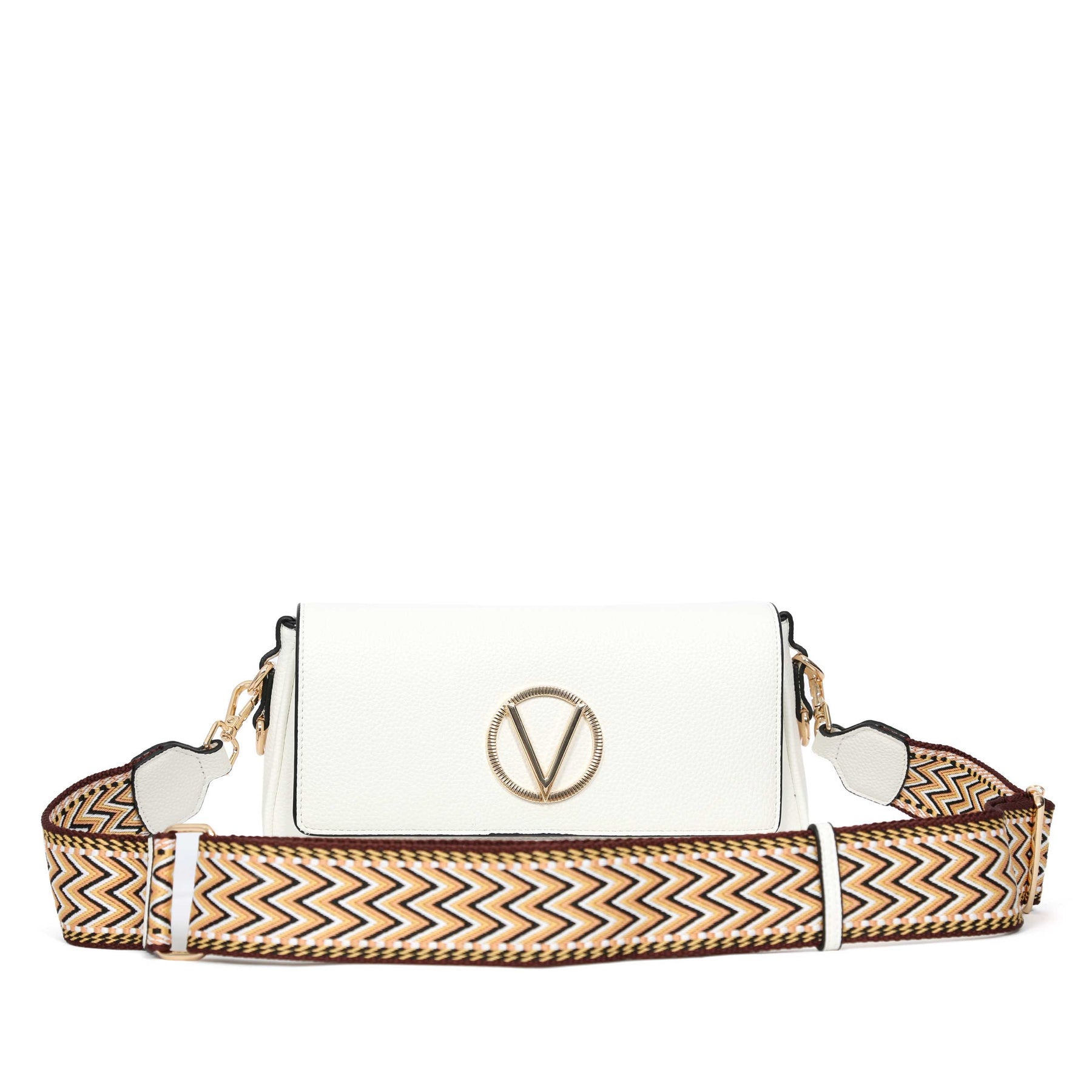 Valentino Bags Katong Ladies Shoulder Bag in White. A classic style hand bag by Valentino Bags. Fold over front with magnetic fastening. Detachable leather shoulder strap as well as a detachable contrasting chevron design strap and leather carry handle. Zip fastening with branded Valentino zip. Finished with a Valentino logo and gold hardware.
